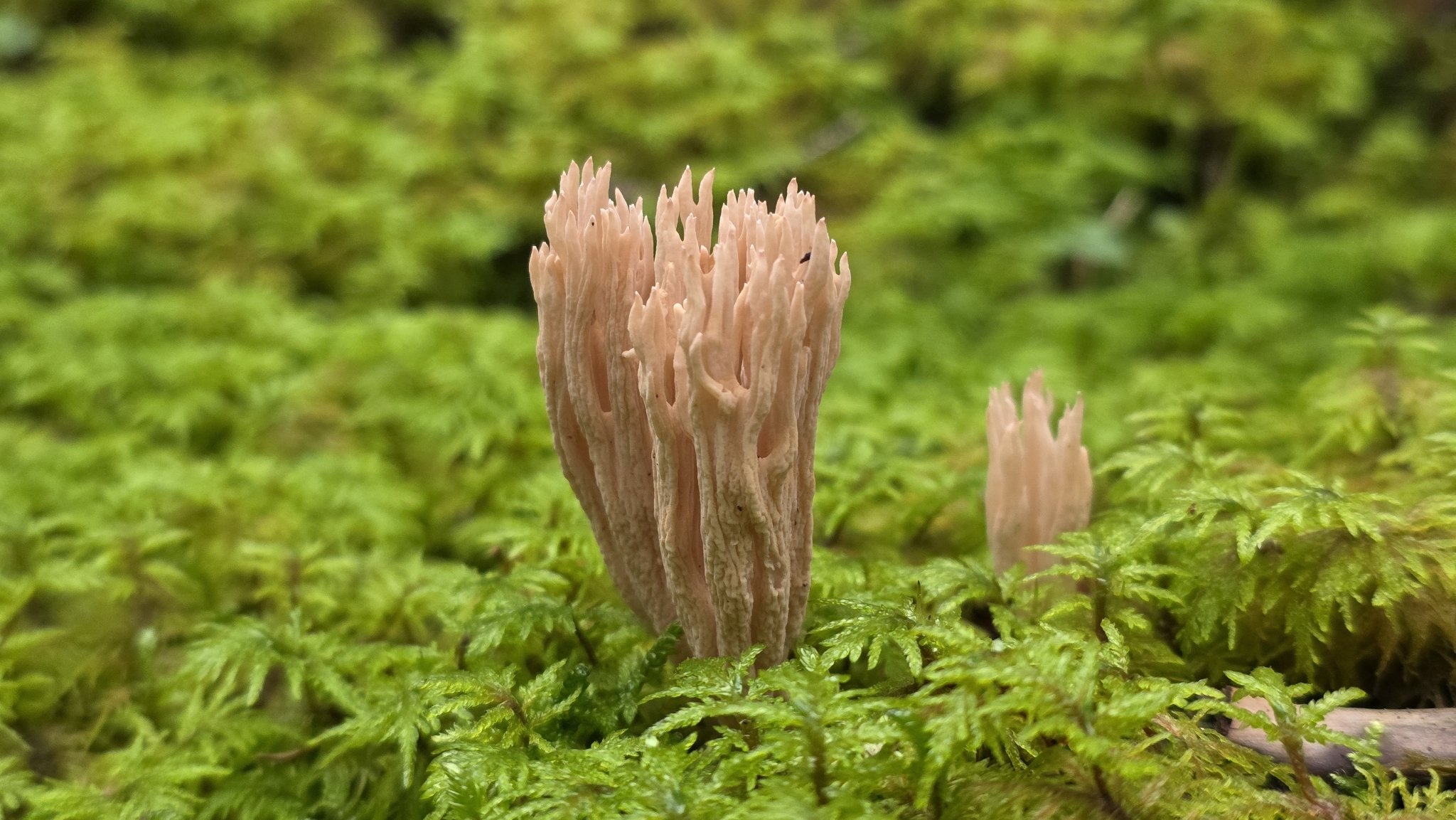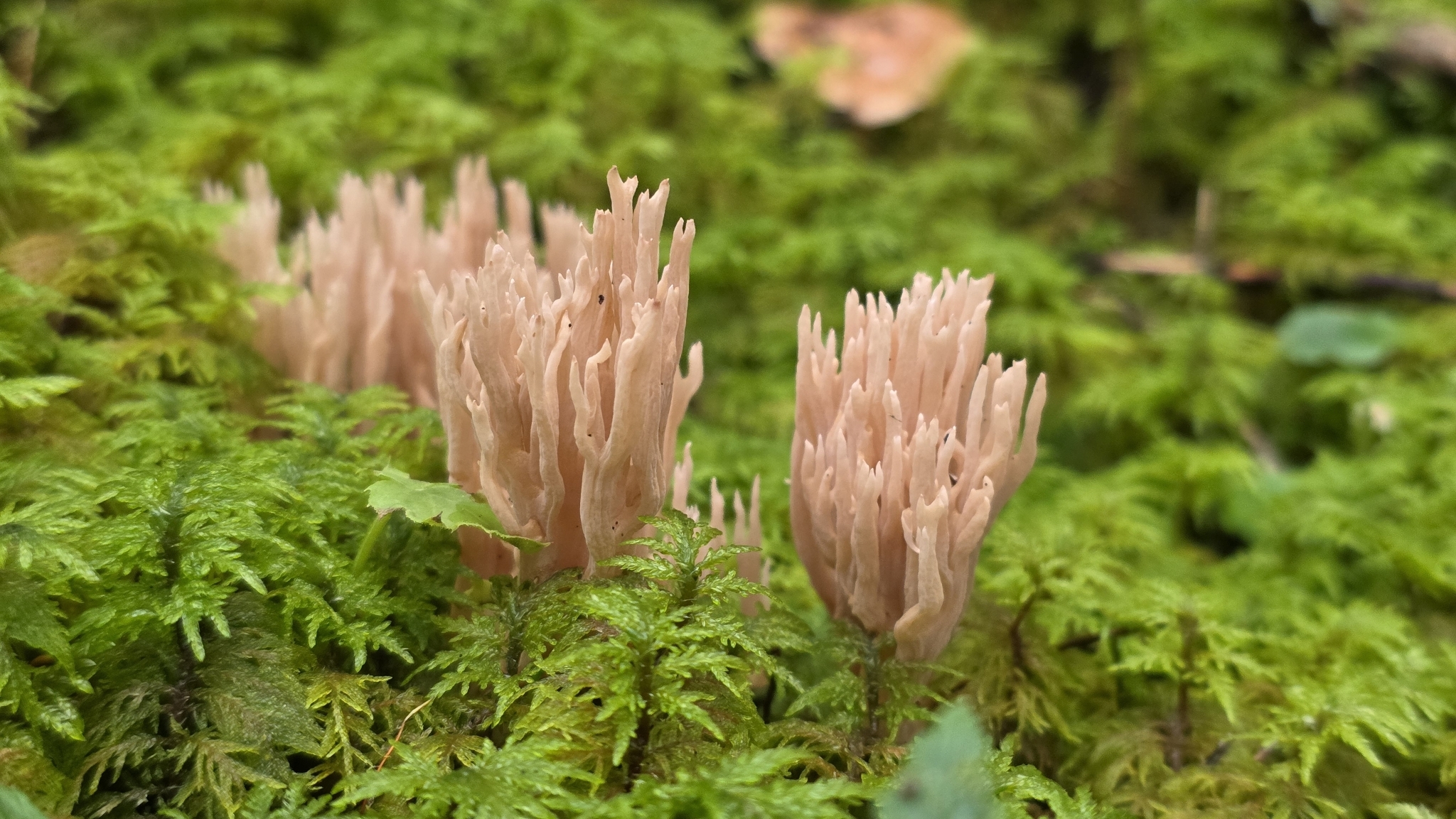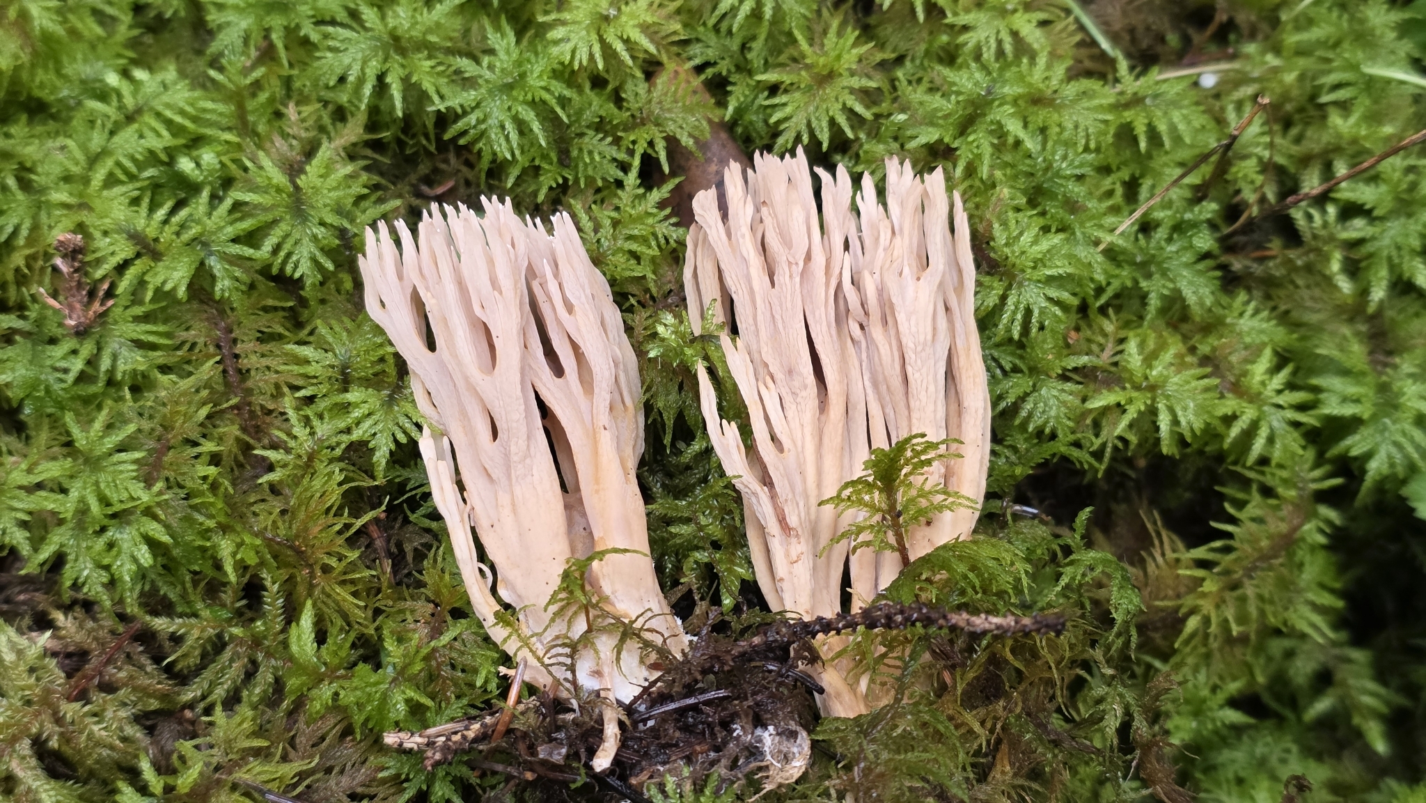 Fruchtkörper: fleischfarben, dann ausblassend zu ledergelb, zäh, Äste aufrecht, locker, biegsam, kantig und nach oben Verdickt, fast rechtwinklig abstehende spitze Ästchen