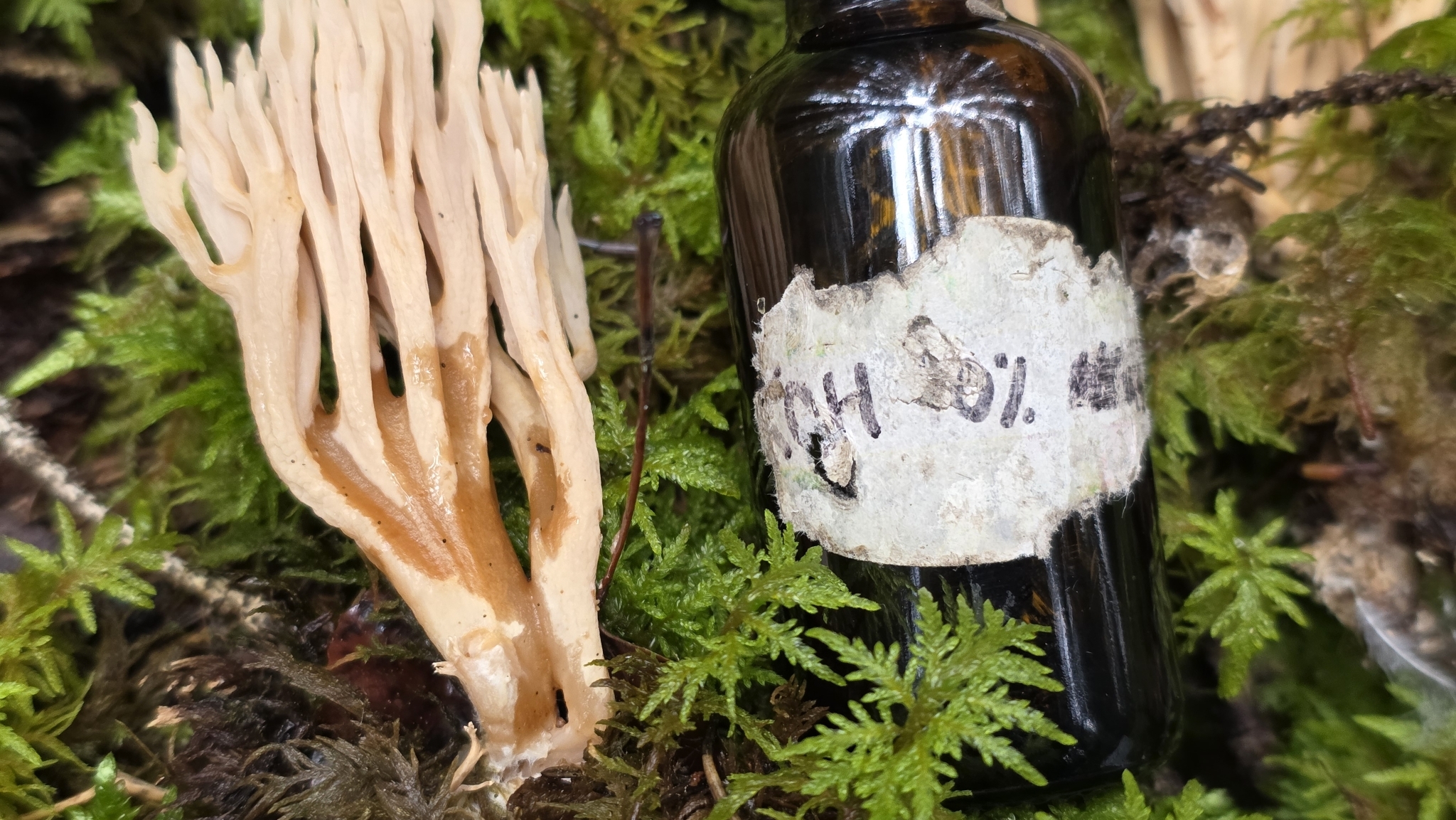 Sporokarpe bis zu 70 mm hoch, meist mehr oder weniger gestielt, aber oft von der Basis verzweigt, allgemein spindelförmig im Umriss. Rhizomorphen weiß, schlank, zerbrechlich, werden beim Trocknen mit KOH blass zitronengelb. Stiel bis zu 20 mm lang, bis zu 8 mm im Durchmesser, matt blass ockerfarben in der Jugend, dunkler im reifen Zustand. Zweige blass ocker bis rosa ocker, wenn frisch. Spitzen etwas kräftig, spitz, weiß in der Jugend, blass rosa-bräunlich im reifen Zustand. Geruch schwach würzig oder duftend. Geschmack mild scharf oder bitter. Fleisch des Stiels positiv für ETOH, KOH, GUA, ANO, negativ für ANW, PHL, FSW. Hyphen der Rhizomorphen monomitisch, 1,5-3,7 µm im Durchmesser, dünnwandig, hyalin, meist mit kristallinem Material überzogen, aufgeblähte Klammerverbindungen bis zu 15 µm breit, breit eiförmig bis zwiebelförmig, etwas dickwandig, unornamentiert bis selten und spärlich ornamentiert. Basidien 45-70 x 7,6-8,7 µm, keulig, 4-sporig. Sterigmata lang, schlank, gebogen. Klammerverbindungen vorhanden. Sporen schmal rhomboidal bis zylindrisch, 8,1-10,4 x 3,7-5,2 µm, dünnwandig, mit Ornamentierung aus groben, cyanophilen, mäandernden Graten und verstreuten Warzen.
