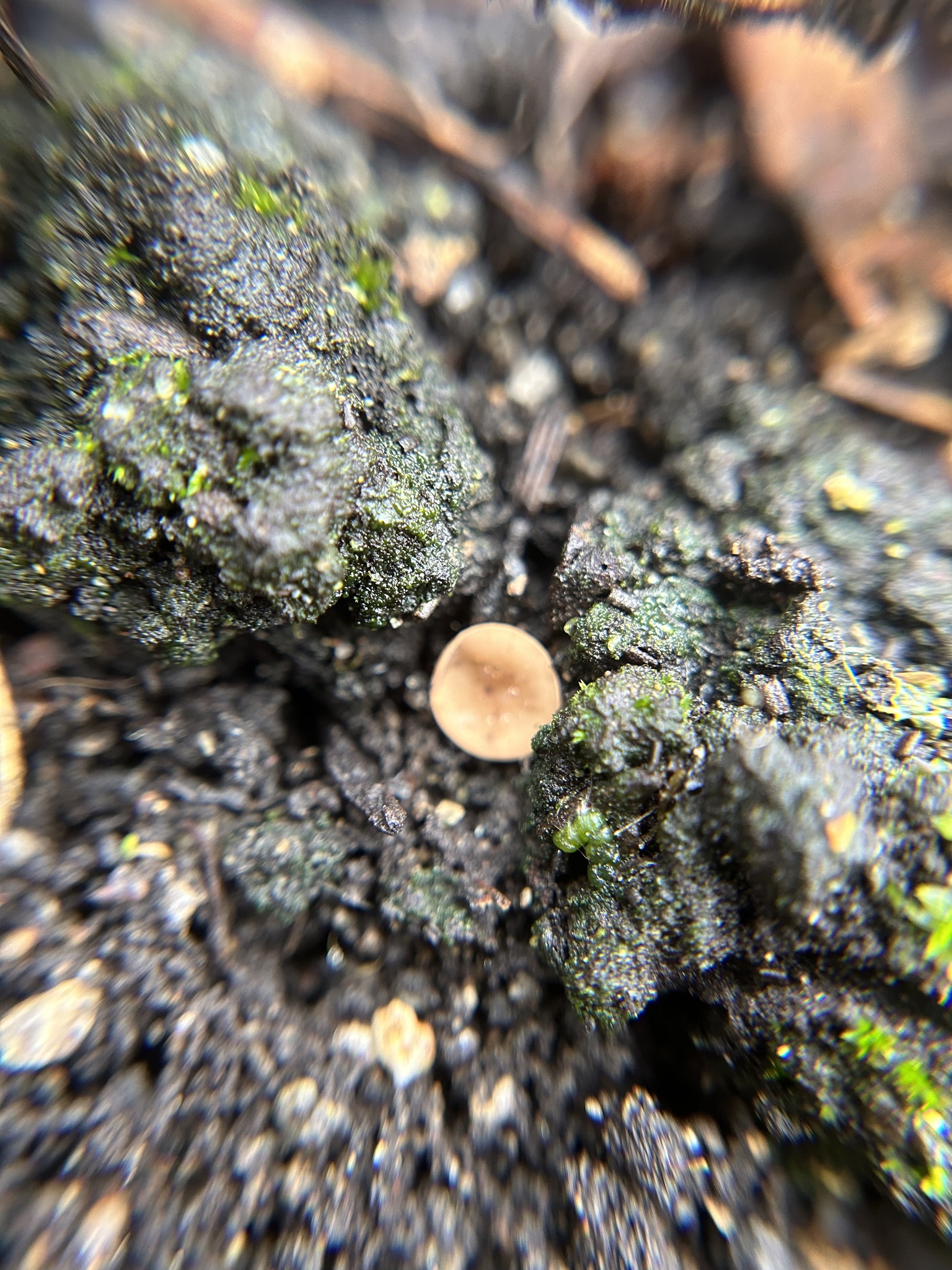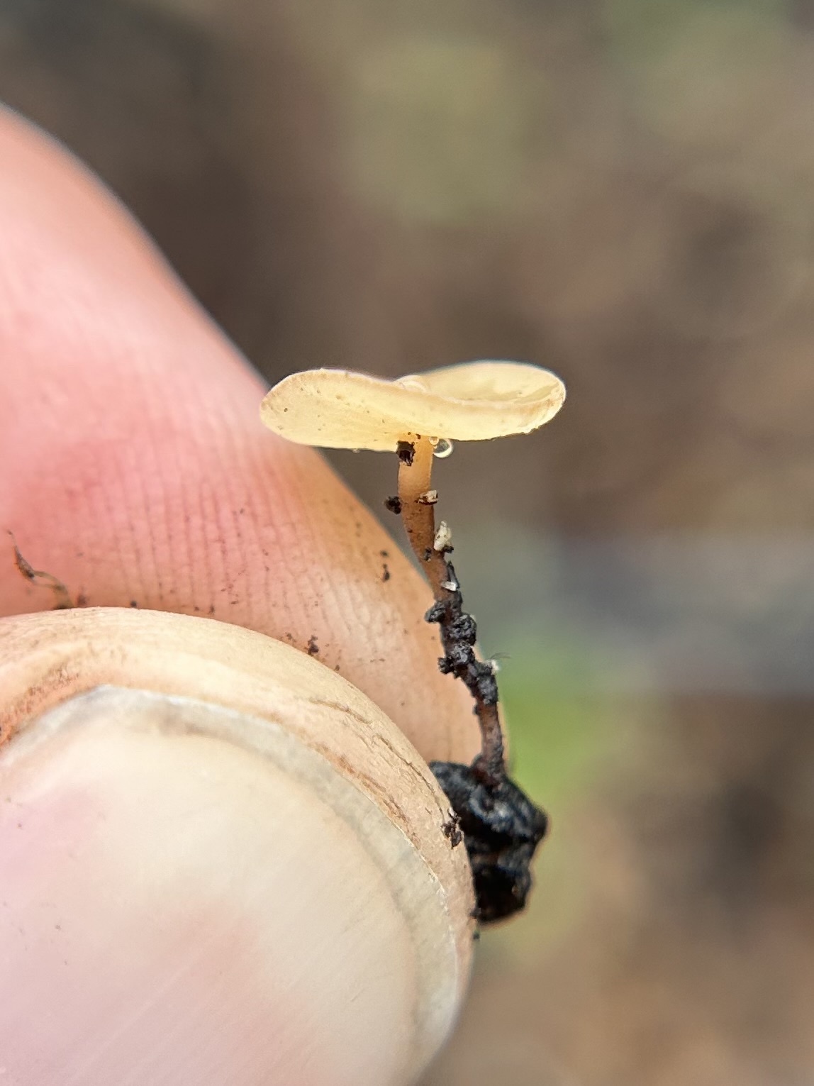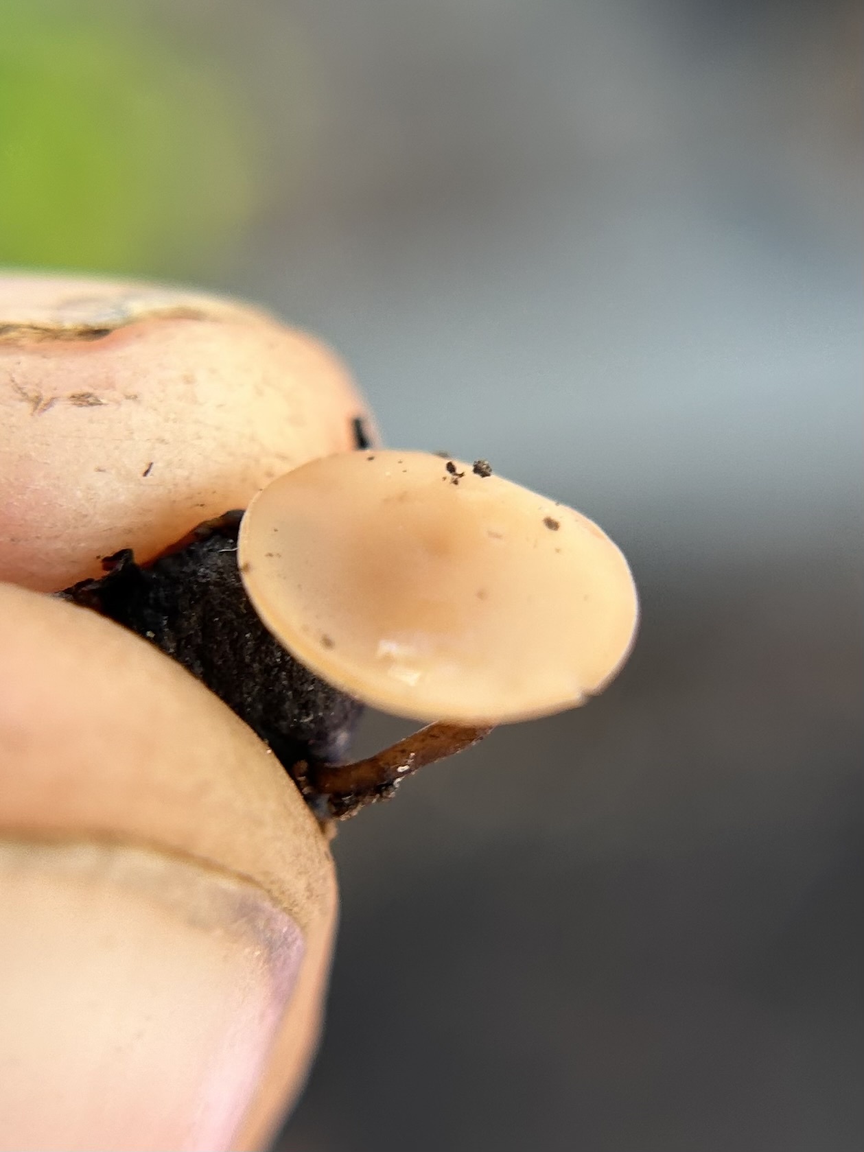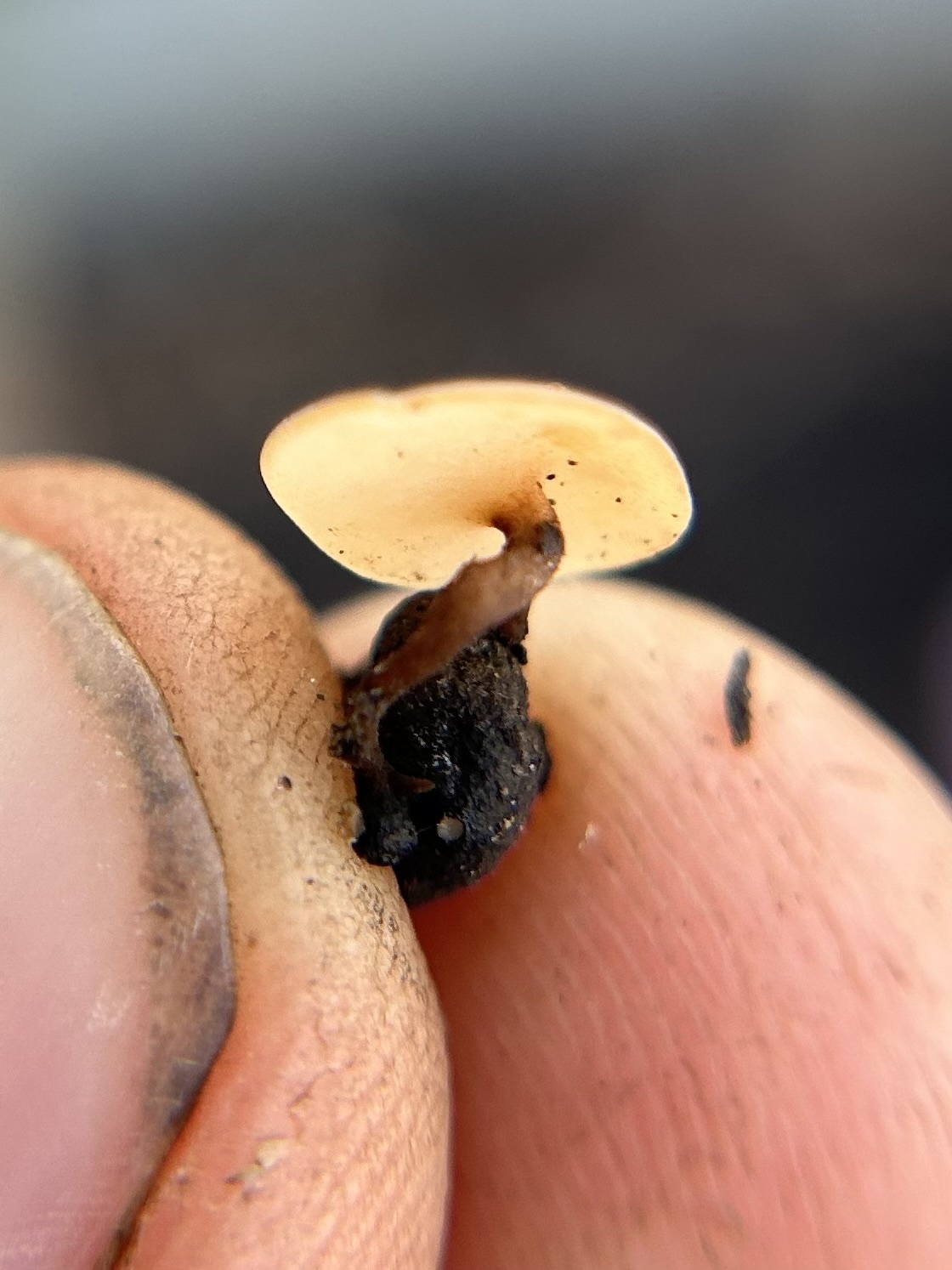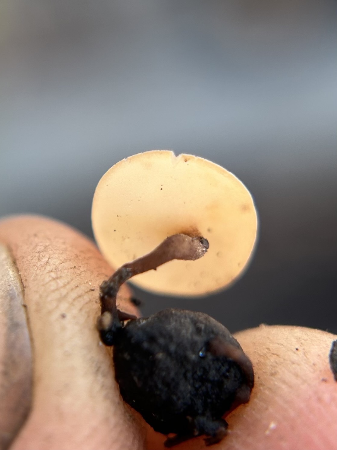 Fruchtkörper: Sclerotium von sehr verschiedener Grösse und Gestalt, oben flach gewölbt, unten abgeflacht, glatt, gefurcht oder höckerig, manchmal langgestreckt, 1—20 mm lang, 3—4 mm breit, manchmal ausgebreitet bis 3 cm lang und breit, aussen mattschwarz, innen weiss. Fruchtkörper je nach der Grösse des Sclerotiums in verschiedener Zahl aus diesem entspringend (bis 20), gestielt. Stiel von verschiedener Länge, in den Becher übergehend, dünn, bis 1 mm breit, hellbraun. Becher anfangs fast keulenförmig, später trichterförmig, zuletzt flach, 3 bis 10 mm breit, ocker- oder lehmfarben. Scheibe wenig dunkler.