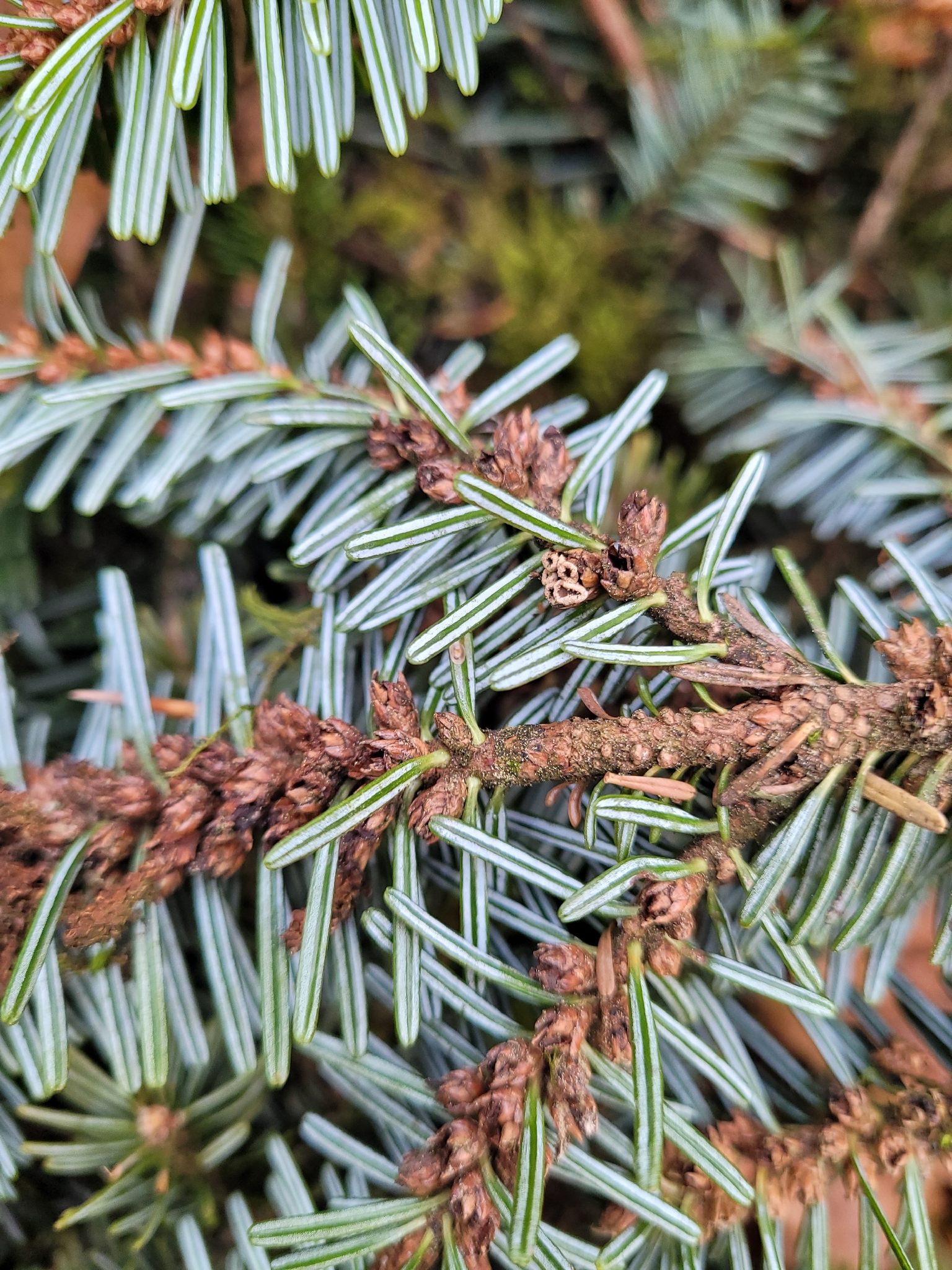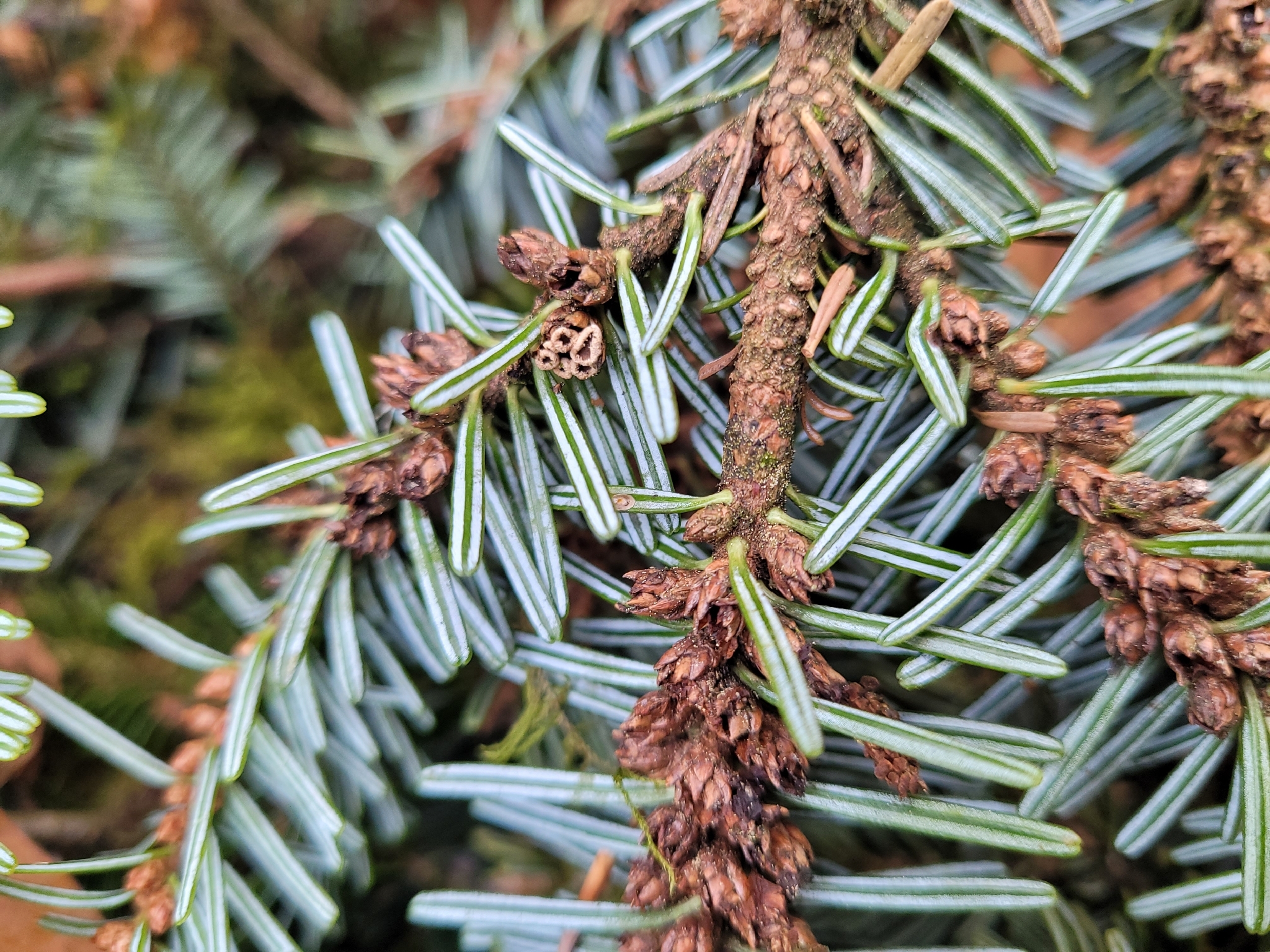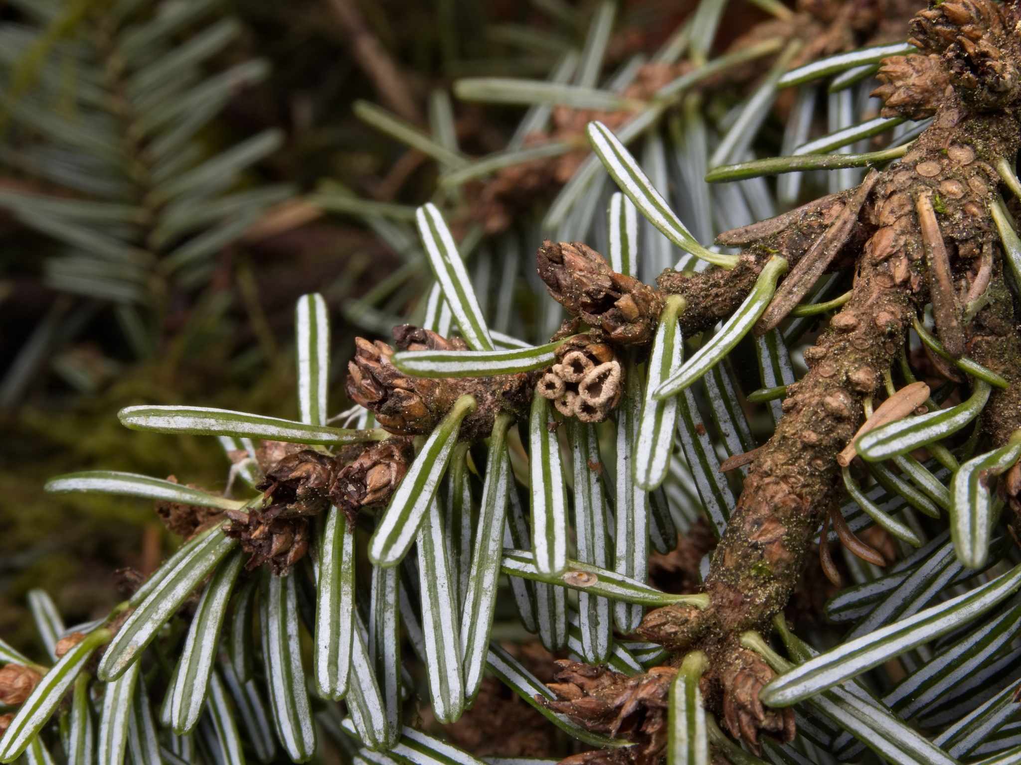 Vorkommen: An Ästchen von Weiß-Tanne (Abies alba) oder Weißtanne zwischen den abgestorbenen Hüllblättern männlicher Blüten