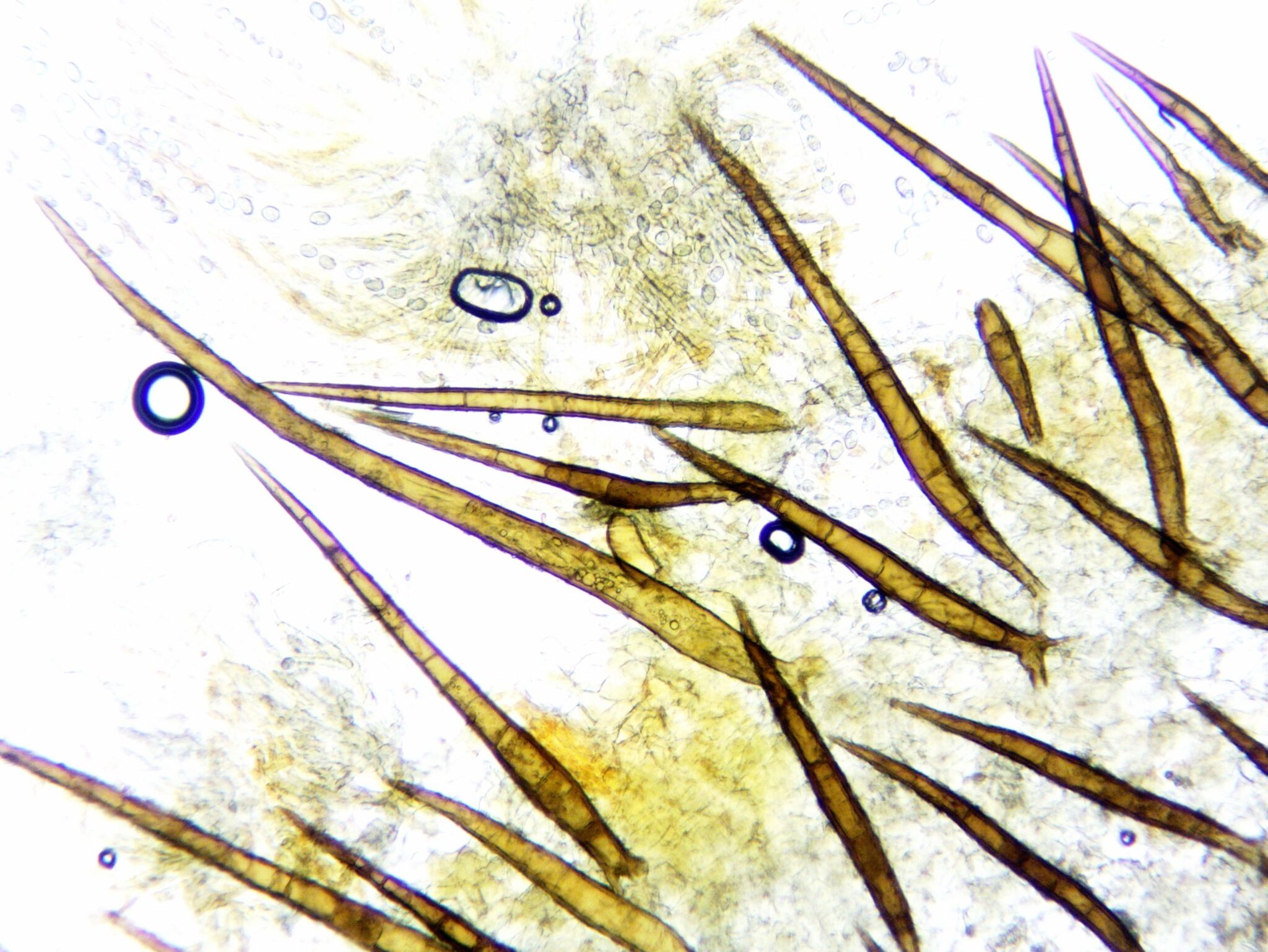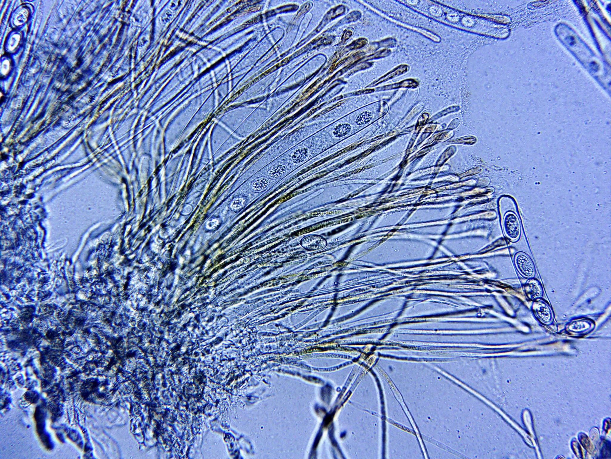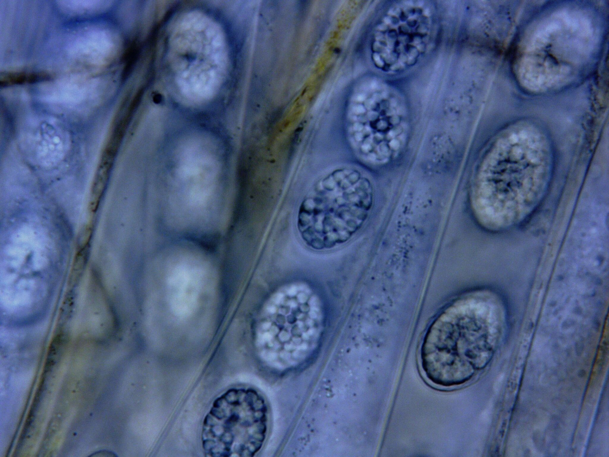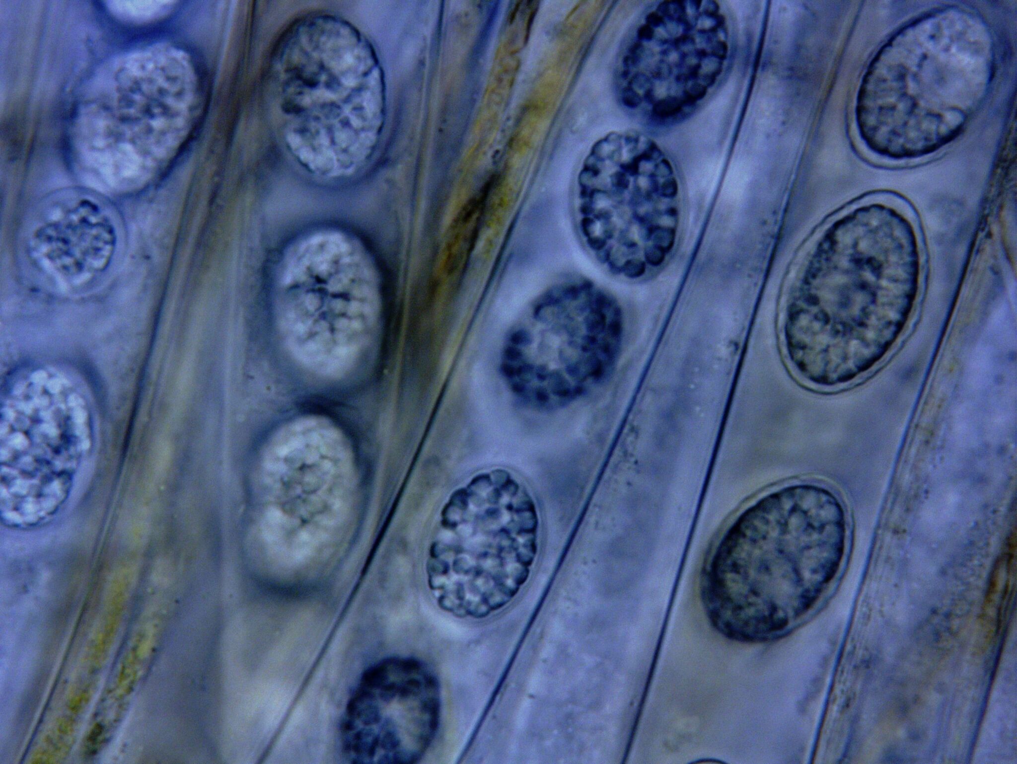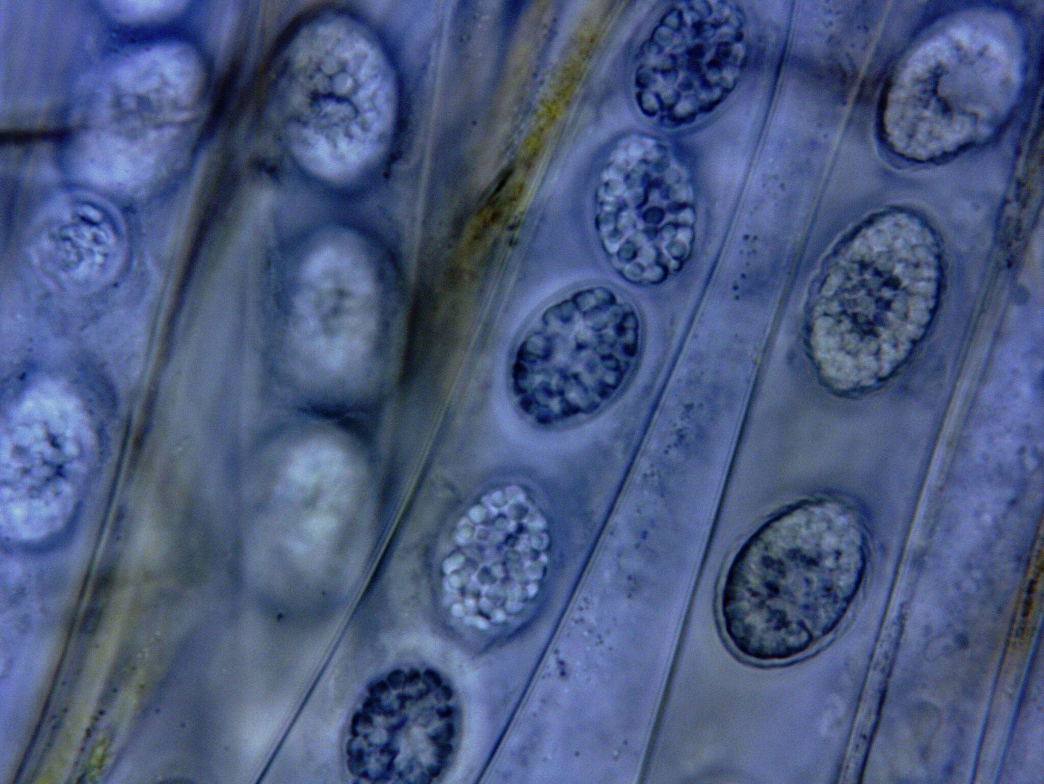 Sporen: Schläuche zylindrisch, oben abgerundet, ca. 250—350 µm lang, 18—20 µm breit, achtsporig. Sporen elliptisch abgerundet, mehr oder Aveniger warzig- rauh, einzellig, oft mit zwei Öltropfen, farblos, 18—24 µm lang, 12 — 15 µm breit, einreihig liegend. Paraphysen fädig, septiert, 3 µm , oben bis 9 µm breit und voll gelblicher Öltröpfchen.