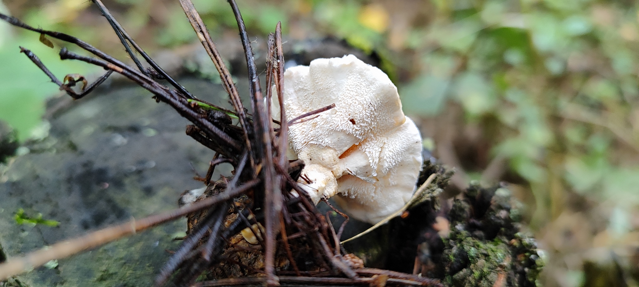 Fruchtkörper: weiss, mit fleischigem, unregelmässigen, horizontalen, zottigen Hute, fast exzentrischem, deutlich erkennbarem Stiel, Lamellen bzw. Stacheln gebogen, verschieden gestaltet. Die einzelnen Fruchtkörper sind meist miteinander verwachsen. Der Stiel µmst manchmal fast fehlend.