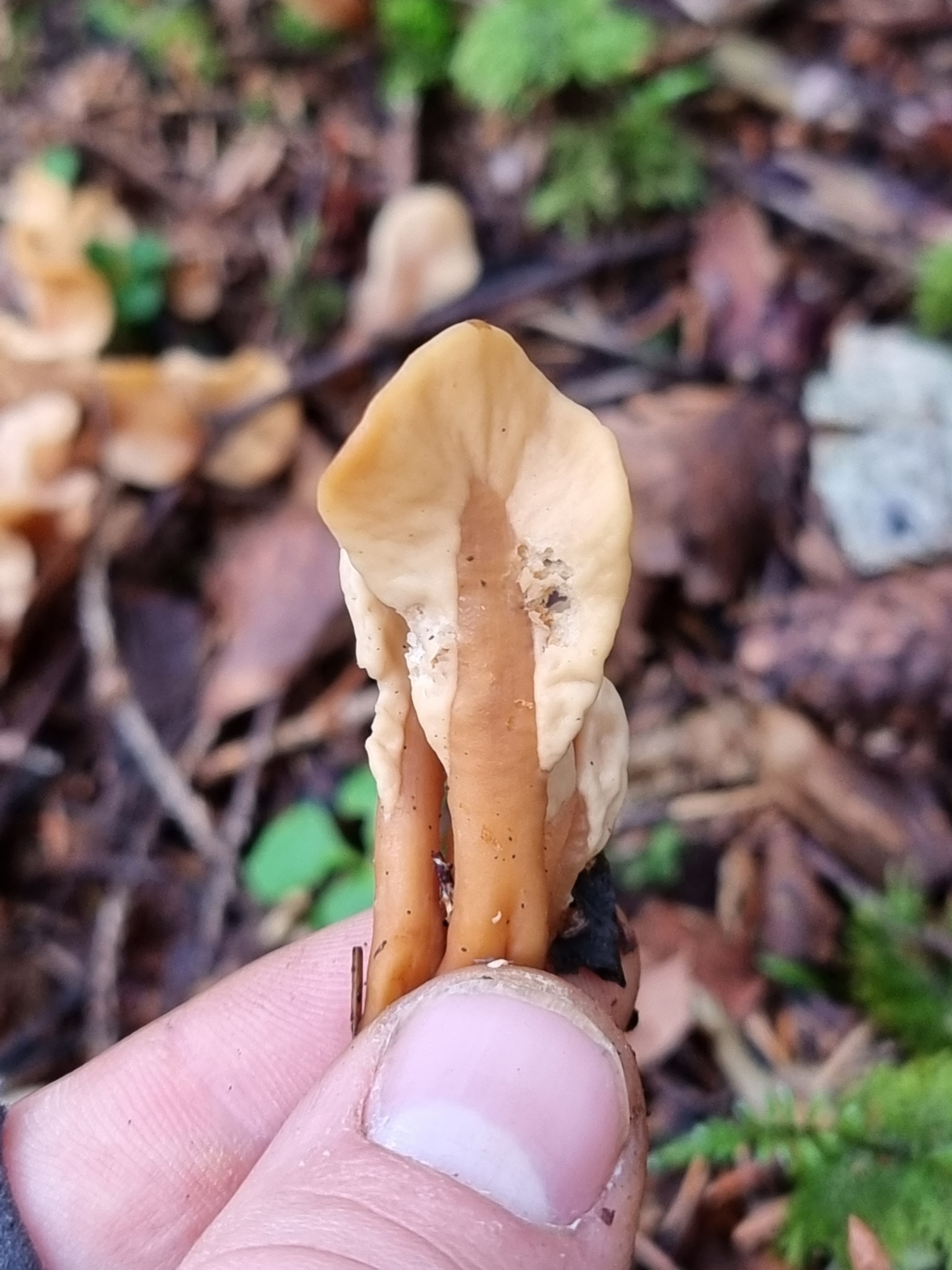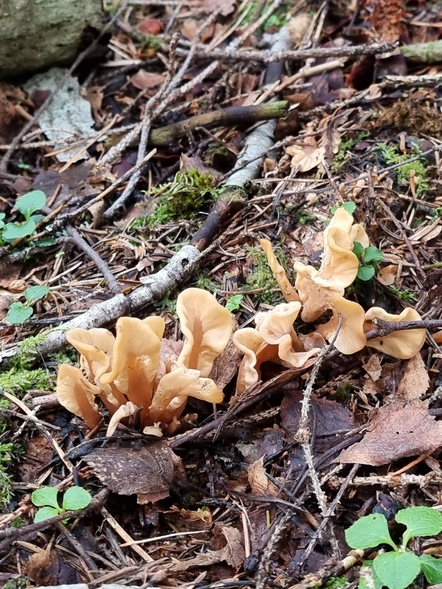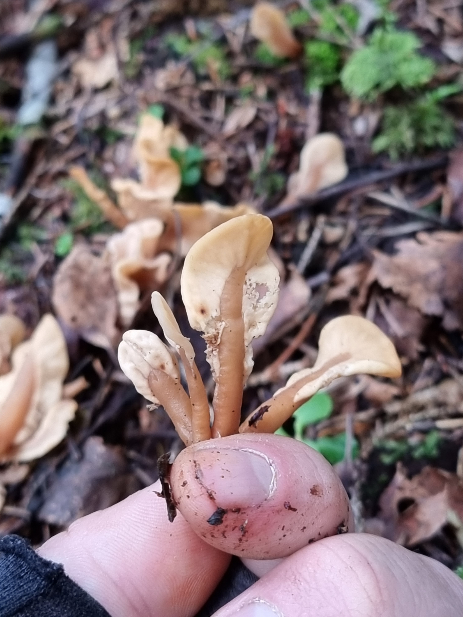 Fruchtkörper: Fruchtkörper gesellig, einfach, aufrecht, gestielt, 1,5—2 cm hoch, mit meist spateiförmiger oder rundlich- eiförmiger, platt zusammengedrückter, beiderseits etwas vom Stiel herablaufender, glatter oder runzeliger, wellig berandeter, blass lederfarbiger oder schmutzig ockergelber Fruchtschicht, 1—1,5 cm breit, fleischig. Stiel gerade, glatt, cjlindrisch oder zusammengedrückt, später runzelig, 1—3 mm breit, gelbbräunlich oder dottergelb.