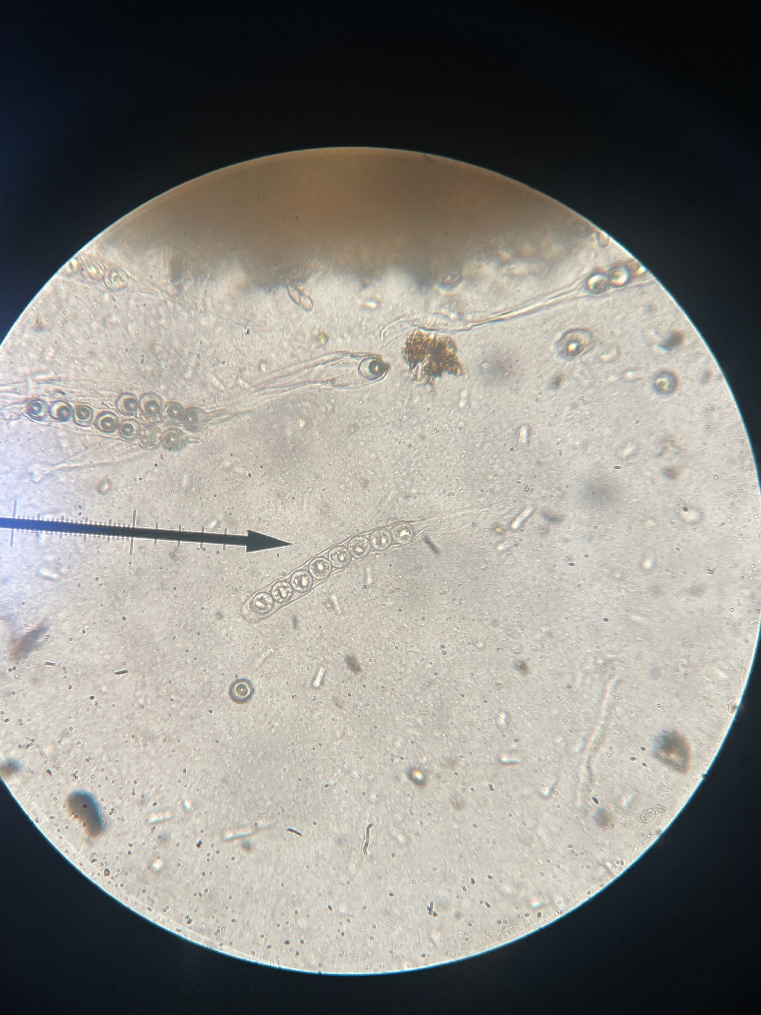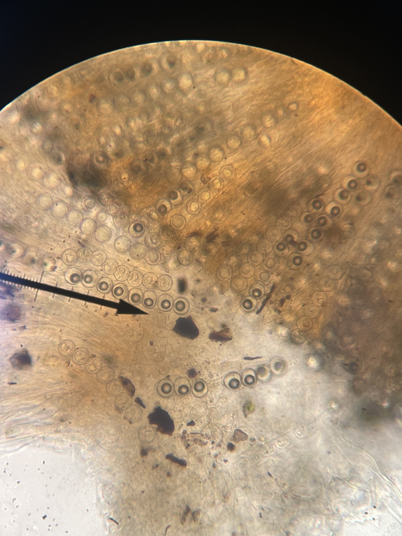 Sporen: Schläuche zylindrisch, oben abgerundet, 200—250 µm lang, 18 bis 21 µm breit, achtsporig. Sporen elliptisch, stumpf, glatt, einzellig mit einem grossen, centralen Öltropfen, farblos, 20—24 µm lang, 12—14 µm breit, einreihig liegend. Paraphysen fädig, septiert, oben allmählich bis 9 µm breit, farblos.