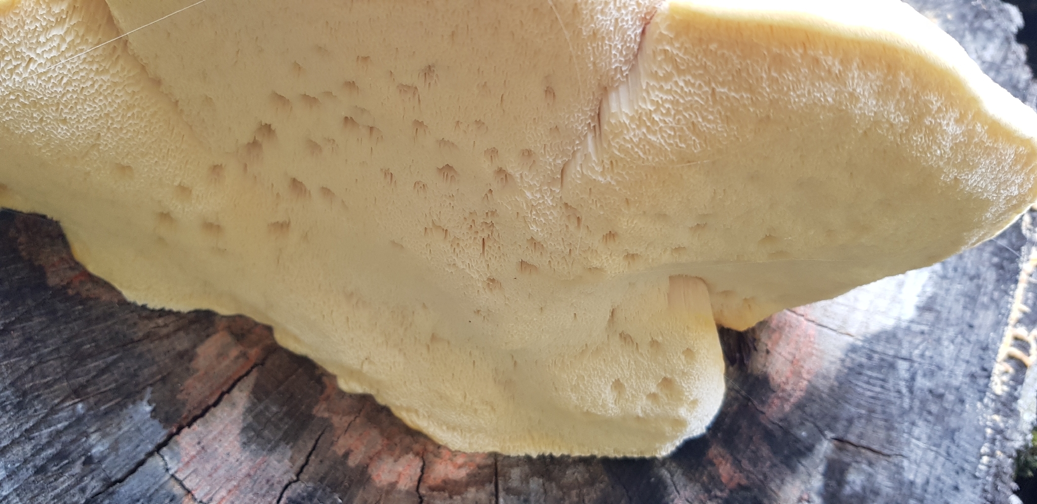 Inneres, Innenmasse: Röhren etwa 1 cm lang, weiss, später bräunlich, Mündungen fein, rundlich, ganzrandig. Fleisch beim Durchschneiden zuerst rötlich, dann violett, zuletzt bräunlich werdend, geschichtet.