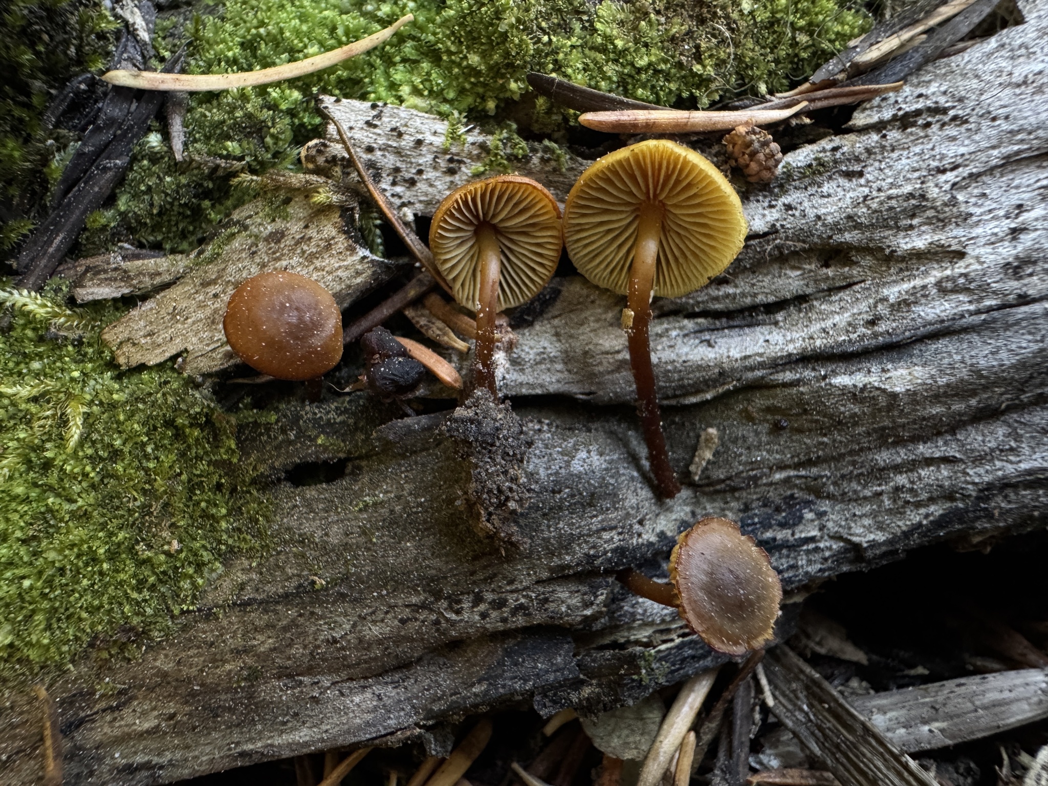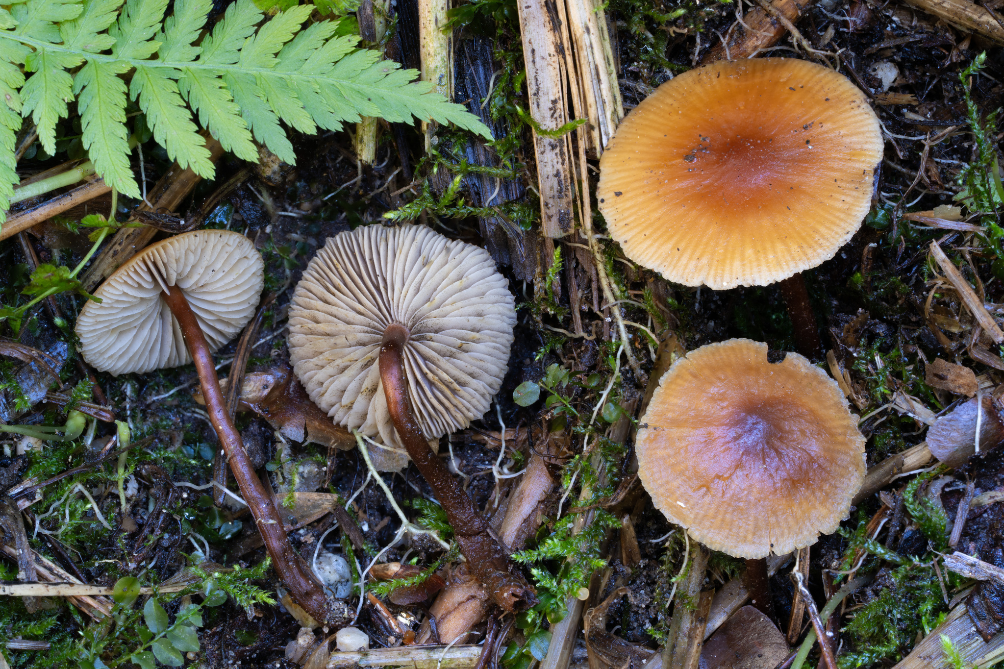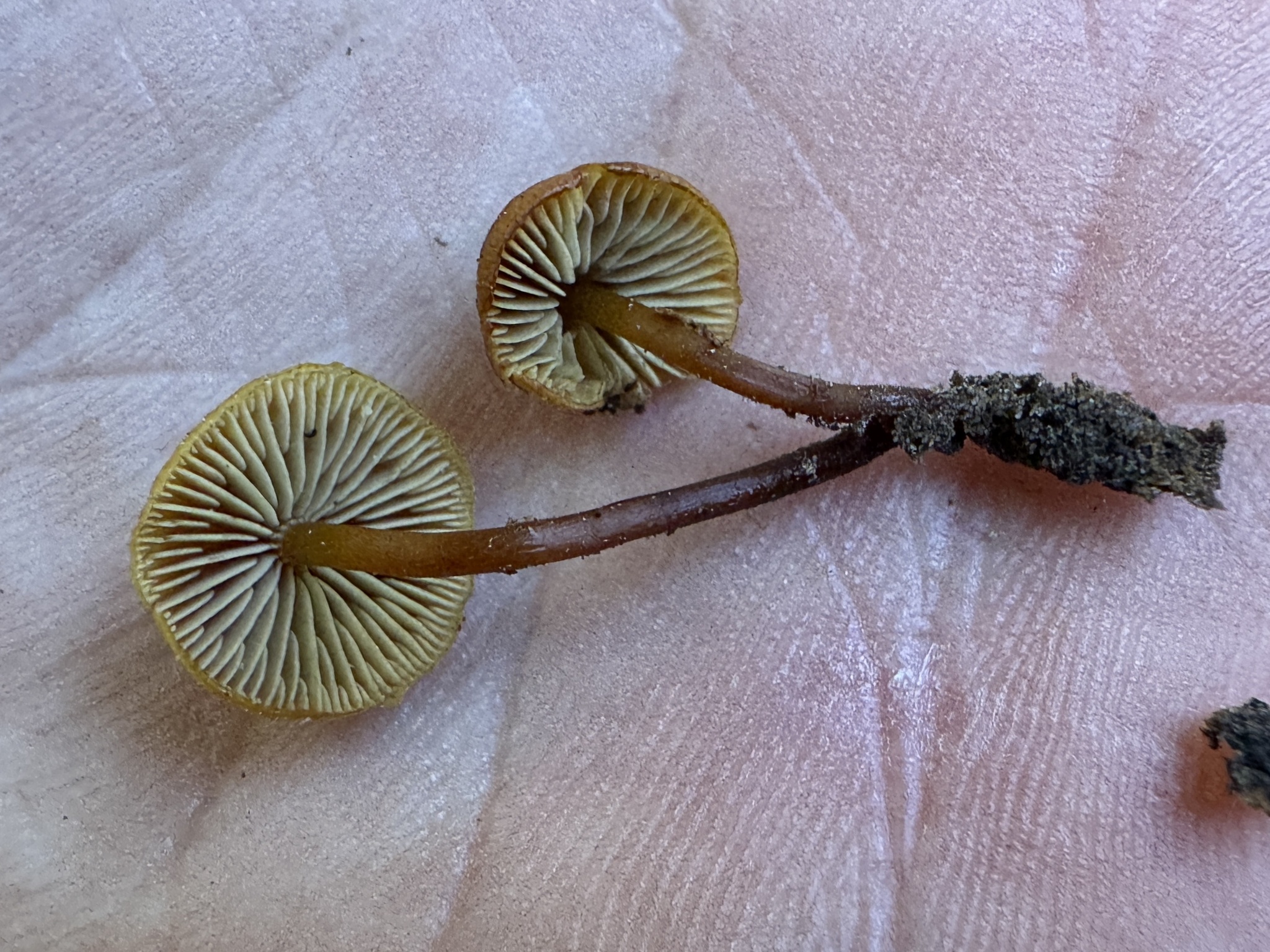 Hut 4-25 mm im Durchmesser, glockenförmig bis gewölbt mit kleinem breiten Buckel, am Rand durchscheinend gestreift, wenn feucht, seidig, wenn trocken, glatt, dunkler lohfarben über der Mitte, verblassend zu gelb-braun an den Rändern. Geruch nicht ausgeprägt. Geschmack leicht bis intensiv bitter. Lamellen schmal angewachsen bis ablösend, dicht bis gedrängt, Ränder gleichmäßig bis fein erodiert, gelb-oliv, blass olivgrau bis matt bernsteinfarben, zimtbraun im Alter. Stiel zentral bis leicht exzentrisch, 15-45 mm lang, 0,5-2 mm breit an der Spitze, glatt, blass gelb-braun an der Spitze, dunkelt zu rotbraun bis schwarz an der Basis, mit gelb-braunem Myzelfilz an der Basis. Pileipellis mit braunen, krustigen Pigmenten, eine dünne, gelatinisierte Ixocutis bestehend aus einer Suprapellis aus Hyphen (2-5 µm im Durchmesser) über einer Subpellis aus einer breiteren Schicht gelb-brauner, aufgeblähter Hyphen. Basidien 15-21 x 5 µm, keulig, hyalin bis blassgelb, 4-sporig. Pleurozystidien fehlen. Cheilozystidien 25-54 x 5-7 µm, zahlreich, zylindrisch bis schmal fusoid, manchmal gegabelt oder einmal septiert, dünnwandig, hyalin. Ölhaltige Hyphen fehlen. Klammerverbindungen vorhanden. Sporen ellipsoid bis leicht nierenförmig, 4,5-6 (-6,5) x 3-3,5 (-4) µm, glatt, subhyalin bis blassgelb, inamyloid, leicht dickwandig, cyanophil, Sporenpulver braun.