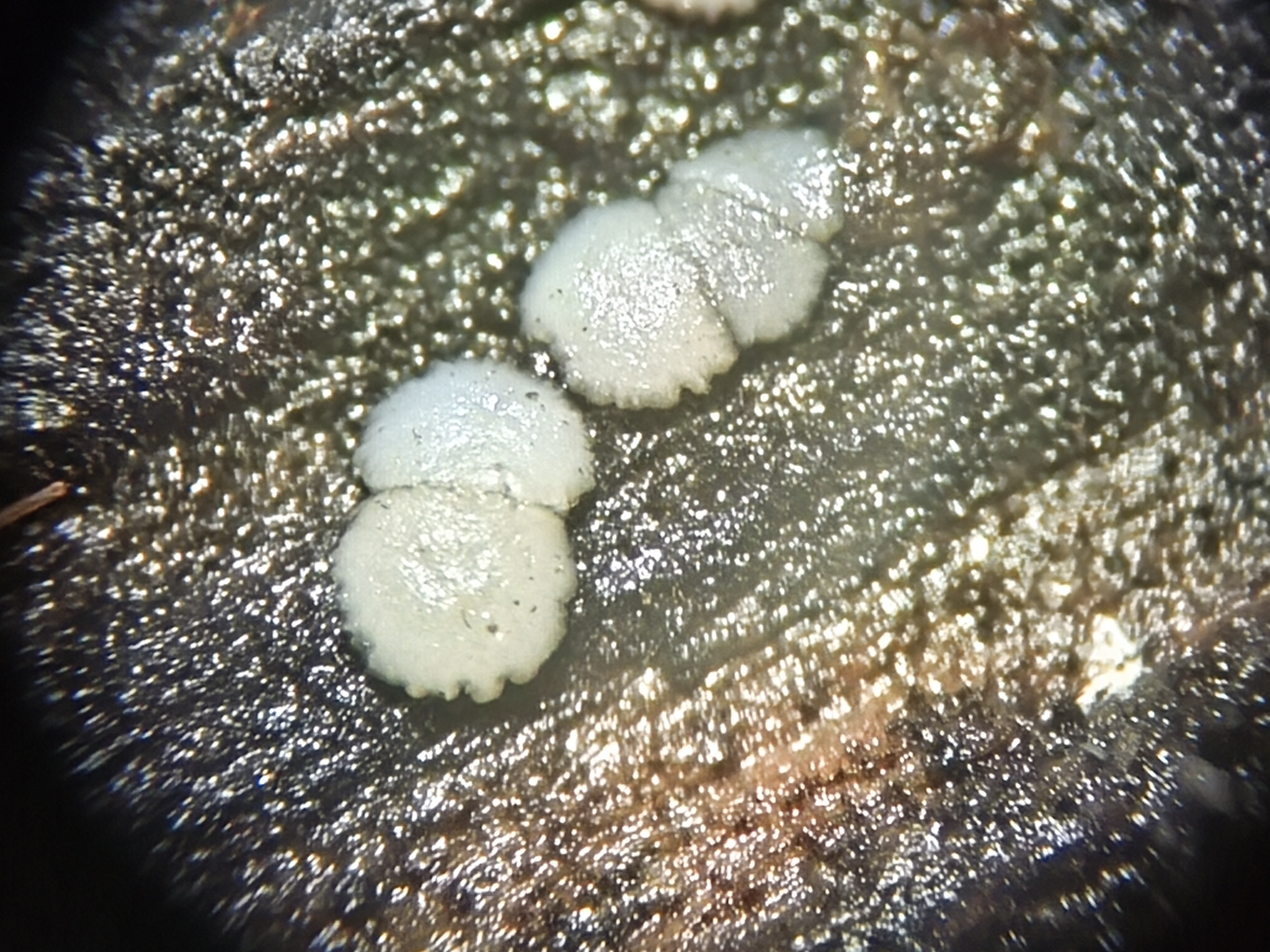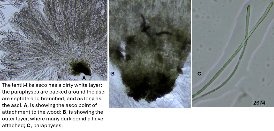 Fruchtkörper: Schlauchfrüchte gesellig, manchmal zu zwei bis drei verwachsend, aufsitzend, mit rundlicher, schmaler, brauner Basalmembran, frisch bläulich -milchweiss, trocken graulich oder olivengelbgrün, verkehrt kegelig, mit verschmälerter Basis aufsitzend, aussen unten bräunlich, 350 µm breit, 200—240 jU hoch. Rand dünn, etwas eingebogen. Gehäuse dünn, aus 2 µm breiten, parallelen Hyphen aufgebaut, innen farblos, aussen ungefärbt bis blass bräunlich, unten braun. Hypothecium undeutlich plektenchymatisch-kleinzellig, 60 µm dick, unten (25 µm) braun, oben (35 µm) farblos. Paraphysen dünnfädig (1,5 - 2 µm), sehr zahlreich, verklebt, oben kaum verdickt, die Schläuche etwas überragend.