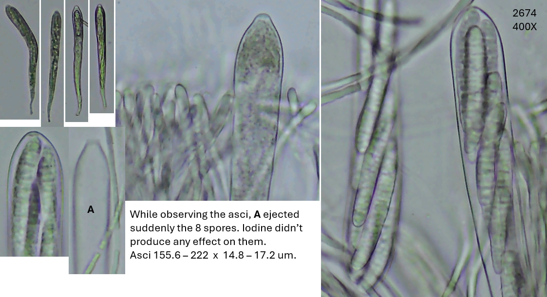 Sporen: Schläuche lockerstehend, keulig, oben breiter, ganz oben kegelig und an der Spitze 2 µm stark verdickt, ungestielt, 100—140 µm lang, 16—20 µm breit, achtsporig. Sporen zwei- bis dreireihig, anfänglich mit zarter Schleimhülle, farblos, länglich- zylindrisch, meist in der Mitte am dicksten, an den Enden verschmälert und stumpflich, durch Querwände meist in acht, seltener bis zehn meist gleich lange Zellen geteilt, 40—51 µm lang, 4—6, selten bis 8 µm breit. Jod färbt die Sporen, sowie stellenweise das Gehäuse blau.