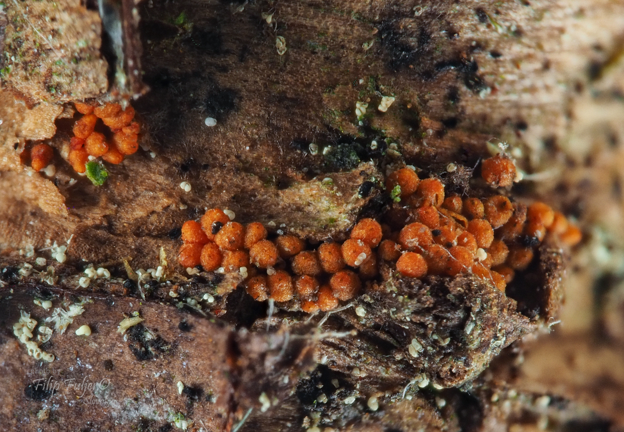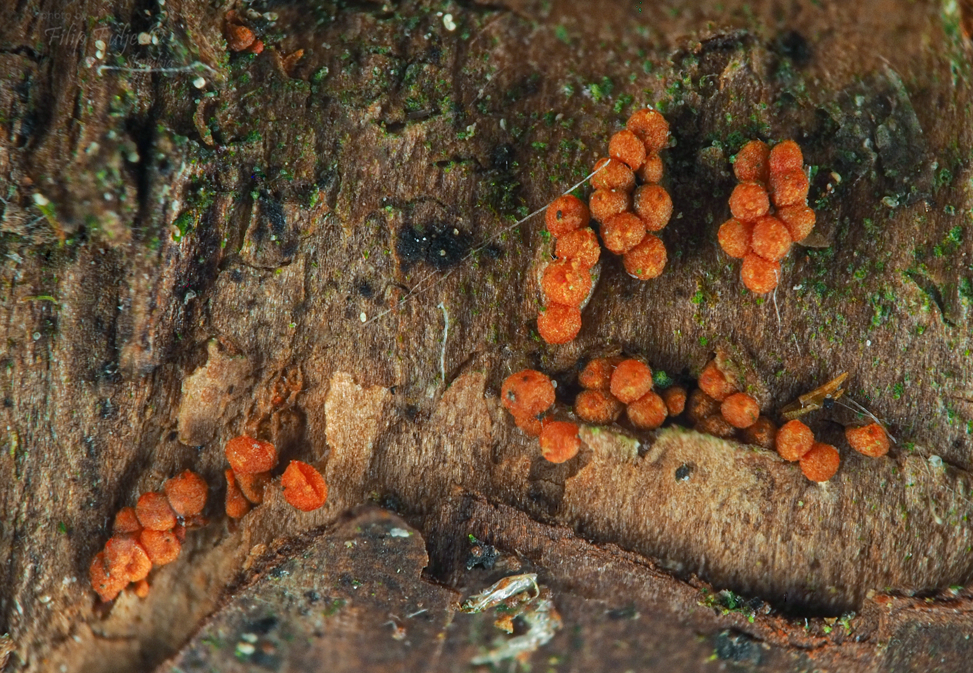 Fruchtkörper: Fruchtkörper gesellig, gewöhnlich in grosser Zahl auf einem dünnfleischigen Stroma sehr dichtstehend, kugelig, 0,3—0,5 mm breit, mit warzenförmiger Mündung, später niedergedrückt. Peridium anfangs ziegel- oder scharlachrot, später bräunlichrot, weich.