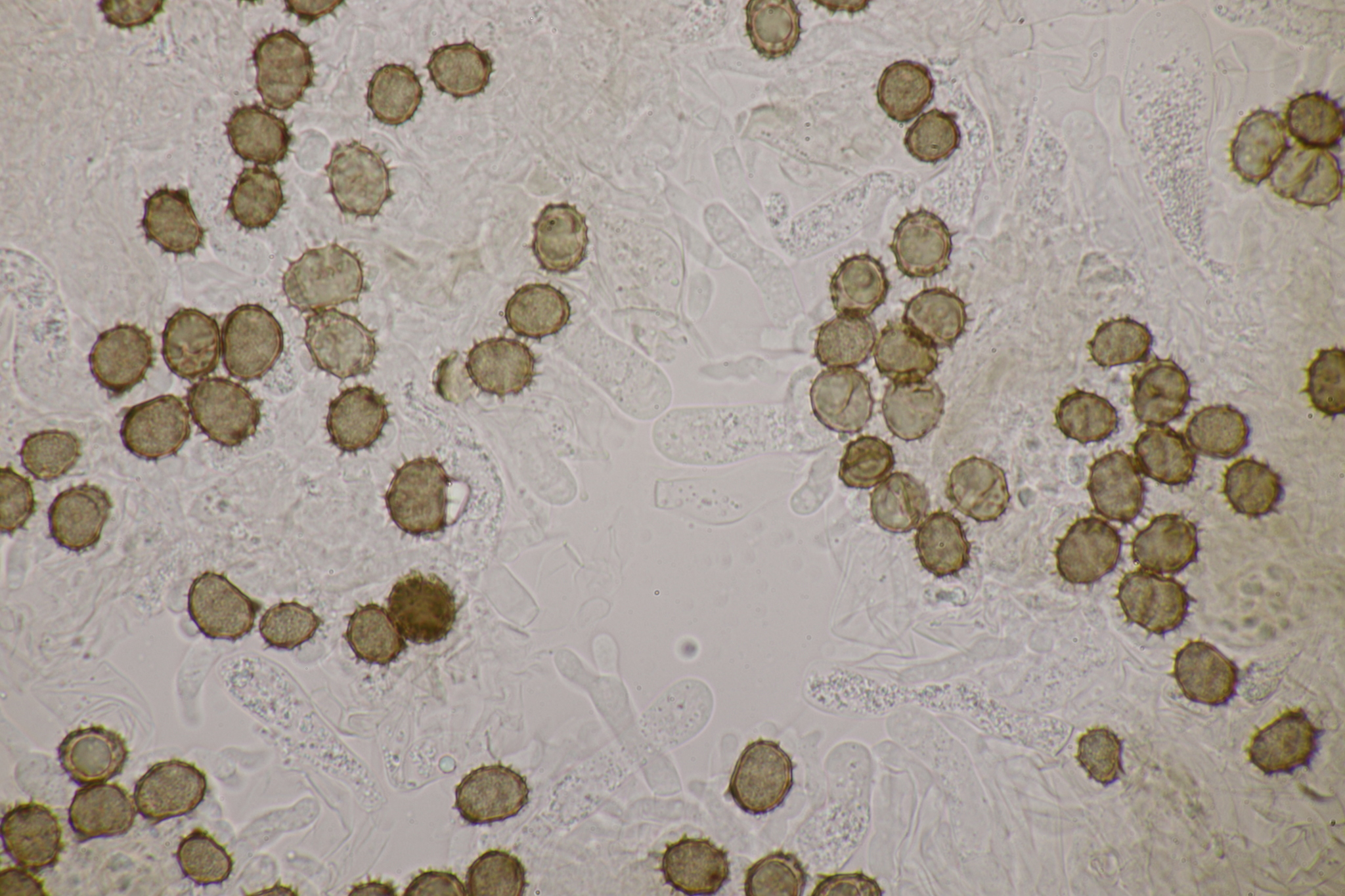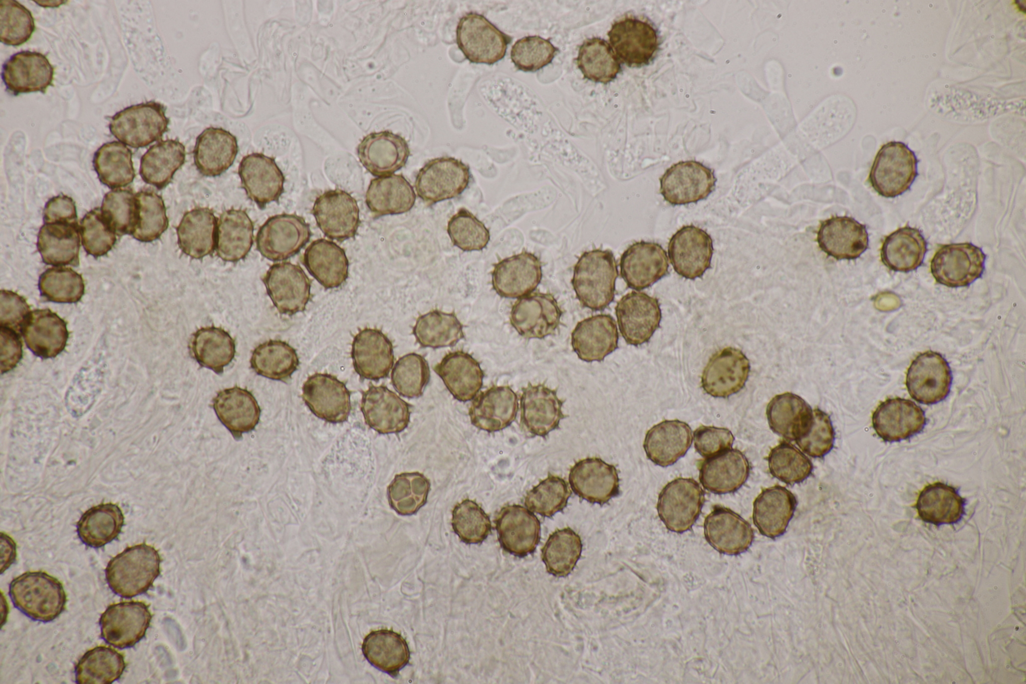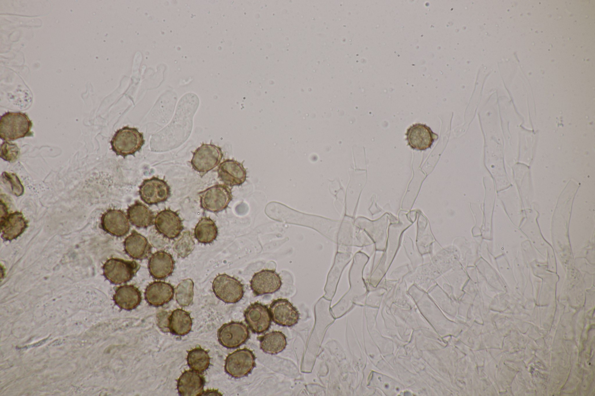 Sporen: Sporen zum Teil genau kugelig, 10—16 µm im Durchmesser betragend, zum Teil kugelig, auf einer Seite abgeflacht oder elliptisch, 10—12 µm lang, 7—9 µm breit; Membran dunkelbraun, derb, besonders bei den grossen Sporen sehr dick, mit massig langen, hyalinen Stacheln besetzt. Sporen stets einen grossen Öltropfen bergend. Hyphen sehr unregelmässig, braun, ziemlich derbwandig, glatt, septiert, ohne Schnallenbildungen, 3—5 µm dick.