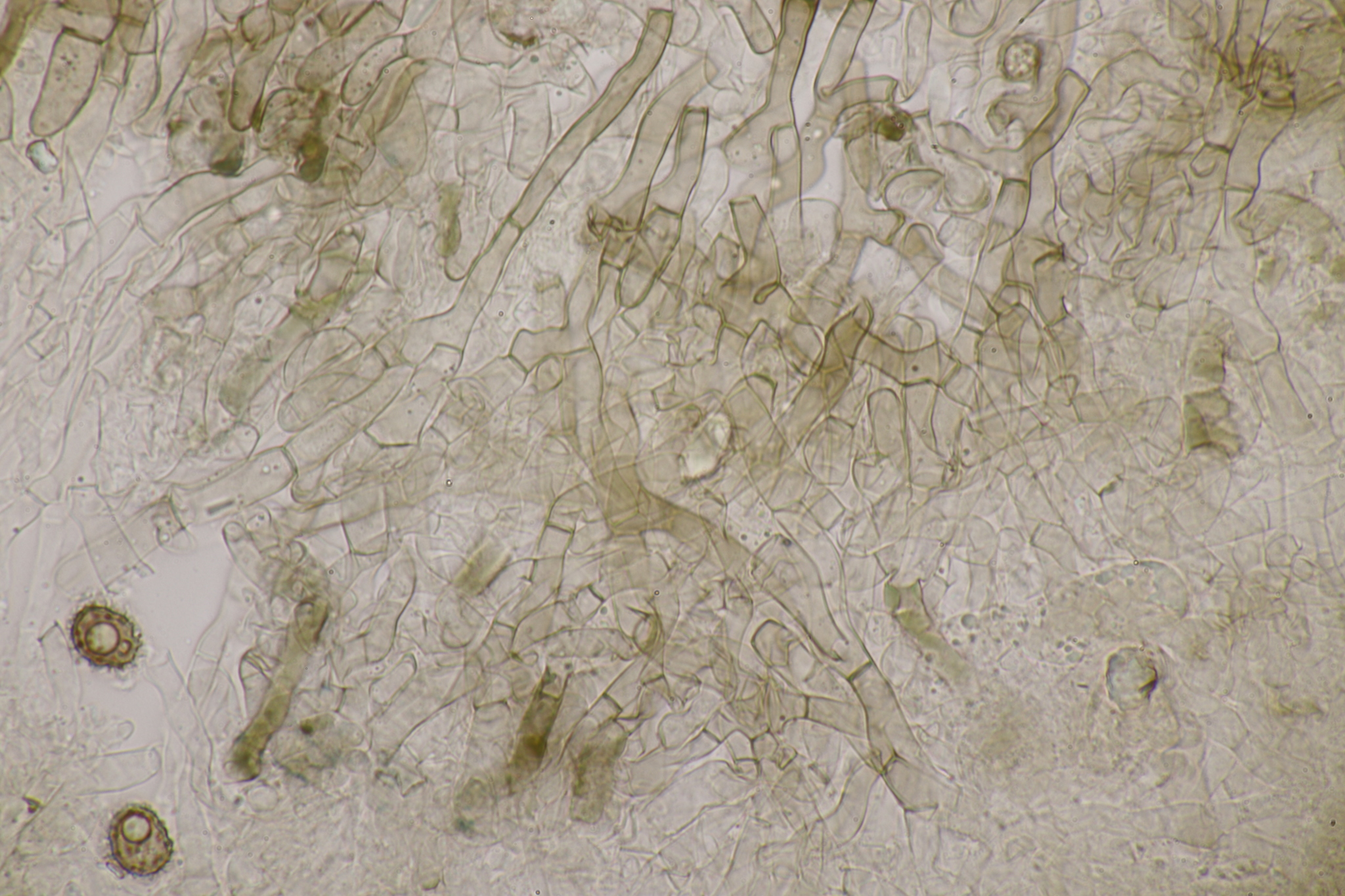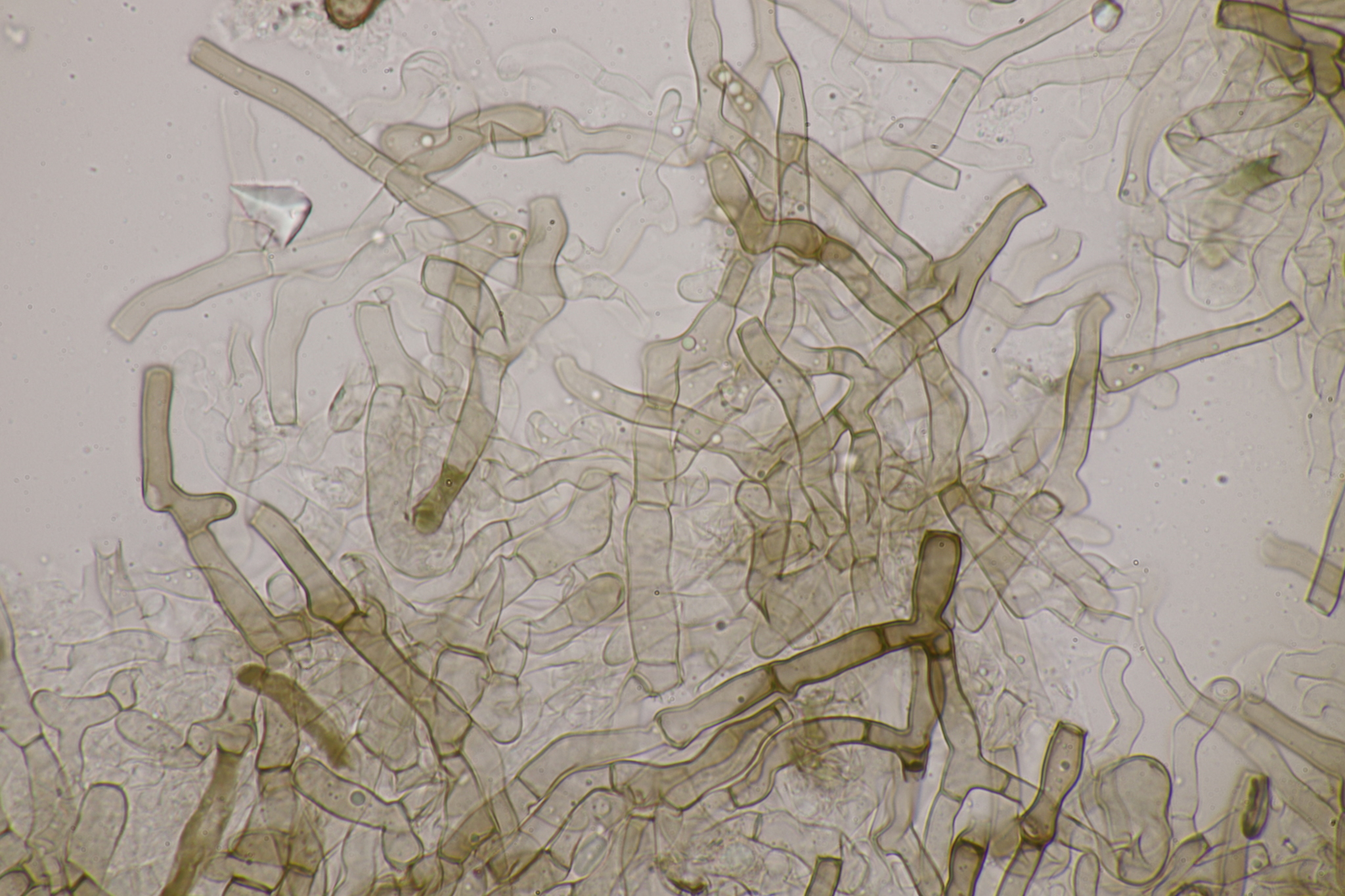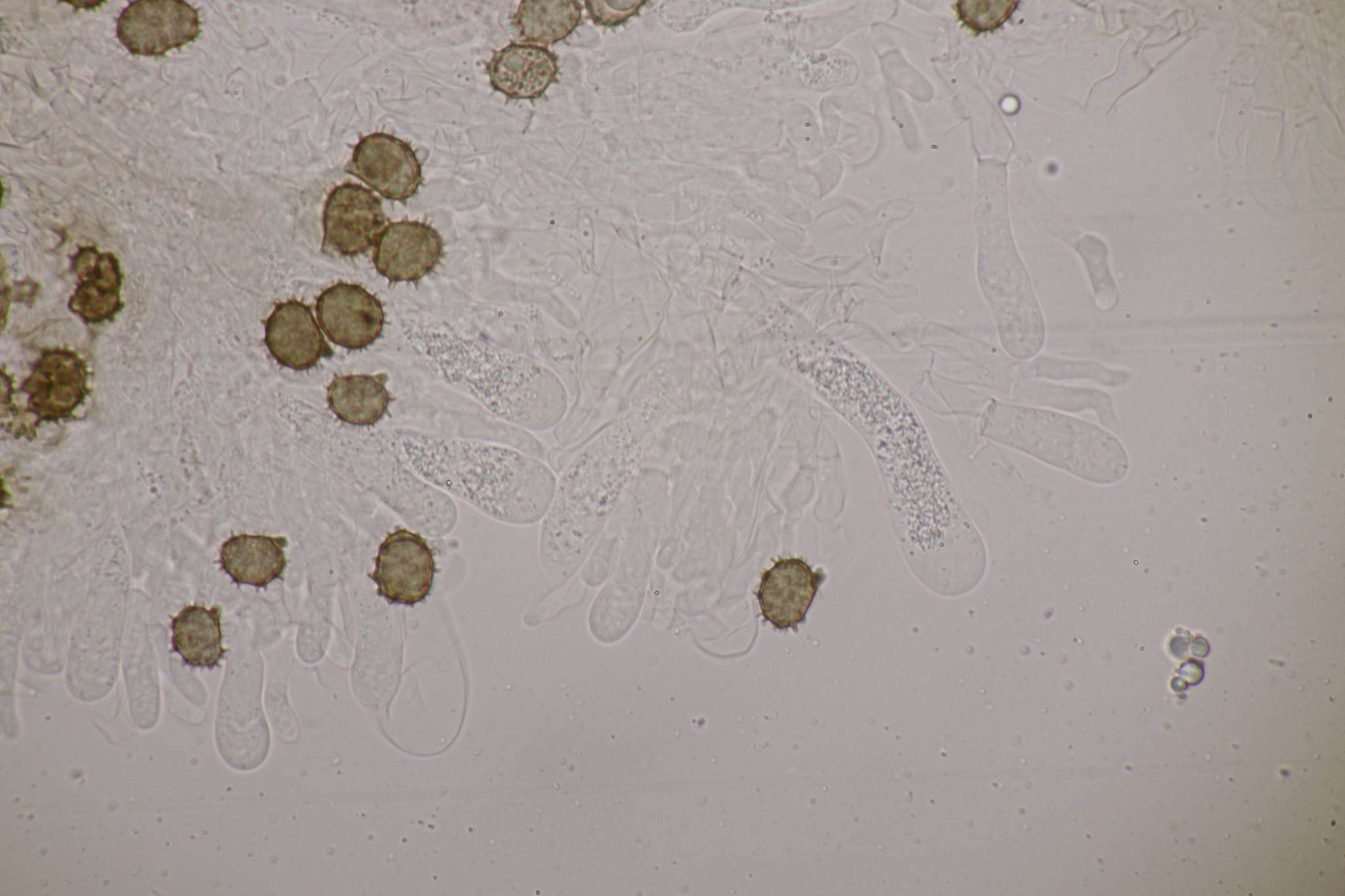 Sporen: Sporen zum Teil genau kugelig, 10—16 µm im Durchmesser betragend, zum Teil kugelig, auf einer Seite abgeflacht oder elliptisch, 10—12 µm lang, 7—9 µm breit; Membran dunkelbraun, derb, besonders bei den grossen Sporen sehr dick, mit massig langen, hyalinen Stacheln besetzt. Sporen stets einen grossen Öltropfen bergend. Hyphen sehr unregelmässig, braun, ziemlich derbwandig, glatt, septiert, ohne Schnallenbildungen, 3—5 µm dick.