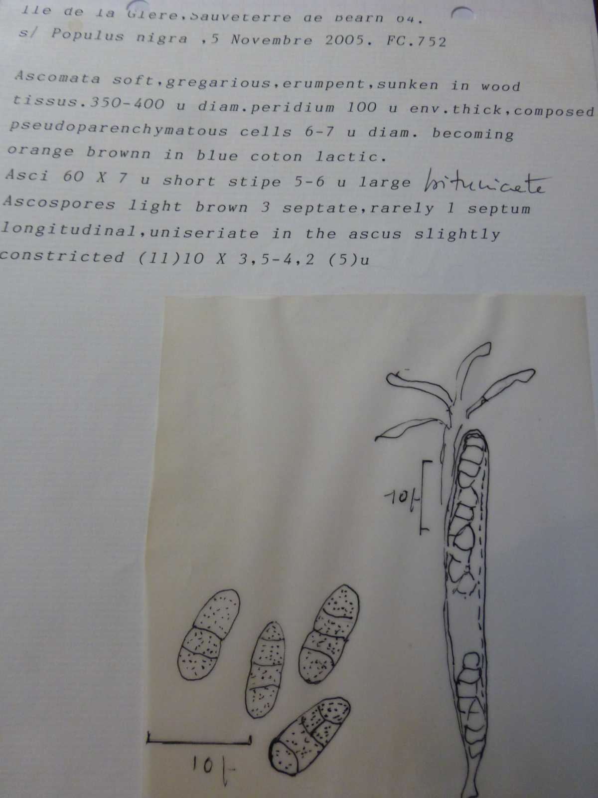 Fruchtkörper: Perithecien zerstreut, meist nur wenig, oft nur mit der Basis eingesenkt oder eingewachsen, kuglig, eiförmig oder kegelförmig, etwas runzelig, matt schwarz, hart, mit kleinem, bald verschwindendem Ostiolum und dann am Scheitel mit weitem Porus, ca. 0,6 mm breit. Asci länglich-keulenförmig, abwärts in einen ziemlich langen Stiel verschmälert, 8 sporig, 110—140 µn lang, 15 — 20 µm dick. Sporen undeutlich zweireihig , oblong - breit - spindelförmig , ungleichseitig, meist ungleich zweizeilig, seltener vierzellig, an der mittleren Quer- wand eingeschnürt, braun, 21 - 26 µm lang, 6 — 7 µm dick. Paraphysen fädig , zusammenfliessend.