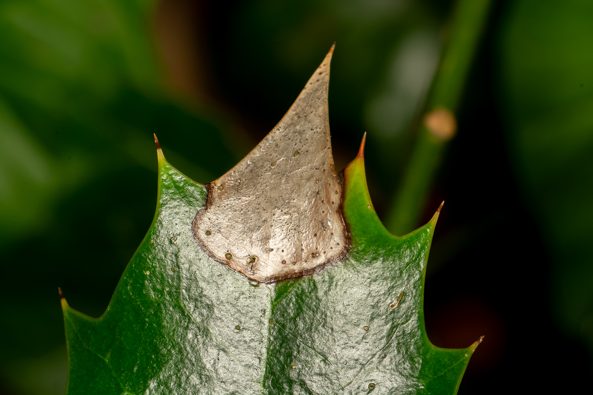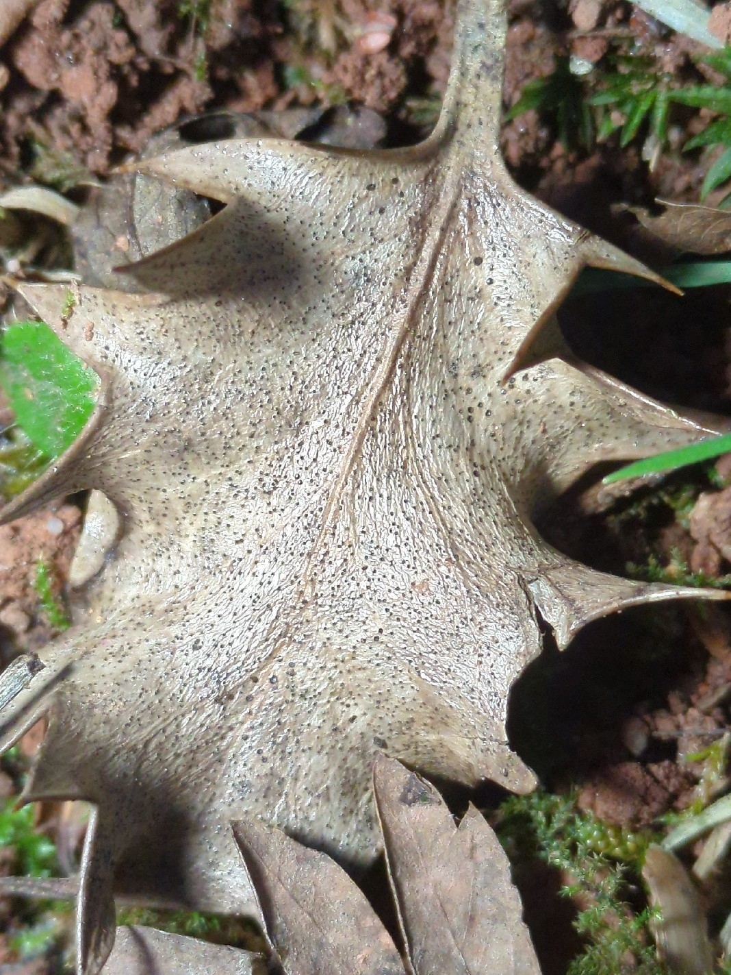 Vorkommen: Auf der Oberseite dürrer Blätter von Europäische Stechpalme (Ilex aquifolium).