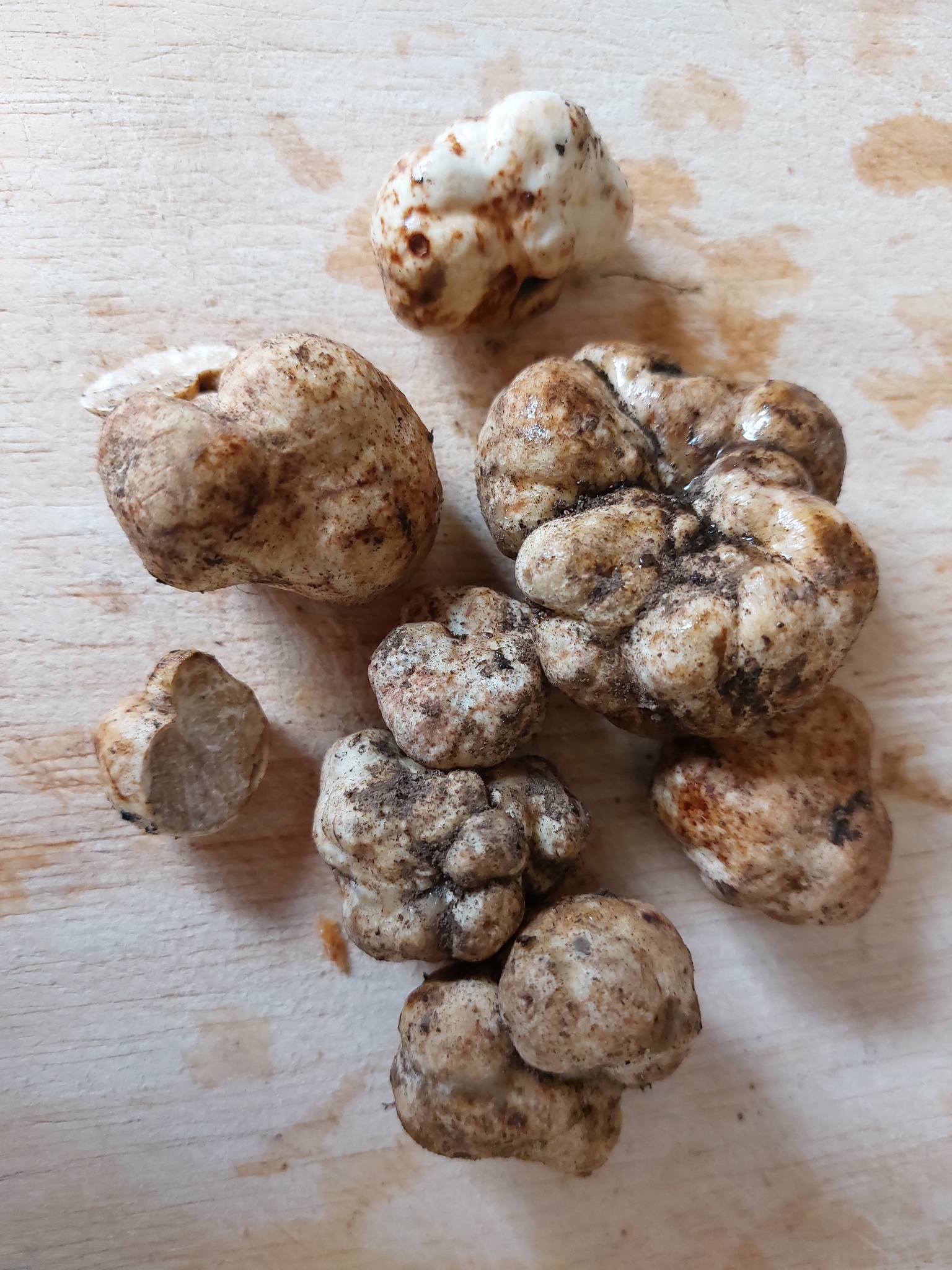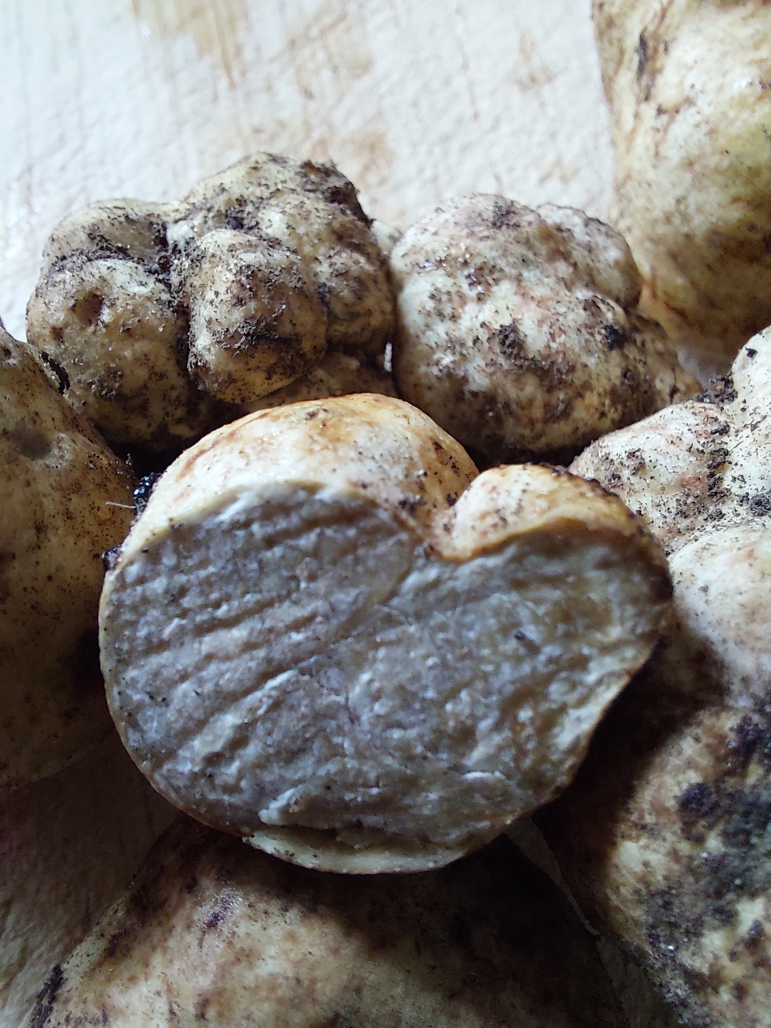 Fruchtkörper: Fruchtkörper knollenförmig, durch Falten und Höcker unregelmässig gestaltet, seltener regelmässig rundlich, haselnuss- bis hühnereigross, mit glatter, anfangs schneeweisser, später gelblich gefleckter, zuletzt goldgelber, aus wirr und sehr dicht verflochtenen, ziemlich weitlumigen Hyphen bestehender Oberfläche. Fruchtkörperinneres rotbraun, mit weissen Adern.