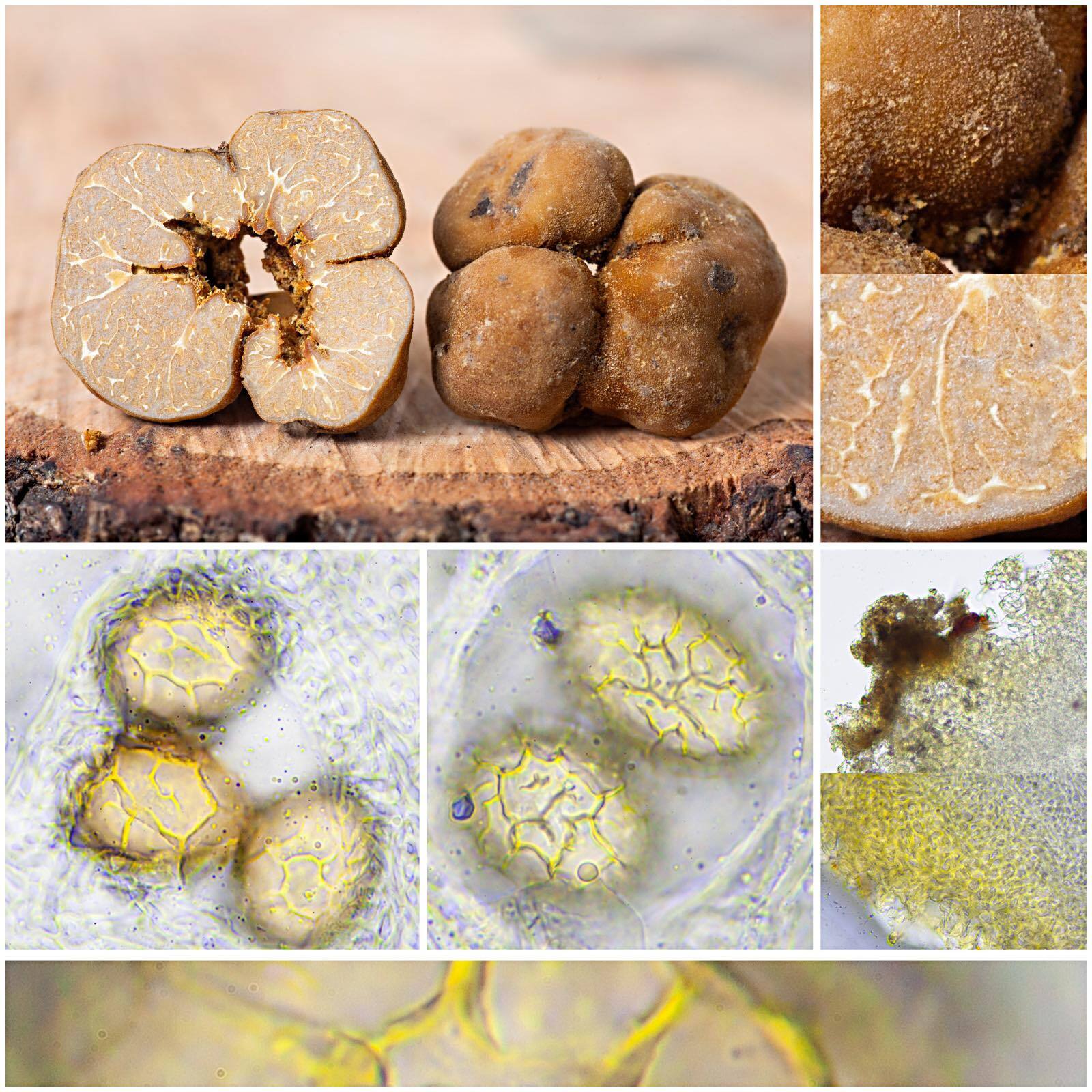 Fruchtkörper: Fruchtkörper fast kugelig oder unregelmässig knollenförmig, unregelmässig höckerig oder faltig, am Grunde mit einer weit nach innen vorragenden, oft mit wolligem Filz ausgekleideten grubigen oder spaltartig verengten Vertiefung, bis walnussgross und darüber, oberflächlich glatt bis fein papillös, anfangs ockergelb, später rotbraun bis dunkelbraun, sehr fest und zähe, innen reif zähe, trocken hornartig, ockerfarben bis braun.