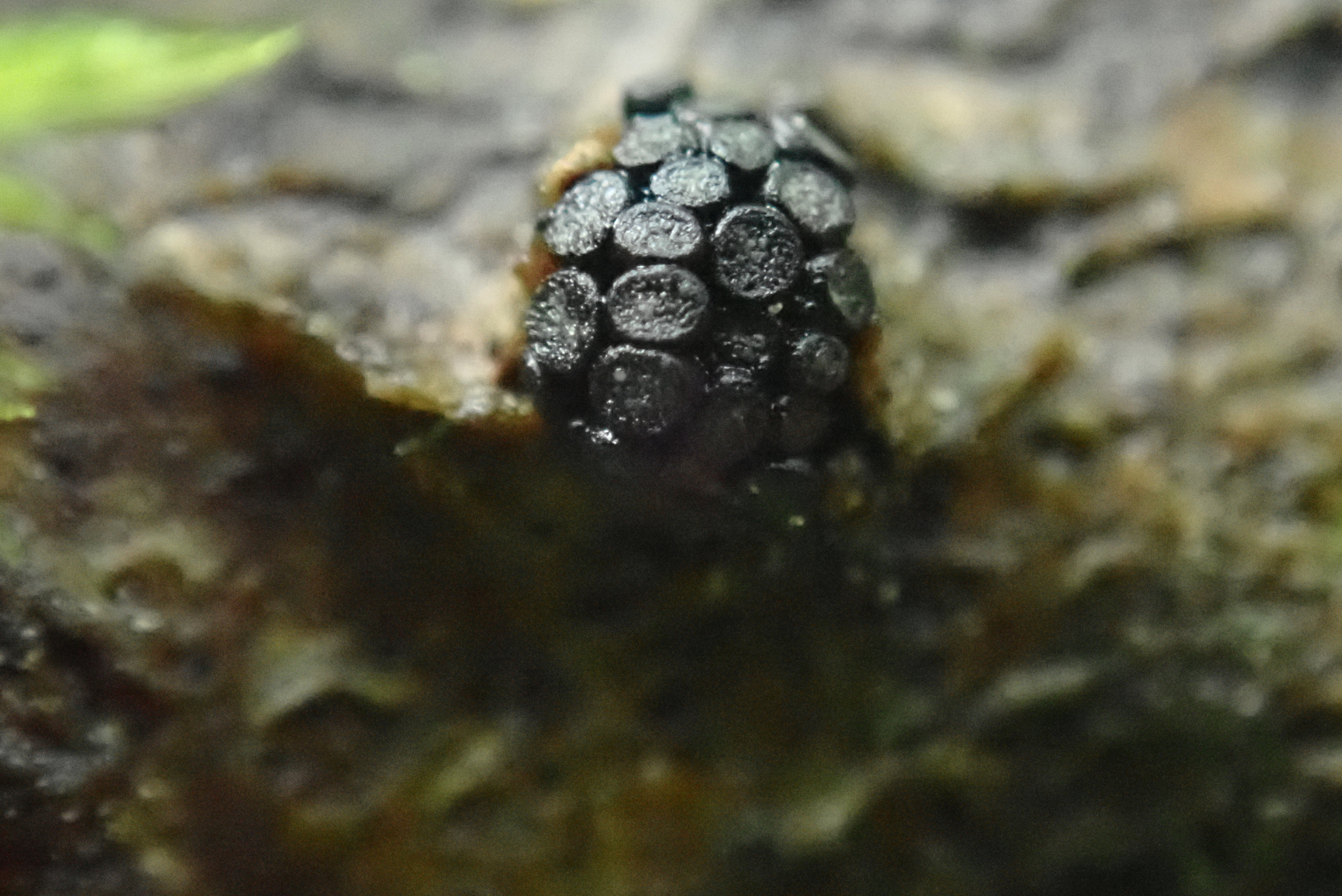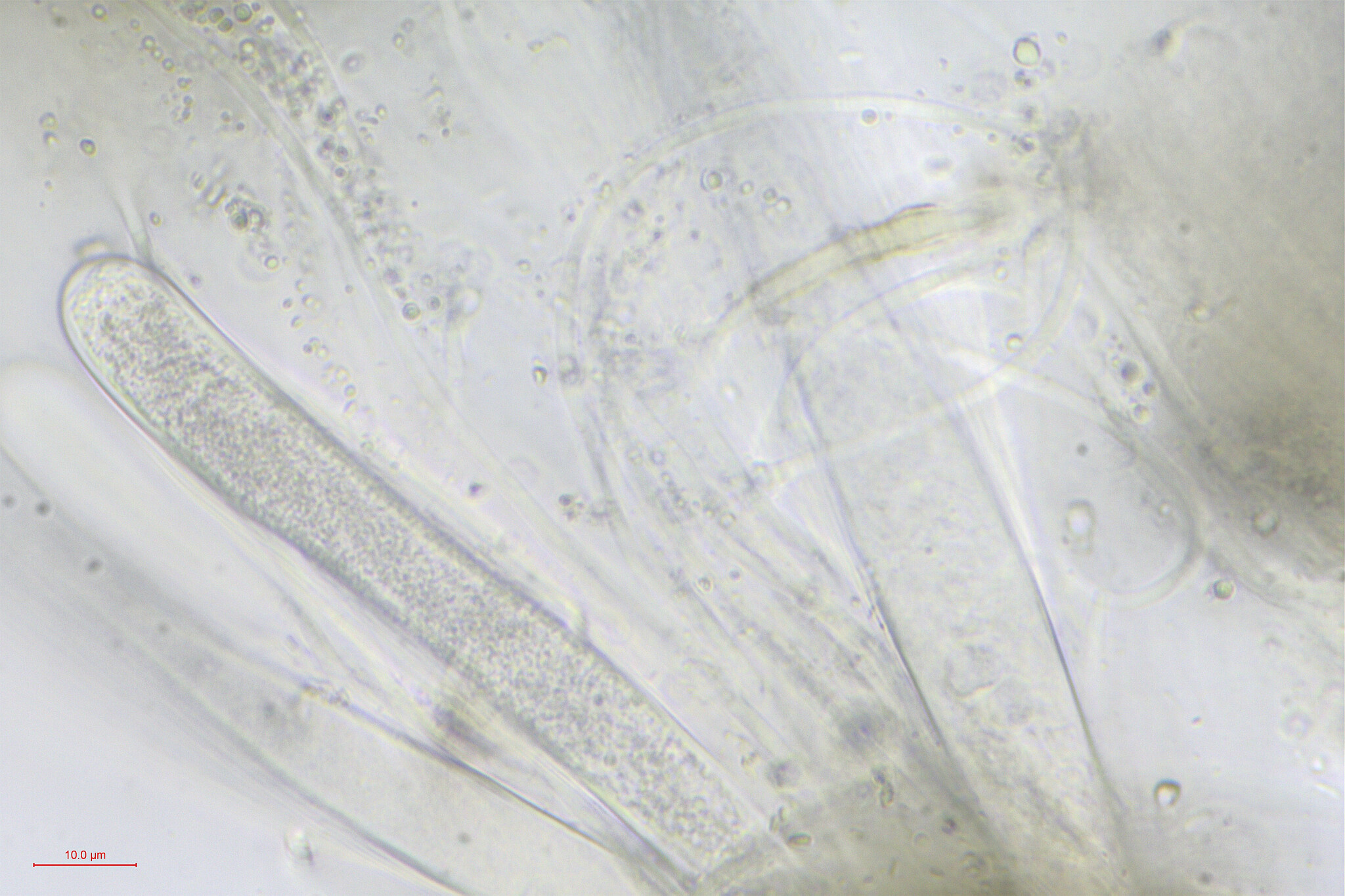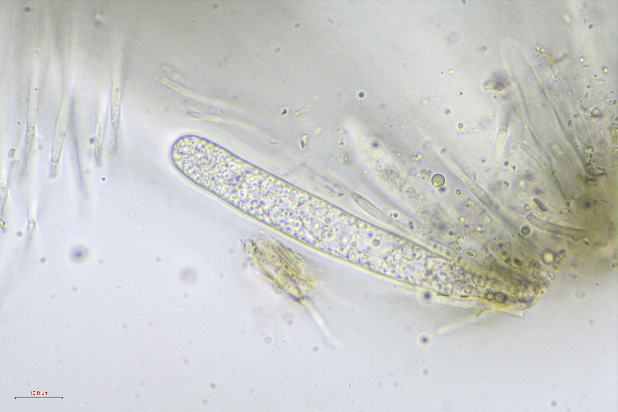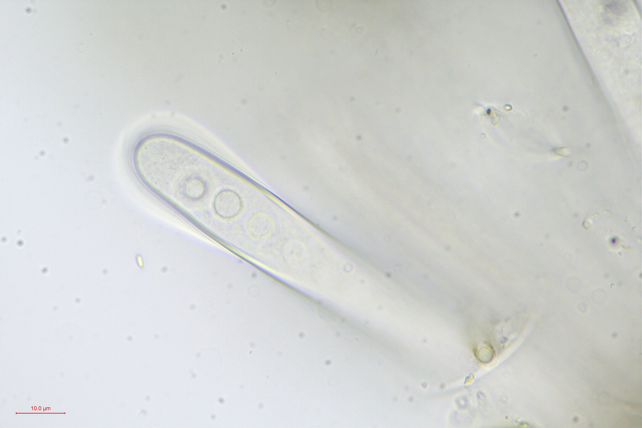 Sporen: Schläuche zylindrisch-keulenförmig, 115—180 µm lang, 18—20 µm breit, unzählige Sporen enthaltend. Sporen eiförmig, 1—2 µm lang, 0,5 µm breit, einfach, gelblich. Paraphysen oben bis 5 µm breit, braun, ein dickes Epithecium bildend. Echte Sporen selten entwickelt, 18—20 µm lang, 12 µm breit.