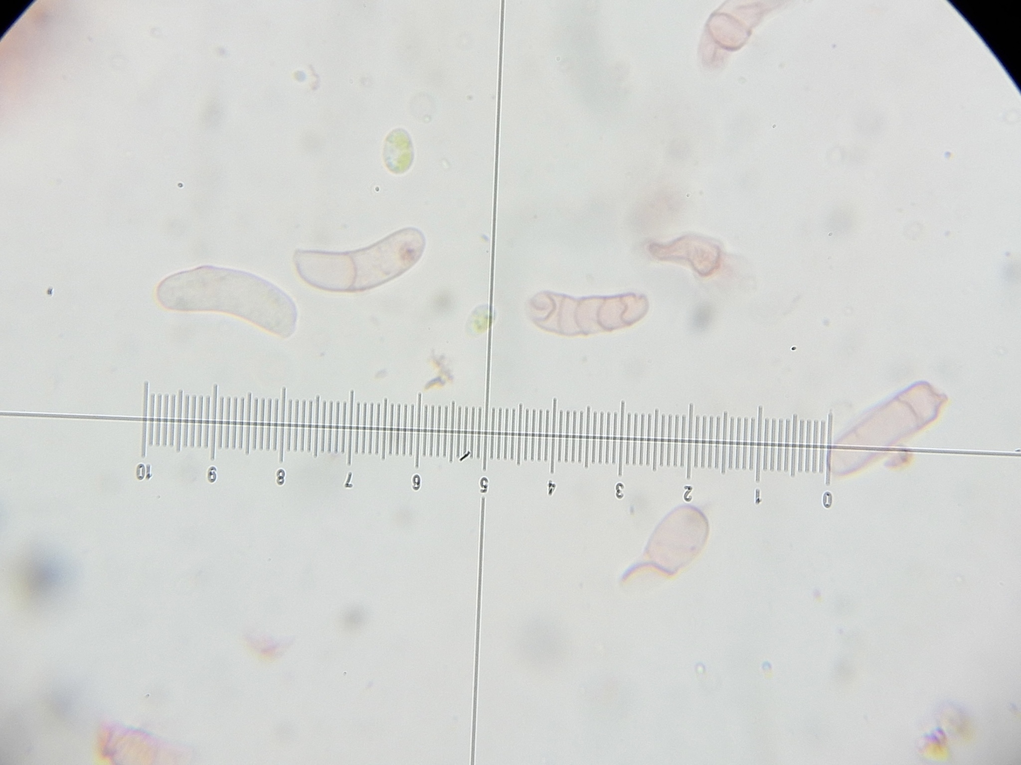 Sporen: Sporen zylindrisch, mit abgerundeten Enden leicht gebogen, 17—21 µm lang, 6—9 µm breit, mit farblosem, gleichförmigem Inhalt und farbloser, glatter Membran.