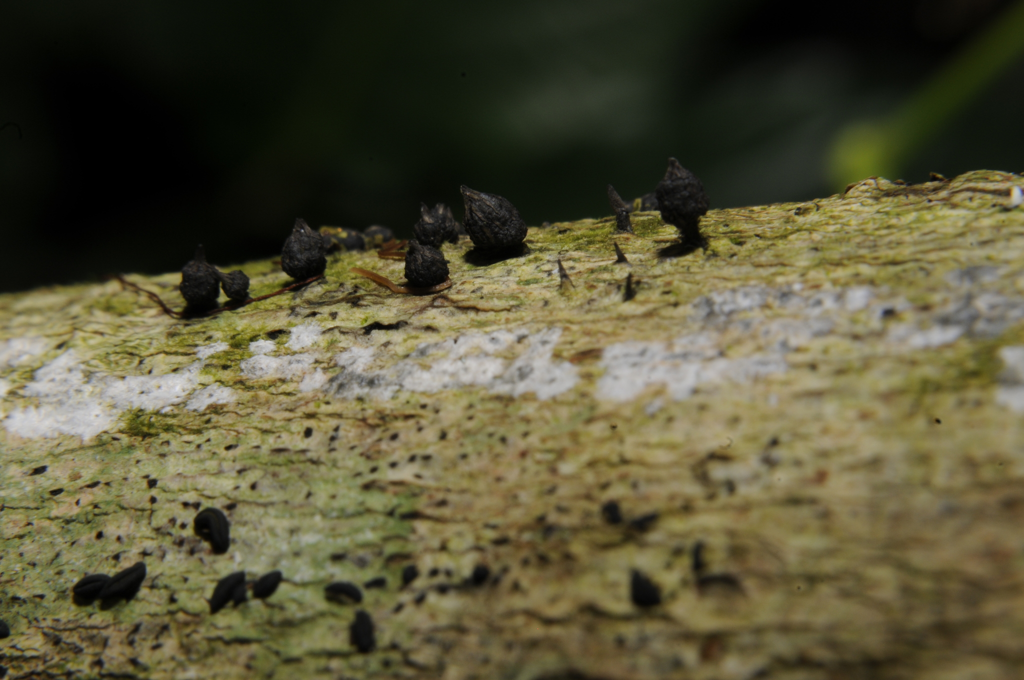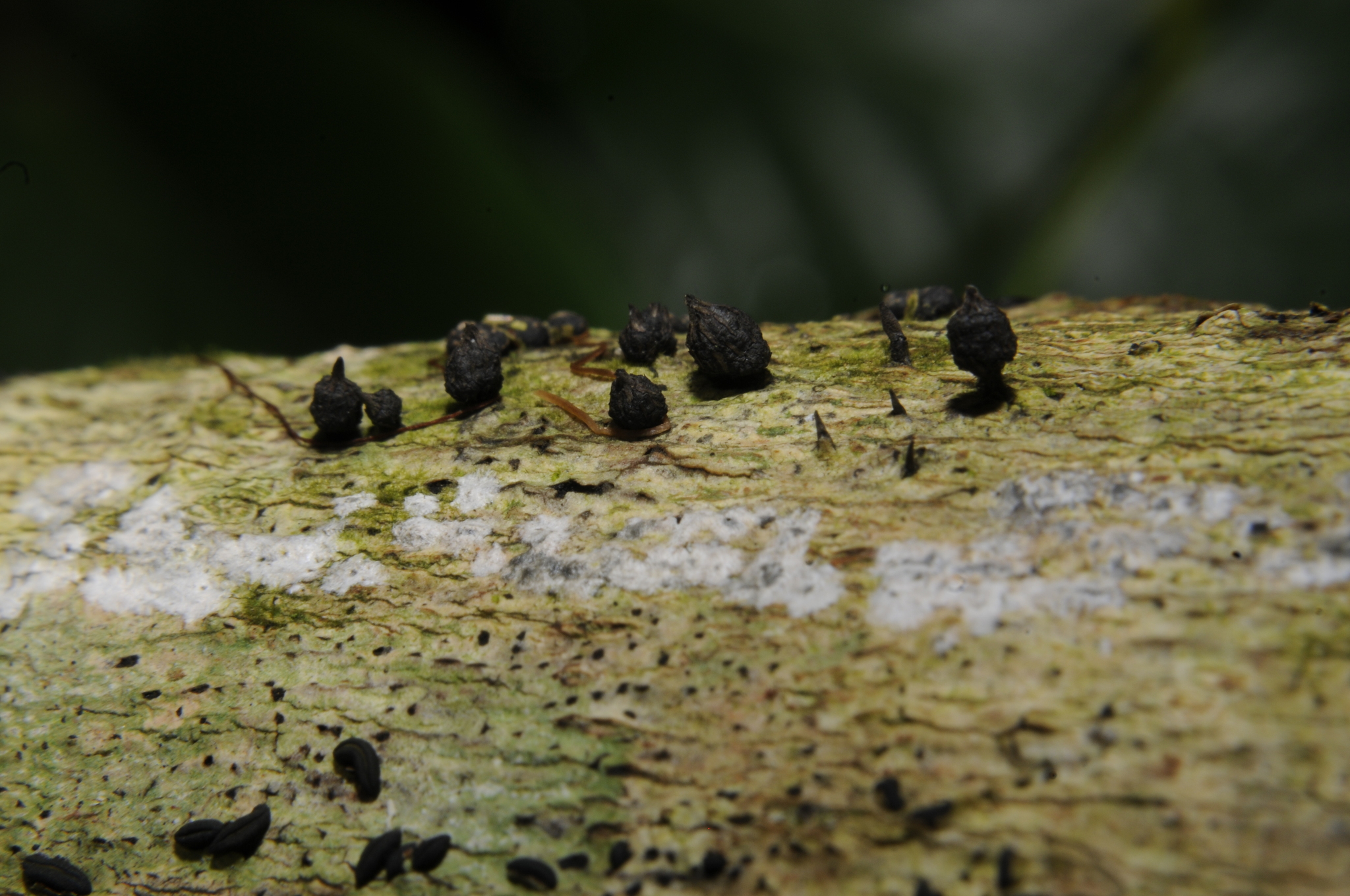 Fruchtkörper: Gesellig, büschelig, bäumchenförmig, schwarz. Stiele zierlich, 1,5-2,5 mm hoch, 1,5—2 mm dick, aufsteigend, filzig. Konidientragende Keulchen verschmälert, oft zusammengedrückt, am Scheitel weiss werdend, Perithecientragende Keulchen stielrund, am Scheitel kurz aber scharf zugespitzt, 0,5—1 cm lang, 1,5 mm dick, anfangs graulängsfurchig, zuletzt wegen der Perithecien niedergedrückt-feinknotig. Perithecien kugelig, eingesenkt, kaum 0,5 mm breit, papillenförmig.