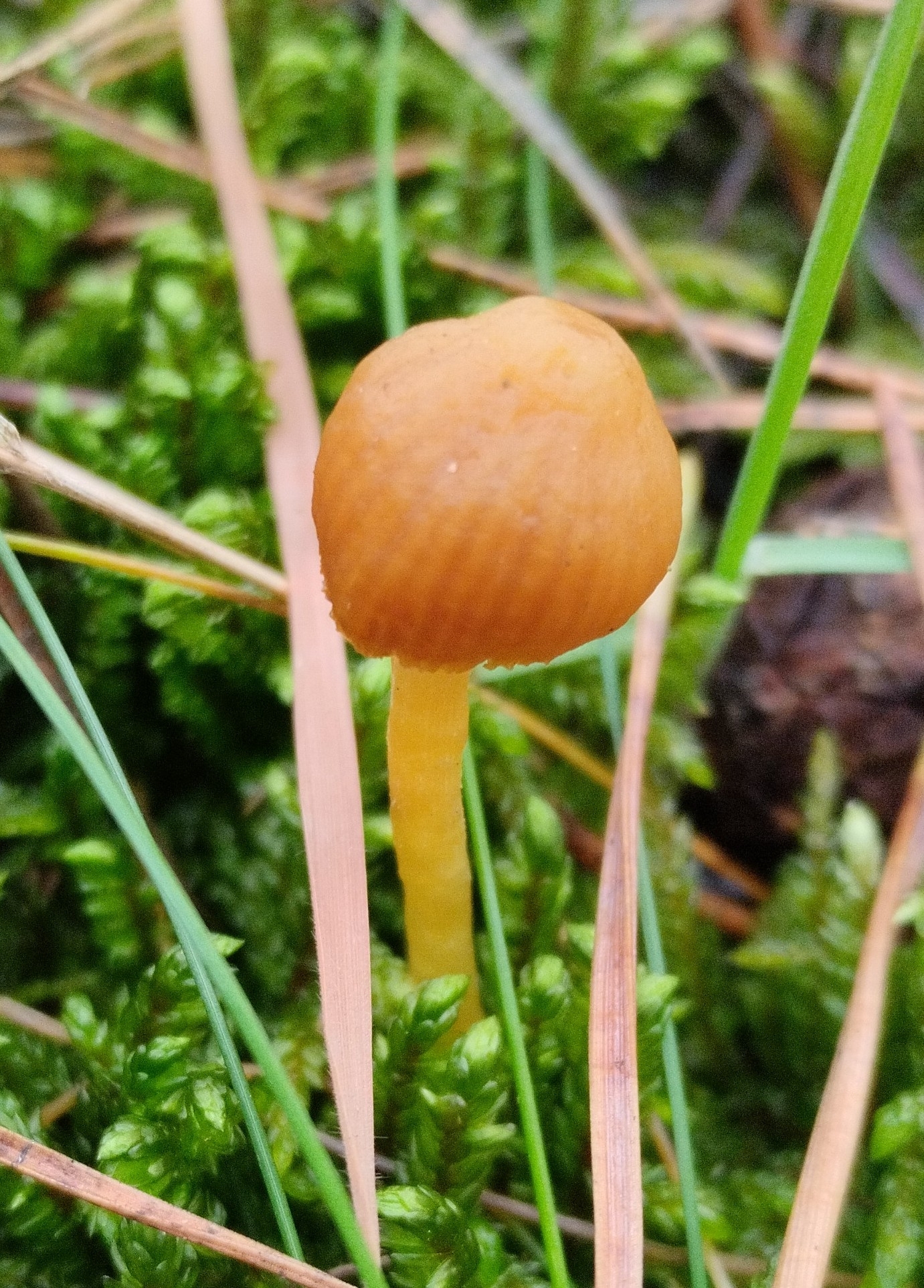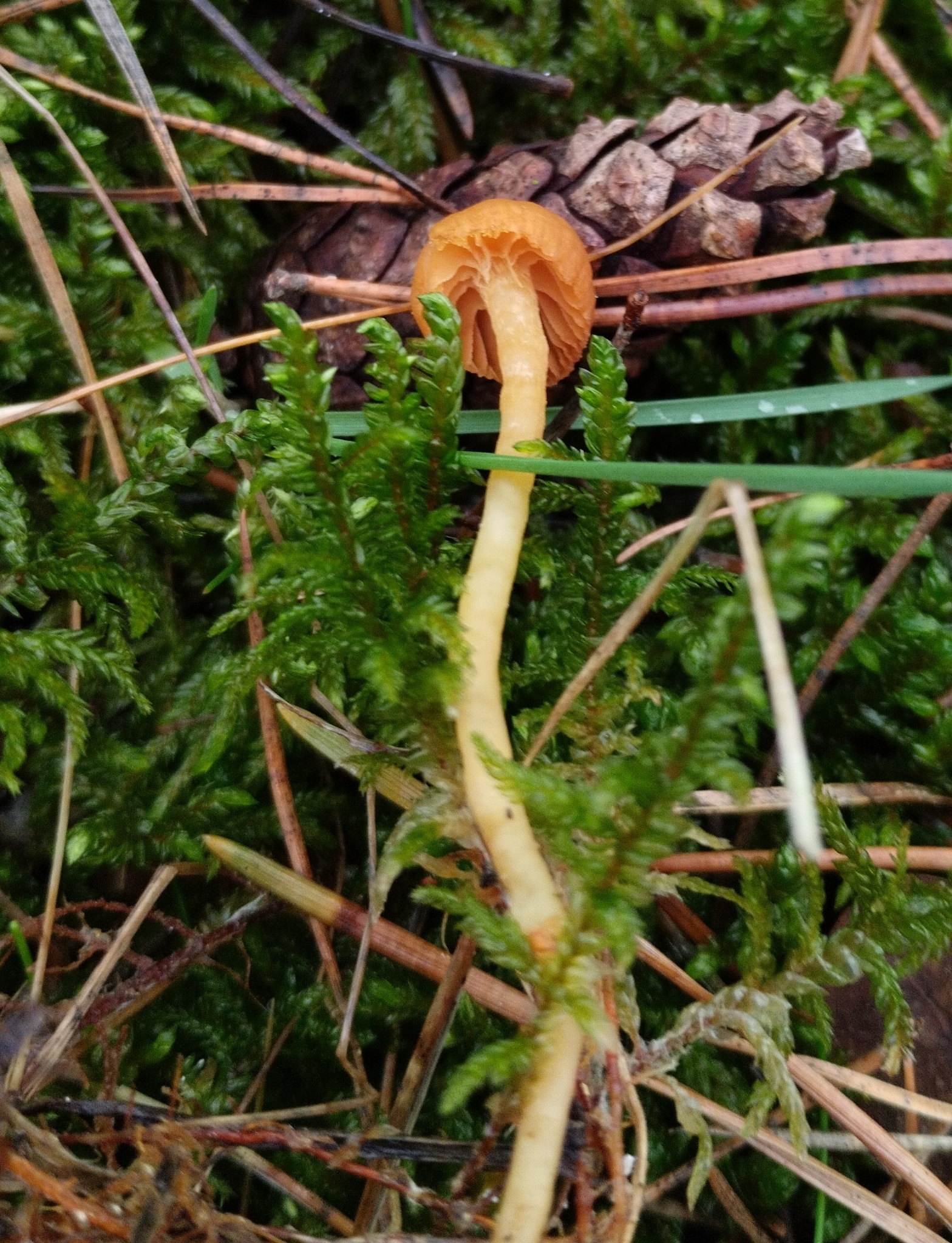 Stiel: Stiel dünn, gebogen, schlaff, an Spitze bereift, wie der Hut ockergelb, verblassend und verschiedenfarbig: gelbbraun, rostbraun, orangegelb usw.
