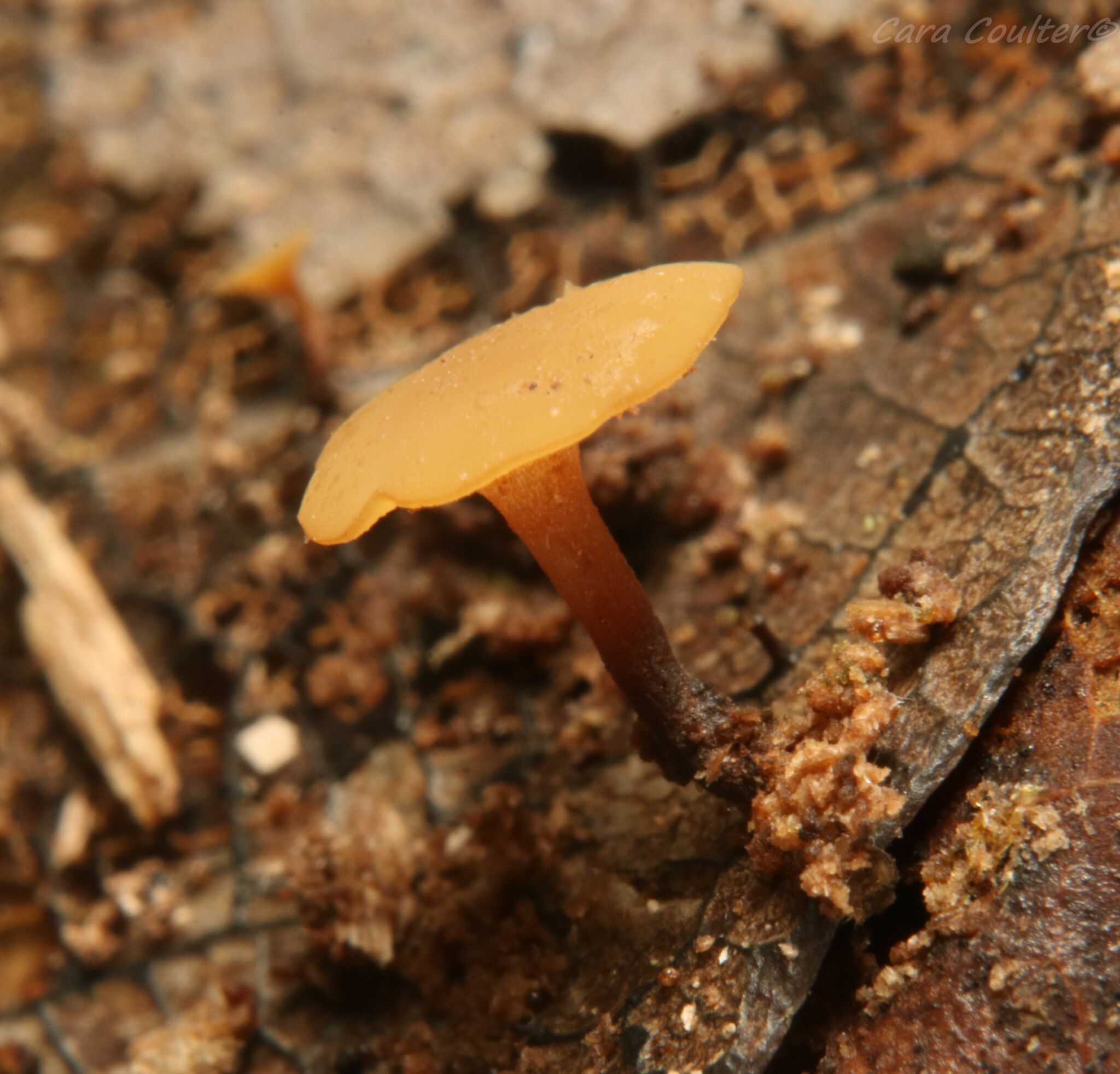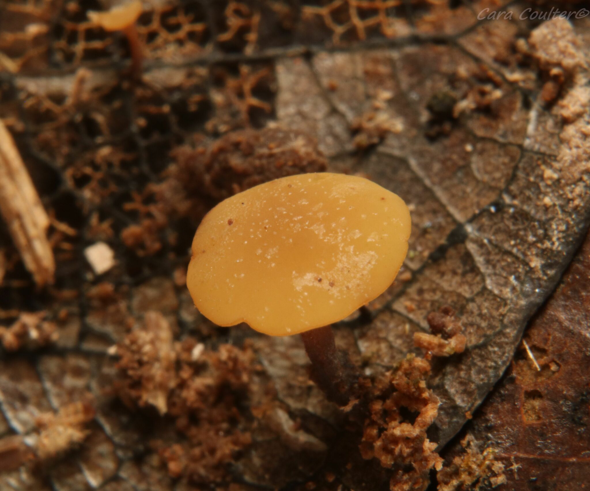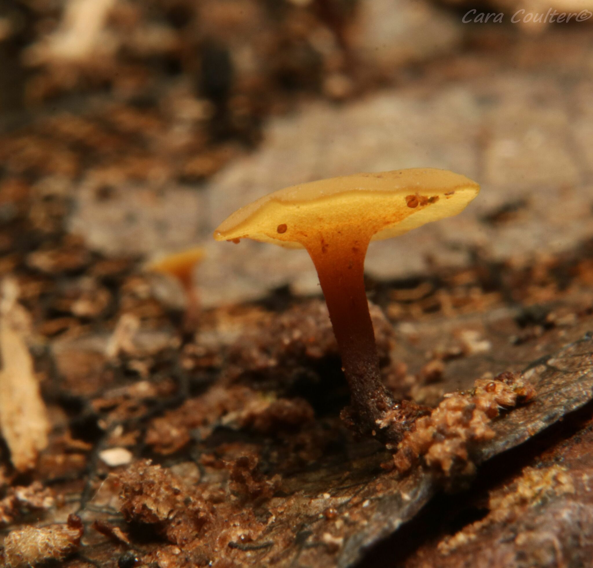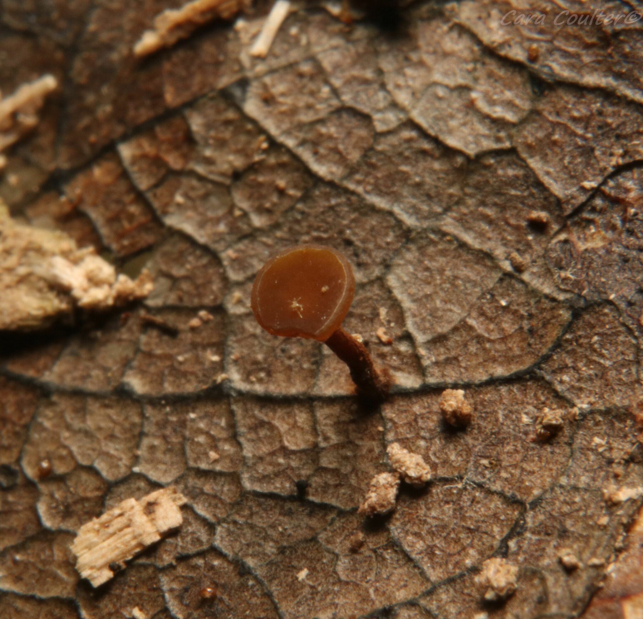 Fruchtkörper: Apothecien zerstreut, sitzend, kelchförmig, zuerst geschlossen, rundlich sich öffnend und die trichter-, dann flach schüsseiförmige, hasel- oder blass lederfarbige, etwas bräunliche, zart gekerbt und zuletzt eingerissen berandete Fruchtscheibe entblössend, 3—5 mm breit, aussen glatt, gelblich, in einen 1—4 mm langen, 0,3—0,4 mm breiten, zylindrischen Stiel verschmälert, trocken verbogen, mit bräunlicher Fruchtscheibe, aussen längsgerunzelt, wachsartig.