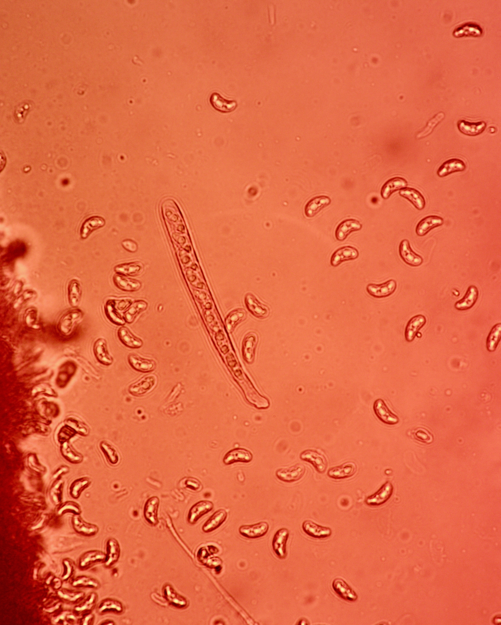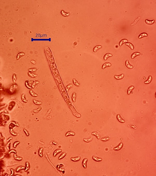 Sporen: Schläuche zylindrisch- keulig, 100—120 µm lang, 8—10 µm breit, achtsporig. Sporen ellipsoidisch oder keulig, meist etwas gebogen, einzellig, mit einem (bis zwei) grossen und vielen kleinen Öltropfen, farblos, 10—12 µm lang, 6—7 µm breit, einreihig gelagert. Paraphysen t'ädig, oben meist bis 3 µm breit, farblos. Jod färbt den Schlauchporus blau Gehäuse prosenchymatisch, gelblich.