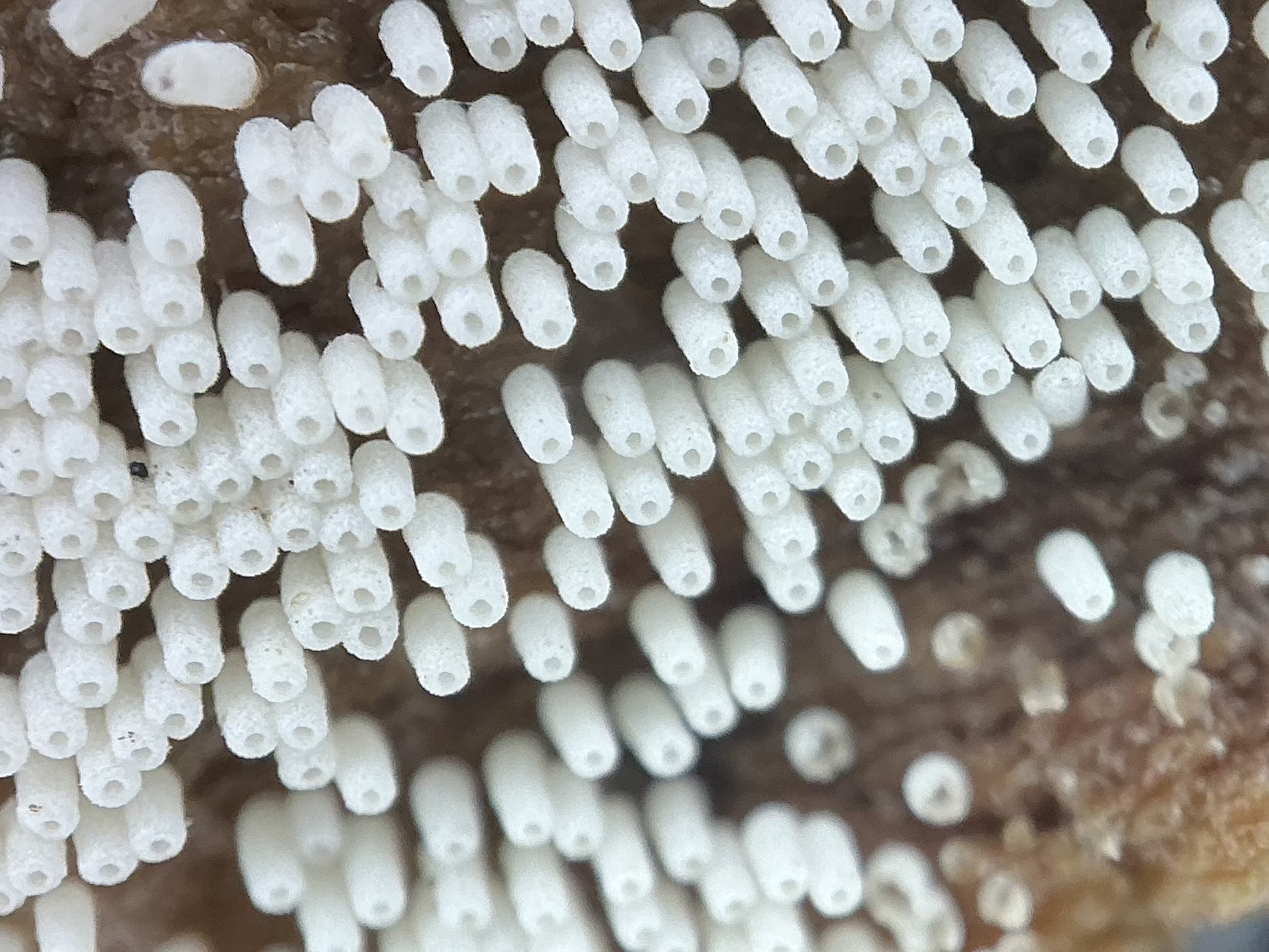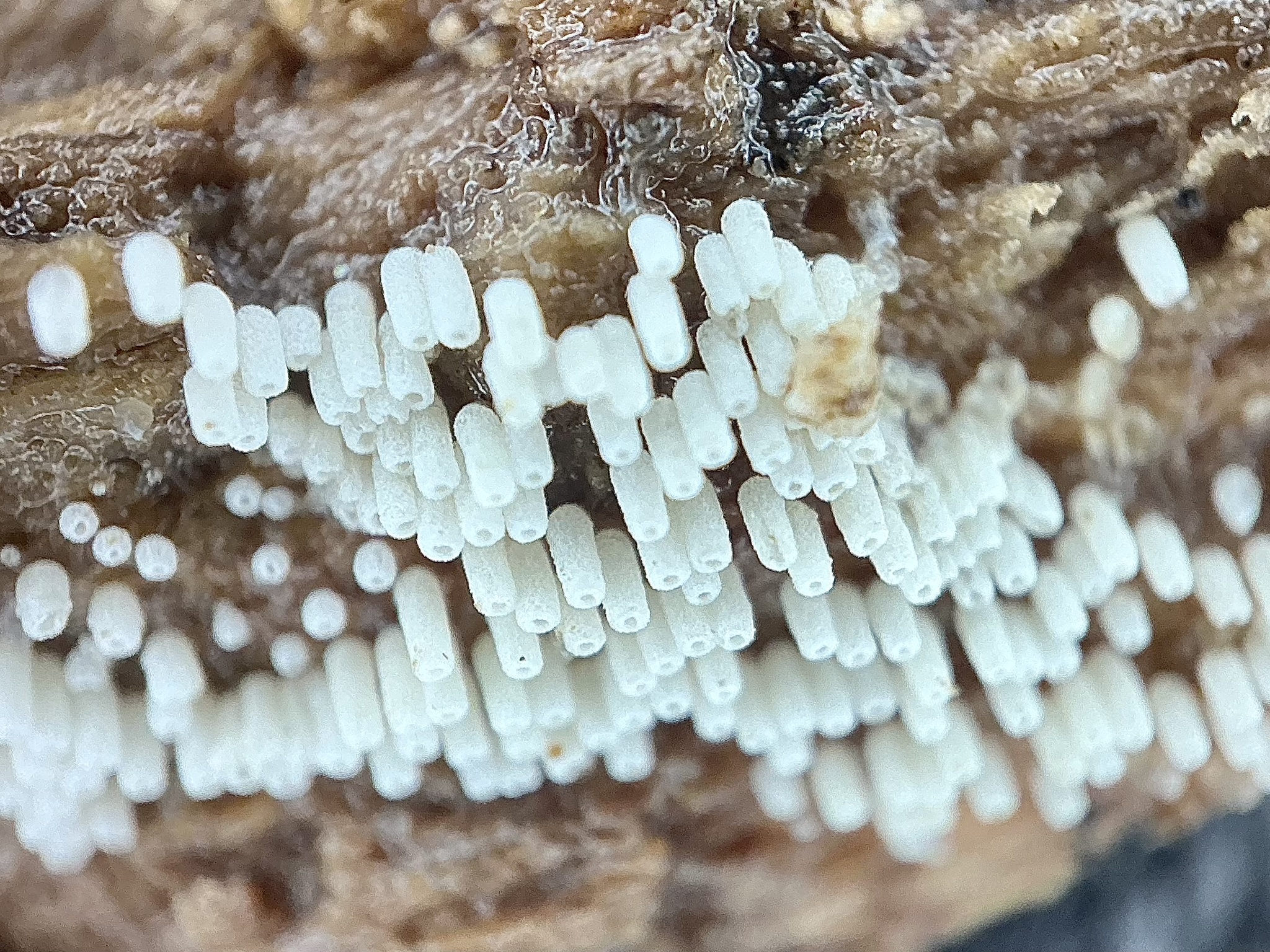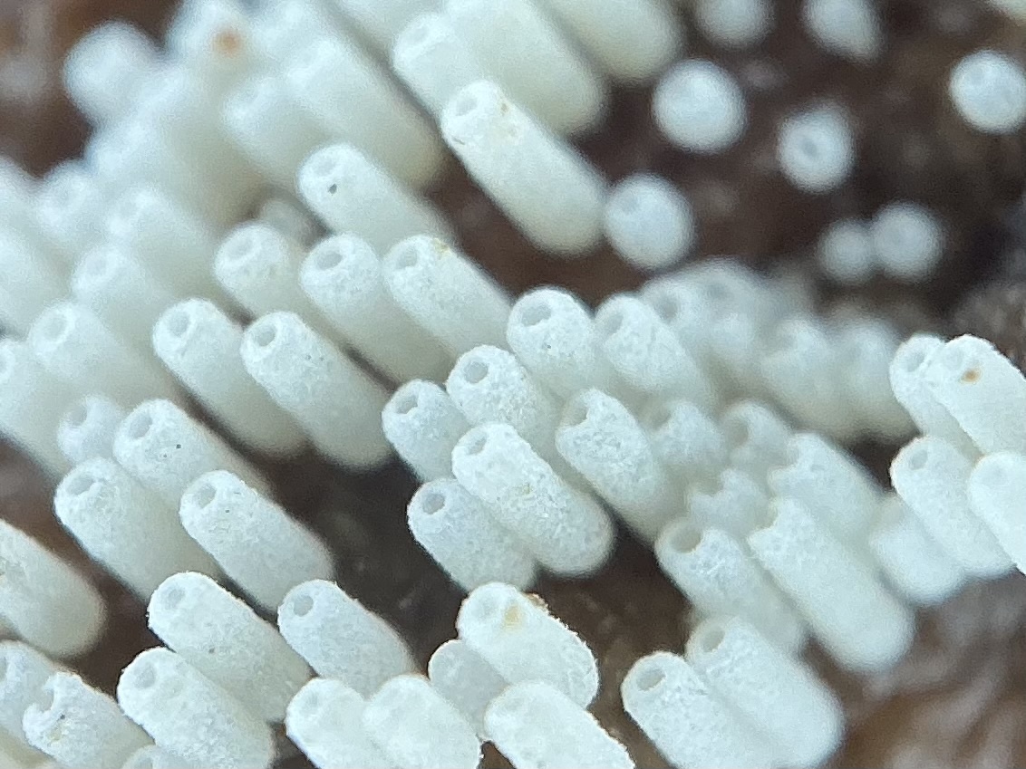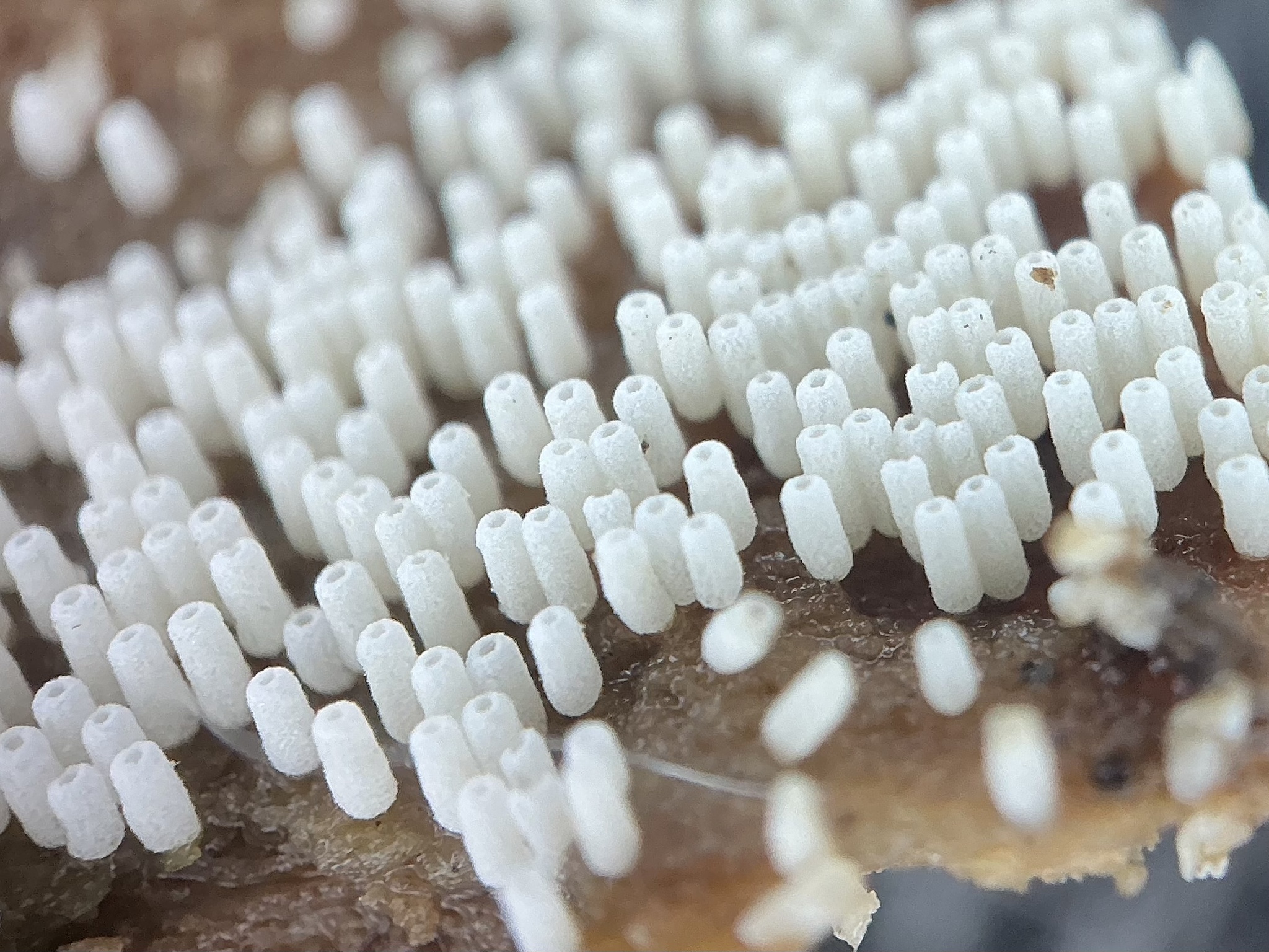 Fruchtkörper: Fruchtkörper zylindrisch, röhrenförmig, 2 — 6 mm lang, dichtstehend, in Herden von mehreren Zentimetern Länge, rasenförmig, filzig, seidenhaarig oder fast kahl, anfangs reinweiss, später blassbräunlich