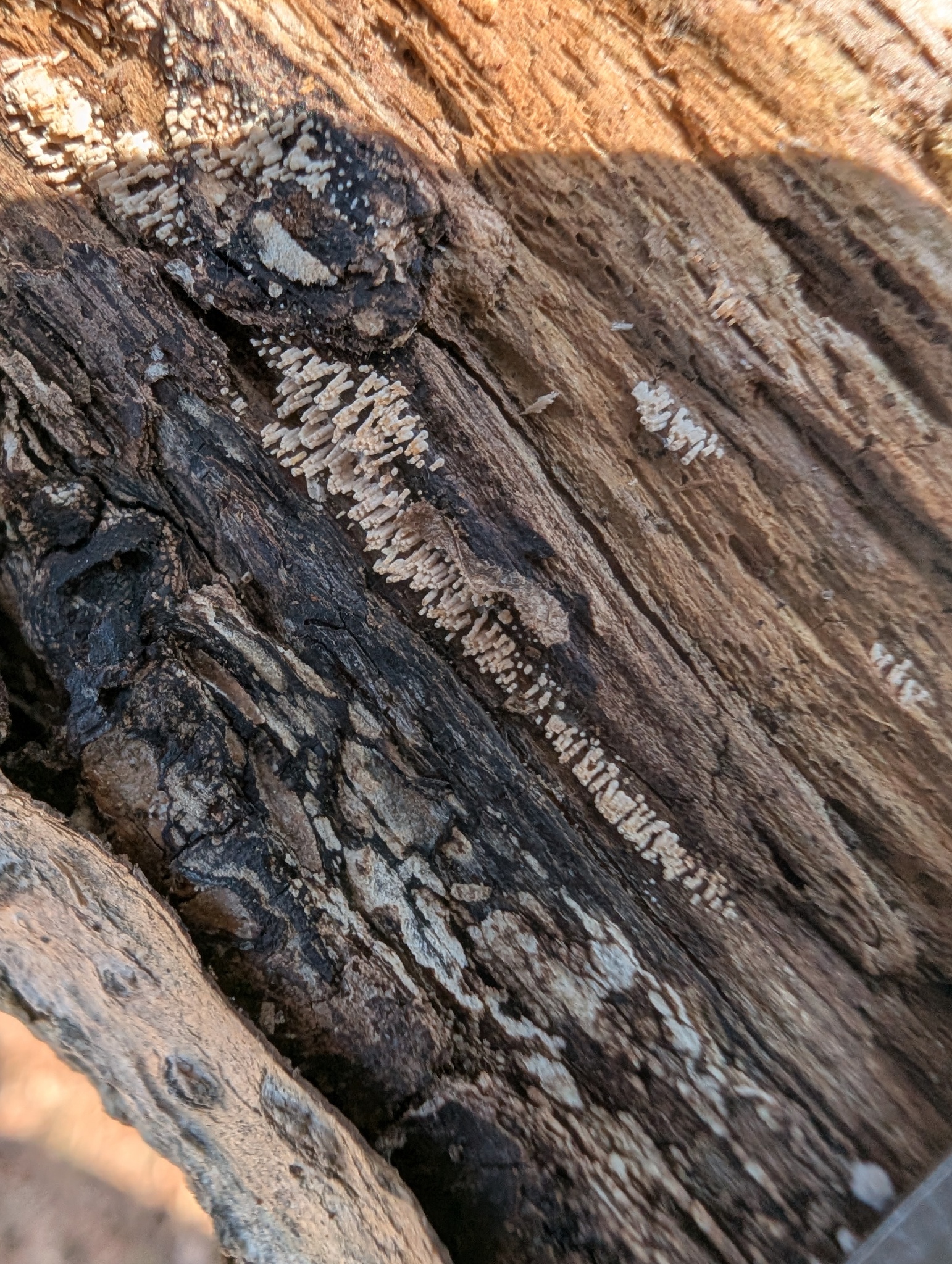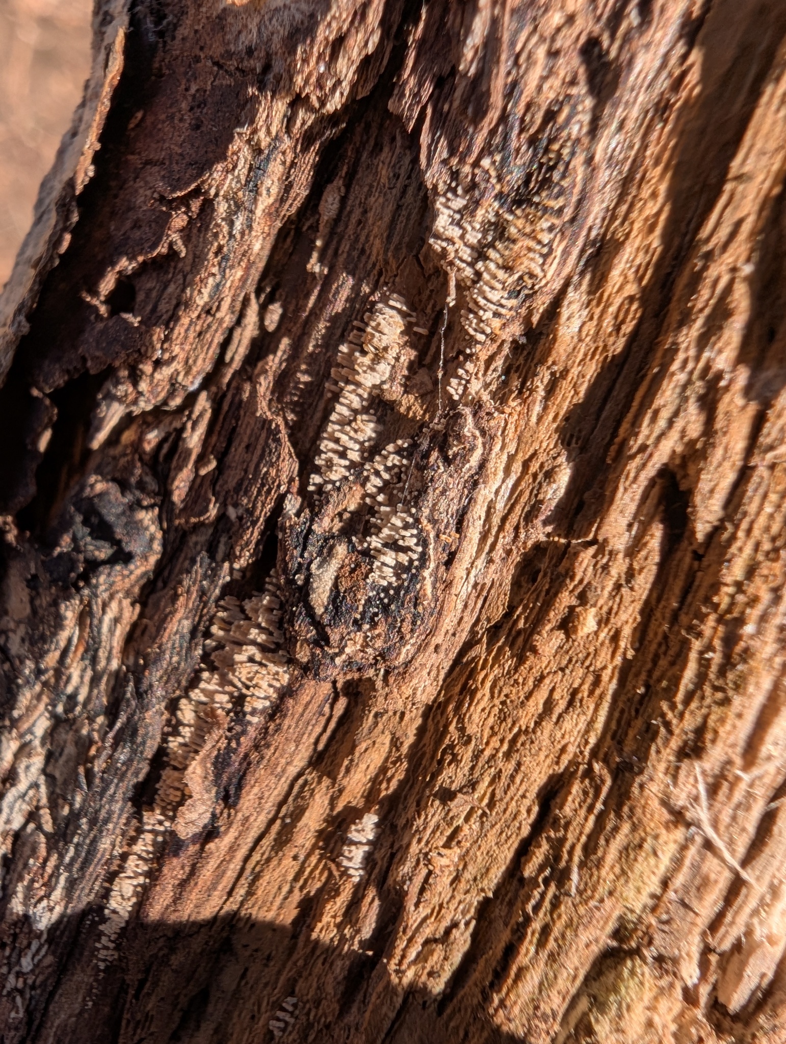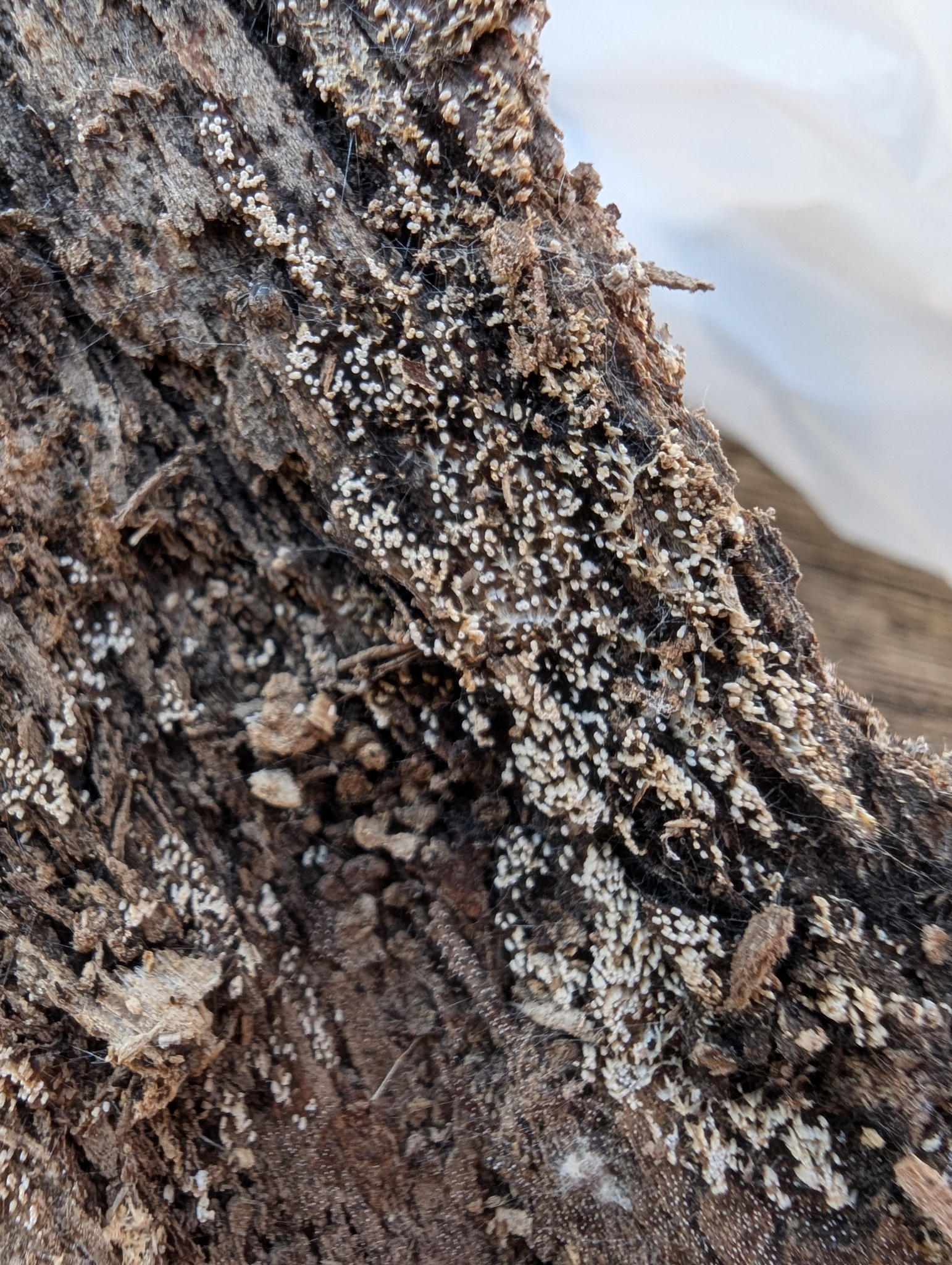Fruchtkörper: Fruchtkörper zylindrisch, röhrenförmig, 2 — 6 mm lang, dichtstehend, in Herden von mehreren Zentimetern Länge, rasenförmig, filzig, seidenhaarig oder fast kahl, anfangs reinweiss, später blassbräunlich