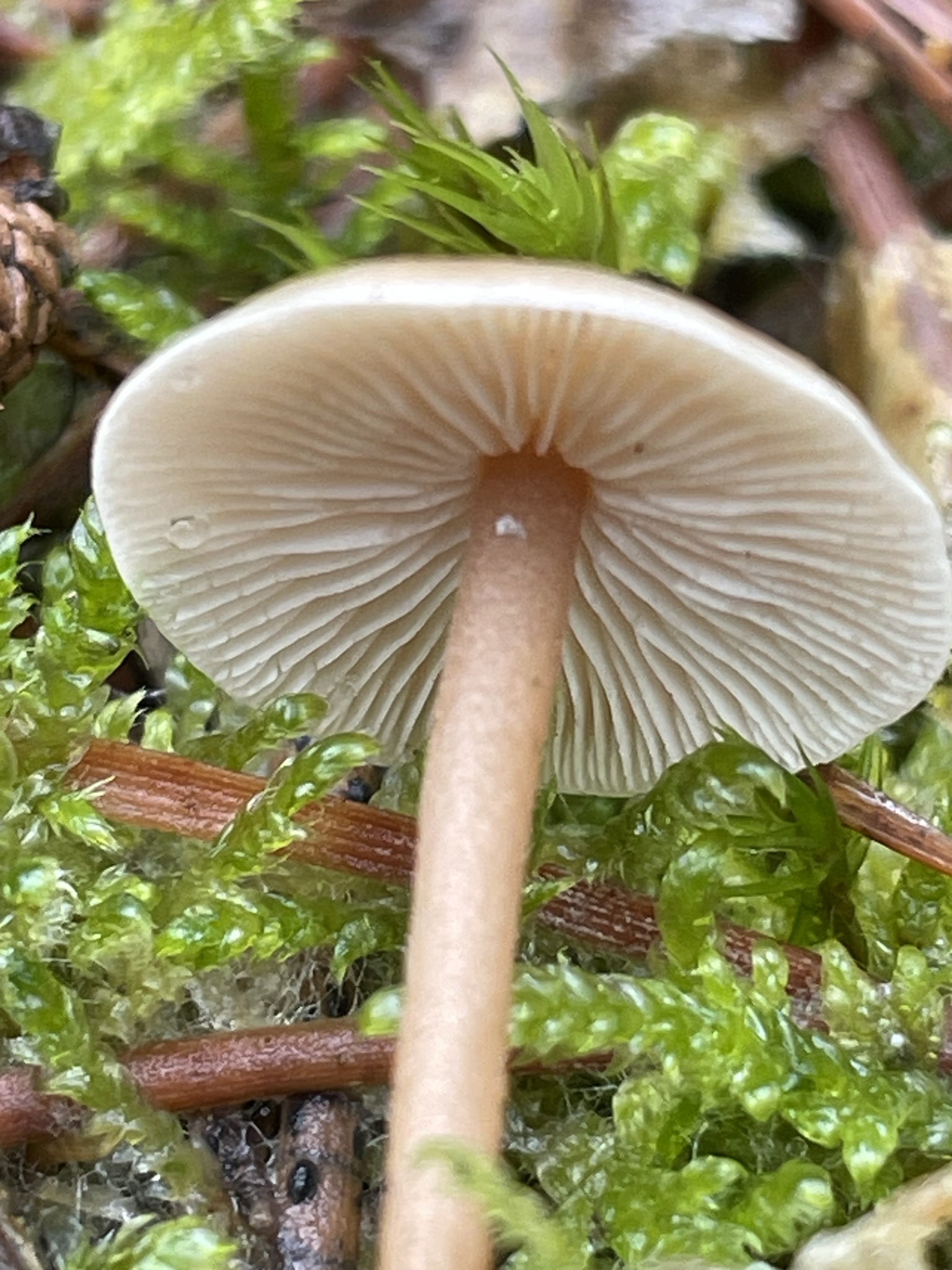 Lamellen: weiss, angeheftet bis fast nicht am Stiel angewachsen, bauchig, ziemlich entfernt stehend.