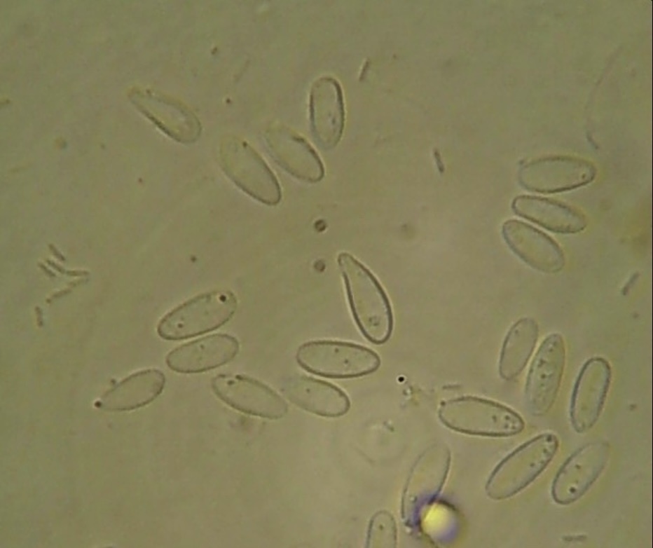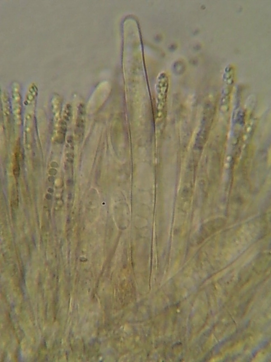 Sporen: Schläuche zylindrisch-keulenförmig, am Scheitel abgerundet, 70 — 90 µm lang, 7—9 µm breit. Sporen im oberen Drittel des Schlauches lagernd, schief zweireihig, elliptisch oder eiförmig, oft einseitig abgeflacht, 9—11 µm lang, 3 —4 µm breit. Paraphysen gleichmässig, etwa 3 µm breit.