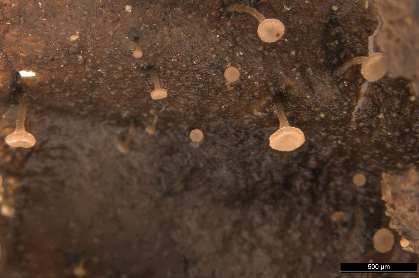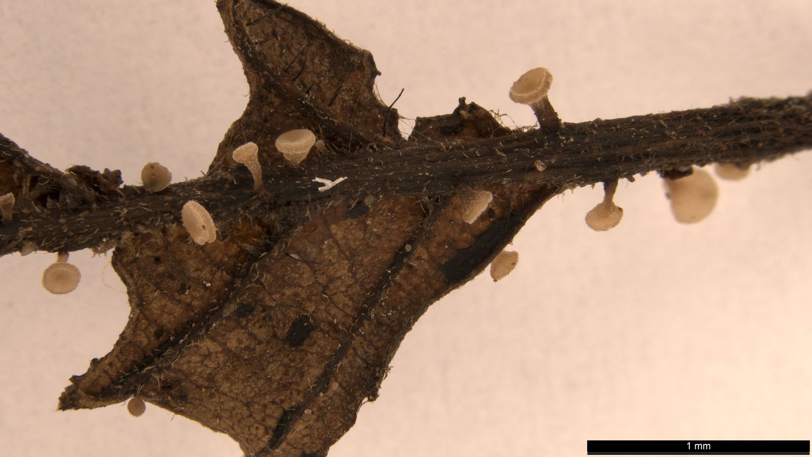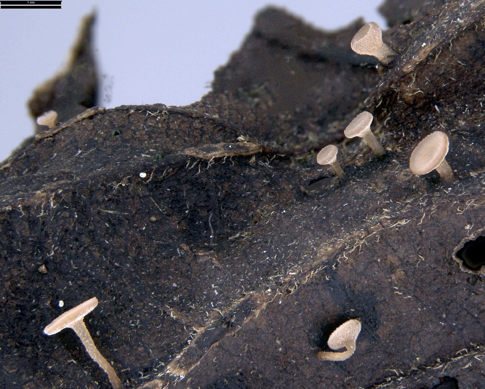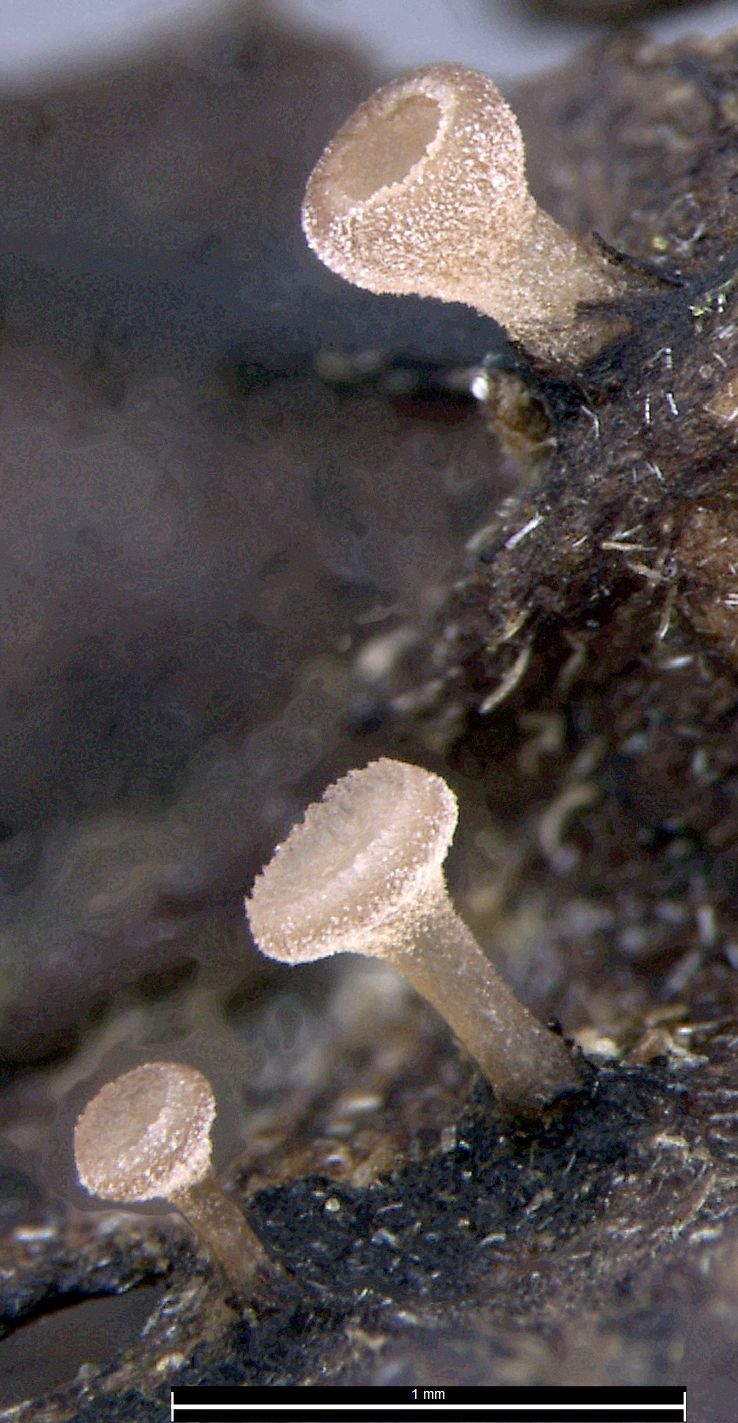 Fruchtkörper: Sclerotium lang gestreckt, flach aufsitzend, meist 4—10 mm lang, aber auch länger, 1—2 mm breit, aussen schwarz, längsrunzelig, innen weiss. Fruchtkörper gestielt. Stiel 4—6 mm lang, kaum 0,5 mm breit, braun, am Grunde schwärzlich, frisch, sehr fein flaumig. Becher anfangs halbkugelig, später schüssel-, zuletzt tellerförmig mit schwach umgebogenem Rande, 1—2 mm breit, lederbraun. Scheibe etwas dunkler. Schläuche 90—110 µm lang, 6—7 µm breit, achtsporig.