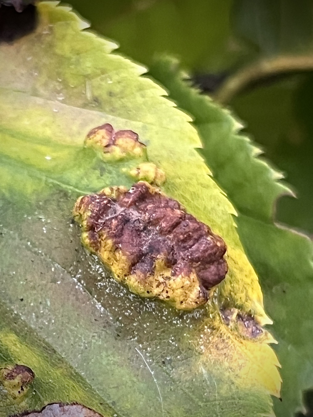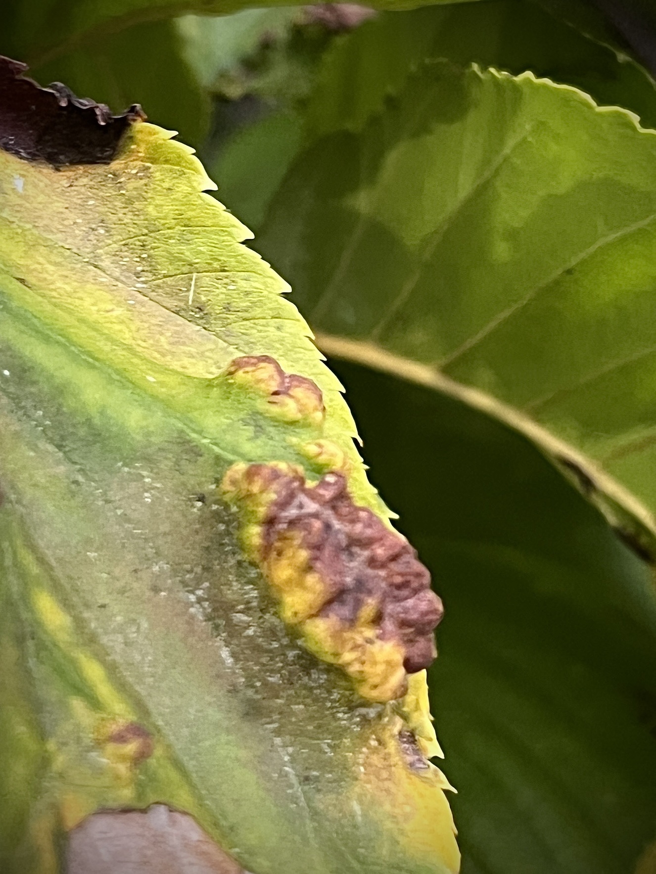 Oberfläche, Hülle: Mycel in den Blättern verbreitet, blasenartige, fleischrote Auftreibungen hervorrufend.