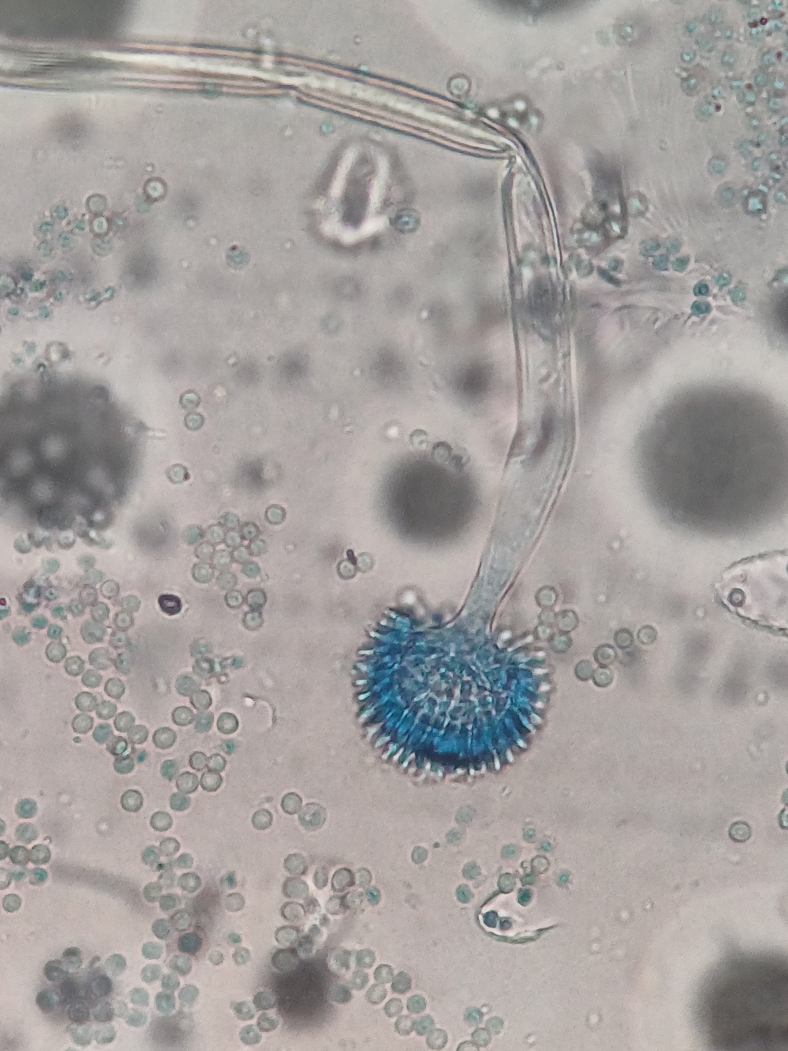 Fruchtkörper: Rasen grüngelb bis bräunlichgrün, im Alter bis dunkelbraun. Konidienträger unter 1 mm hoch, mit hellem, warzigem, 7 bis 10 µm dickem, zuweilen septiertem Stiel und kugeliger bis keuliger, selten scharf abgesetzter, 30—40 µm dicker Endblase. Sterigmen unverzweigt, dicht gedrängt, allseitig strahlig oder mehr am Scheitel stehend, bis 20 µm lang, 6 µm breit. Konidien meist kugelig, 4—8 µm im Durchmesser, glatt, selten feinkörnig. Bildet kleine rundliche, knollige, steril bleibende Sklerotien von 0,7 mm Durchmesser und höckeriger Oberfläche.