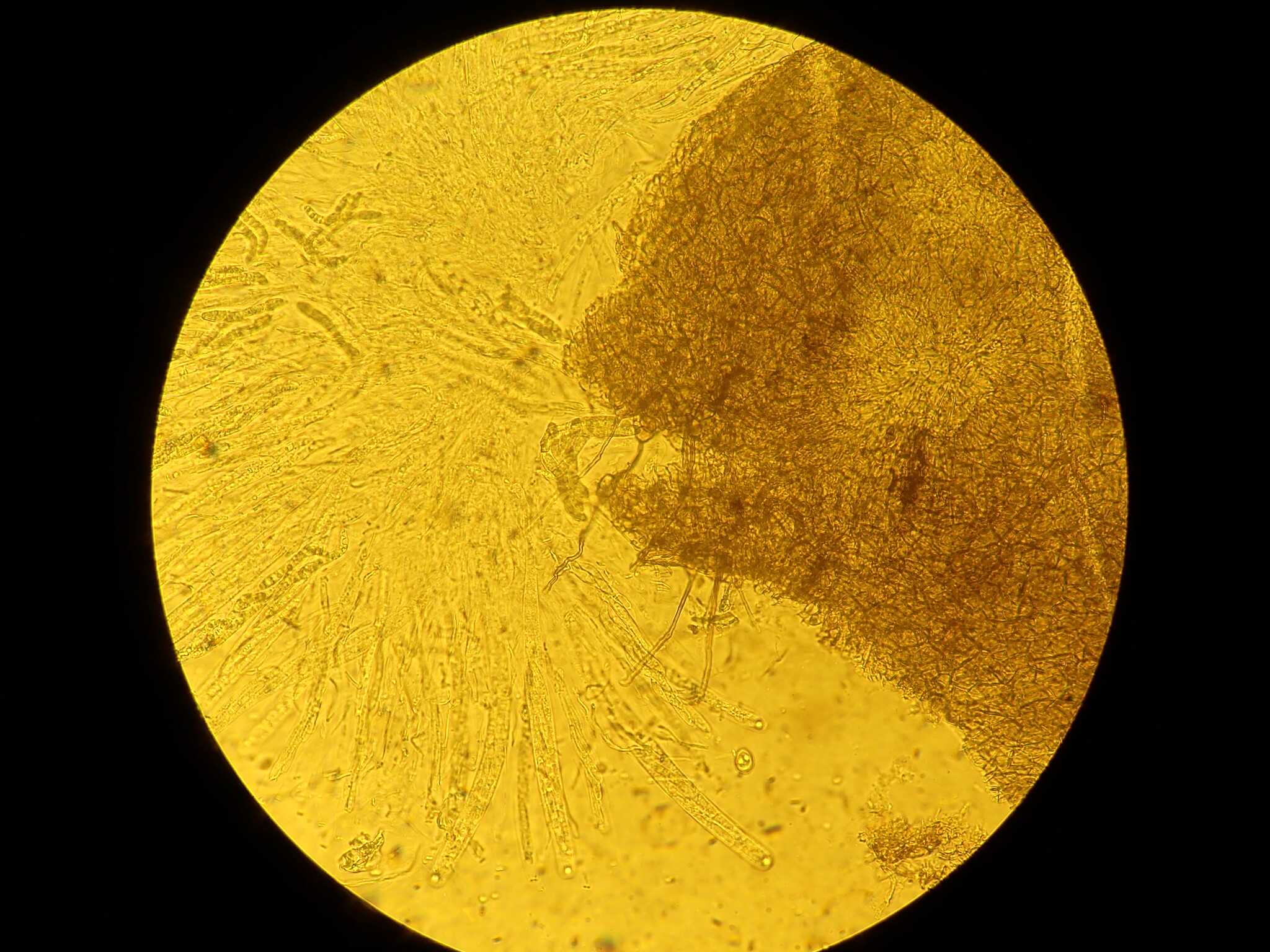Sporen: Schläuche ellipsoidisch-zylindrisch, gestielt, oben abgerundet, mit kugeligem Körperchen, achtsporig, im sporentragenden Teil 150—170 µm lang, 10—15 µm breit. Sporen unregelmässig gelagert, anfangs zylindrisch, wurmförmig gekrümmt, beiderseits mit einem kurzen, borstenförmigen Anhängsel, farblos, 45—55 µm lang, 4—5 µm breit, später gestreckt ei- oder birnförmig, unten abgeflacht, braun, mit einem langen zylindrischen, farblosen, am Ende oft kniet'örmig gebogenen Anhängsel, an welchem ebenso' wie am anderen Sporenende ein kurzes, gekrümmtes, spitzes, borstenförmiges Anhängsel ansitzt; Anhängsel 24—30 µm lang, 4 µm breit, Spore 25-20 µm lang, 7—10 µm breit. Paraphysen fädig, verklebt.