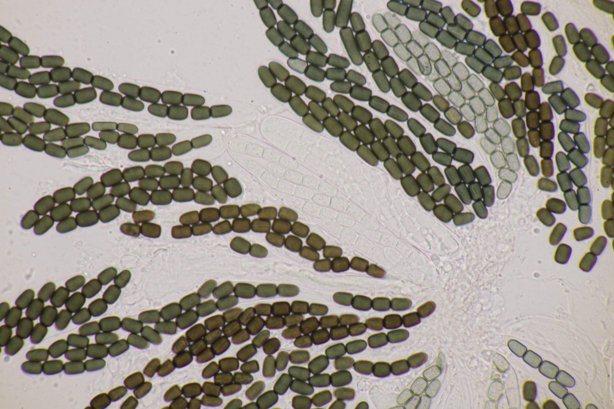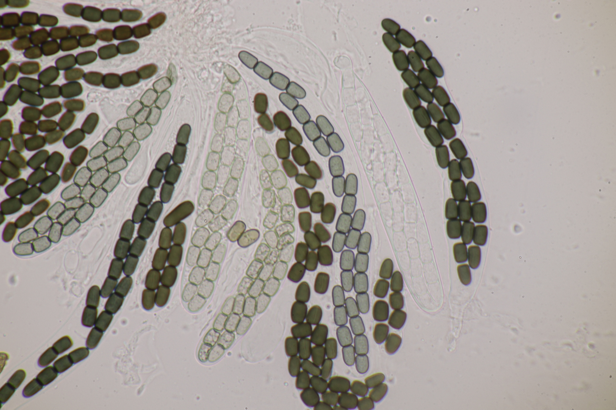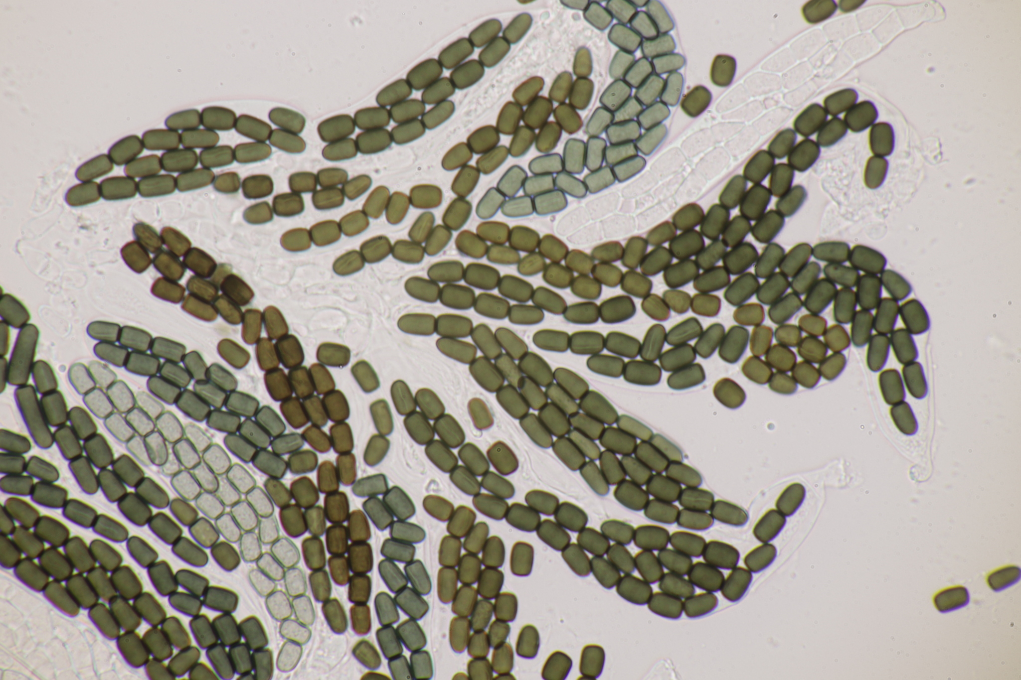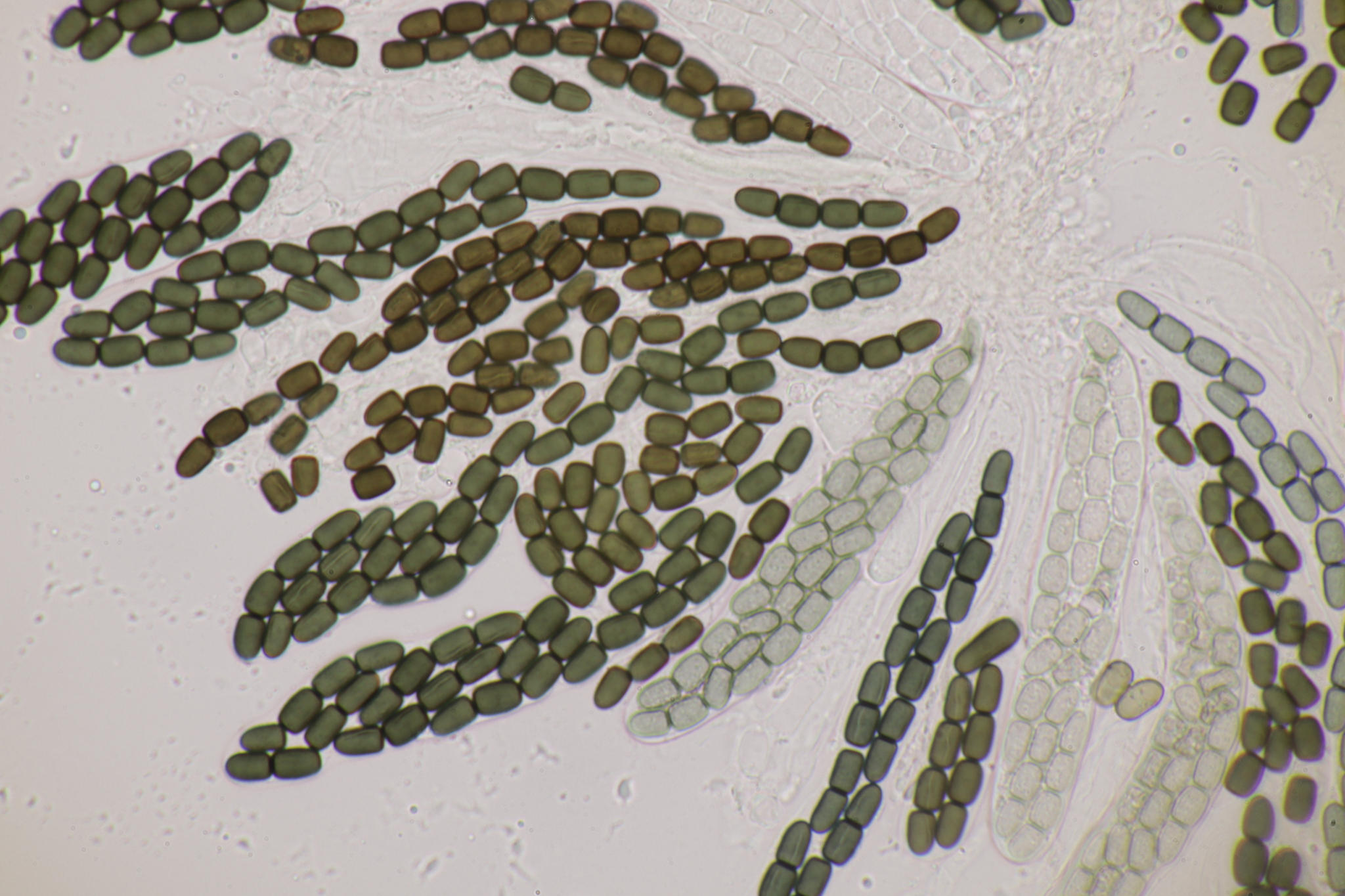 Sporen: Schläuche länglich ellipsoidisch oder fast zylindrisch, mit kurzem abgesetzten Stiele, 80—85 µm lang, 11—15 µm breit, achtsporig. Sporen zweireihig, zylindrisch, gerade oder schwach gekrümmt, mit abgerundeten Enden, 28 — 30 µm lang, 4—6 µm breit, vierzellig, leicht in die vier Glieder zerfallend; Membran braun, mit weiter Gallerthülle. Paraphysen verklebt.