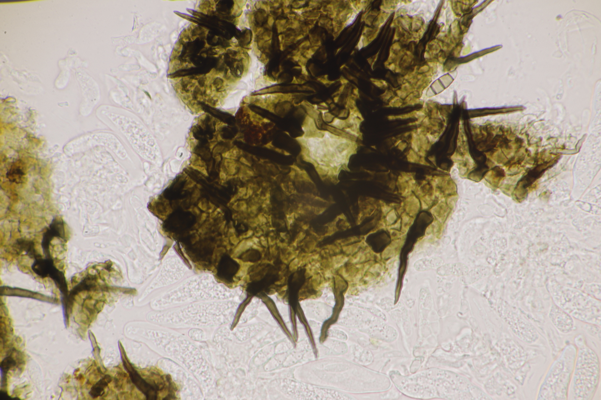 Fruchtkörper: Fruchtkörper gesellig, gewöhnlich dichtstehend, in strahlig angeordneten Gruppen, die oft zusammenfliessen, kugelig, sehr klein, mit abgerundetem Scheitel und glatter, durchbohrter Mündung. Peridium häutig, schwarz, mit abstehenden, schwarzen, pfriemlichen Borsten besetzt.