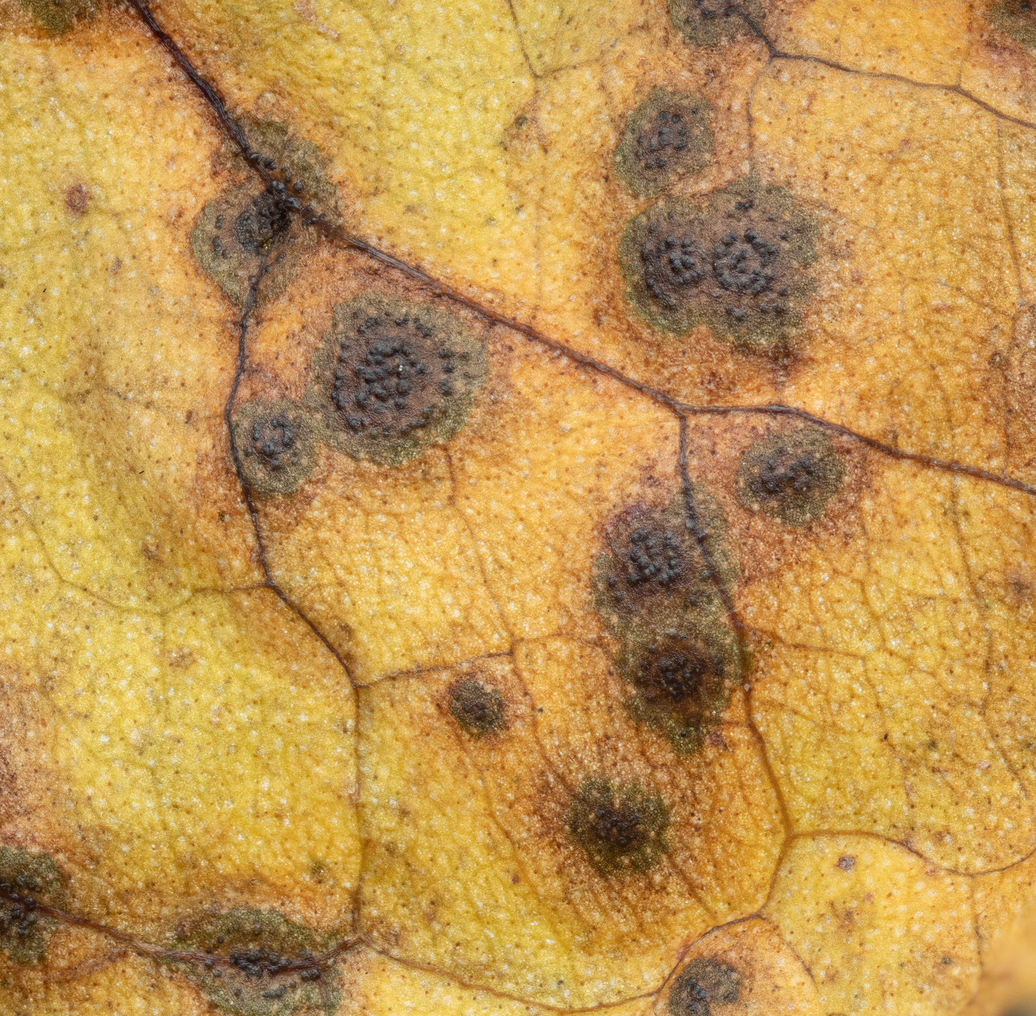 Fruchtkörper: Fruchtkörper gesellig, in kleinen Gruppen auf bräunlichen, purpurn oder braun umrandetem, etwa 2 mm breitem, kreisförmigein Flecken ziemlich dichtstehend, kugelig, halb vorragend, etwa 0,1 bis 0,15 mm breit. Peridium schwarz, häutig, glatt.