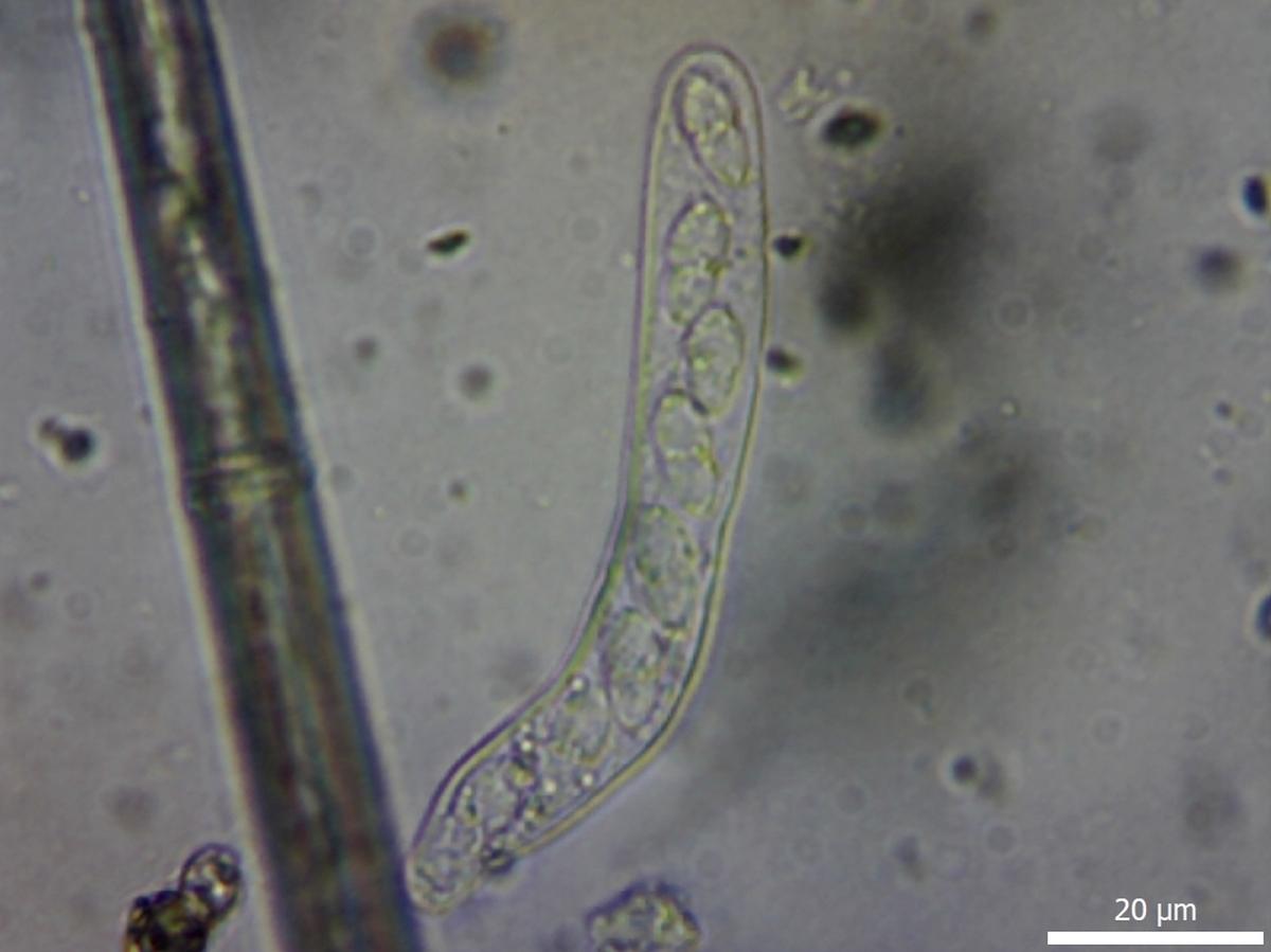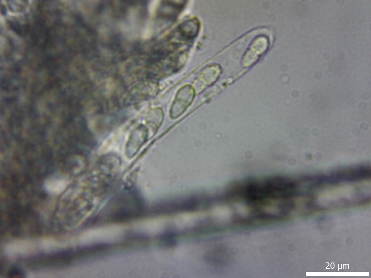 Sporen: Schläuche zylindrisch-keulenförmig, 35—44 µm lang, 9—11 u breit, achtsporig. Sporen zweireihig, ei-keulenförmig, etwa 10—13 µm lang. 3,5—4,5 µm breit, zweizeilig. Membran hellgrünlich.
