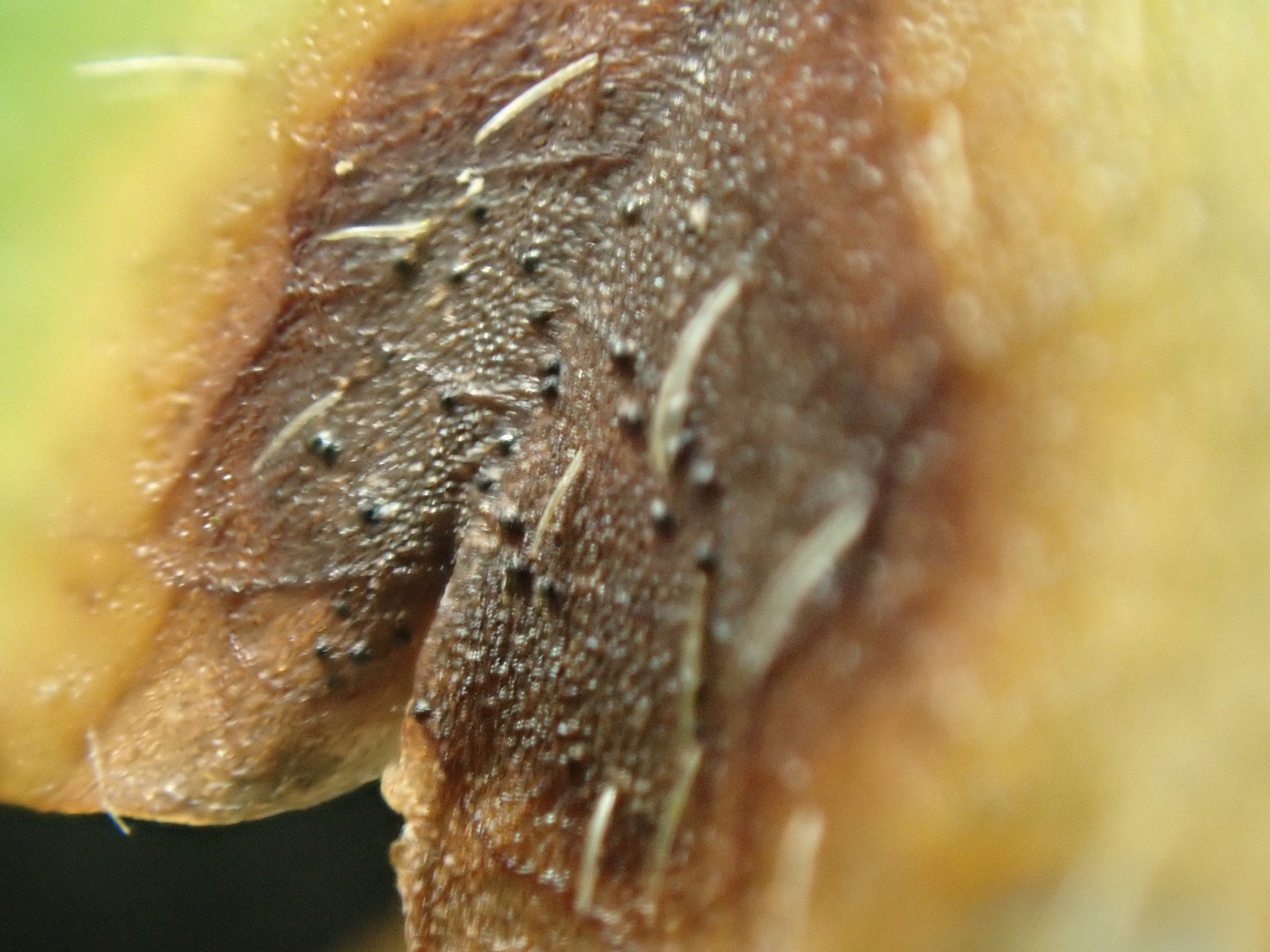 Fruchtkörper: Fruchtkörper gesellig, in kleiner Zahl, in der Mitte weisslicher oder bräunlicher, aus abgestorbenem Gewebe gebildeter, purpurrot oder braun berandeter, kreisförmiger, 2—3 mm breiter Flecken sitzend, kugelig, 40—46 µm breit, schwarz, hulbkugelig vorragend.