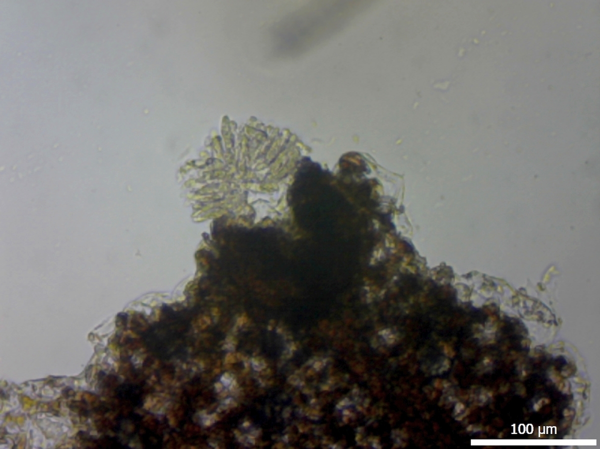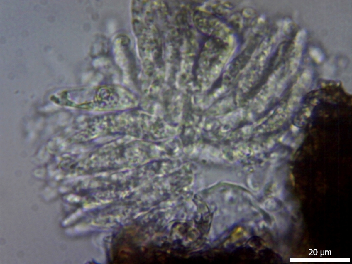 Sporen: Schläuche büschelig, sackförmig, unten breiter, sehr kurz gestielt, 34—36 µm lang, 8—10 µm breit, achtsporig. Sporen zweireihig, ellipsoidisch- spindelförmig, mit stumpfen Enden, 9—14 µm lang, 3—3,5 \x breit, in der Mitte mit einer Scheidewand, nicht eingeschnürt, farblos.
