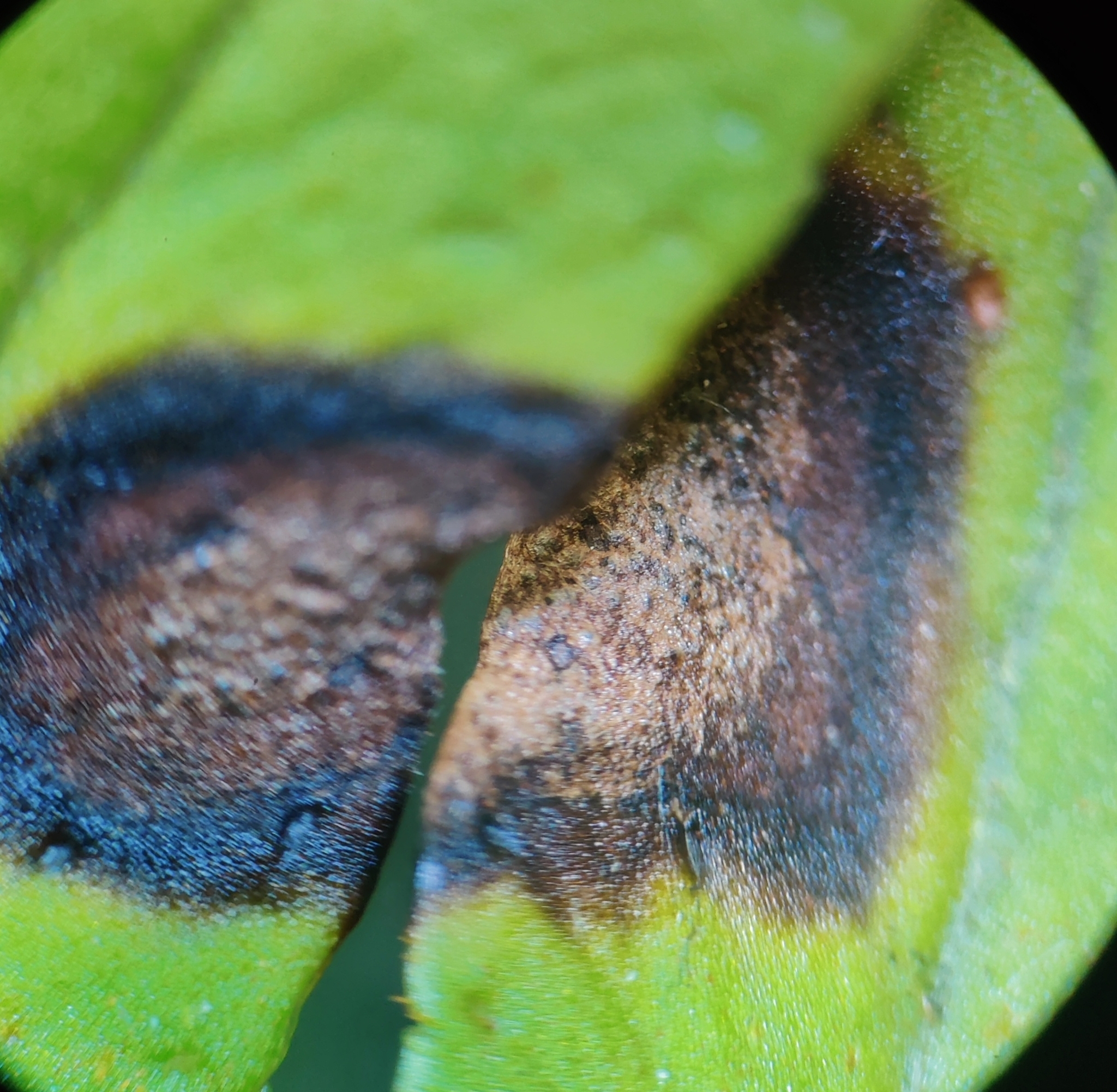 Fruchtkörper: Perithecien locker herdenweise auf unregelmässigen, vertrockneten, in der Mitte graubraunen, am Rande dunkelbraunen, von weitem, gelblichem Hofe umsäumten, ziemlich grossen, bis 10 mm breiten Flecken, oberseits stehend, halb eingesenkt, kugelig, braun, zarthäutig.