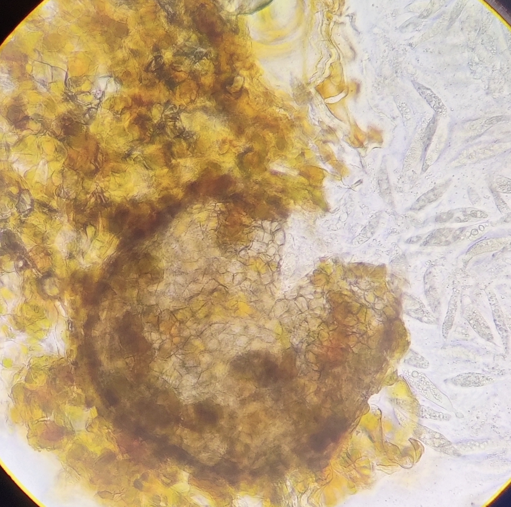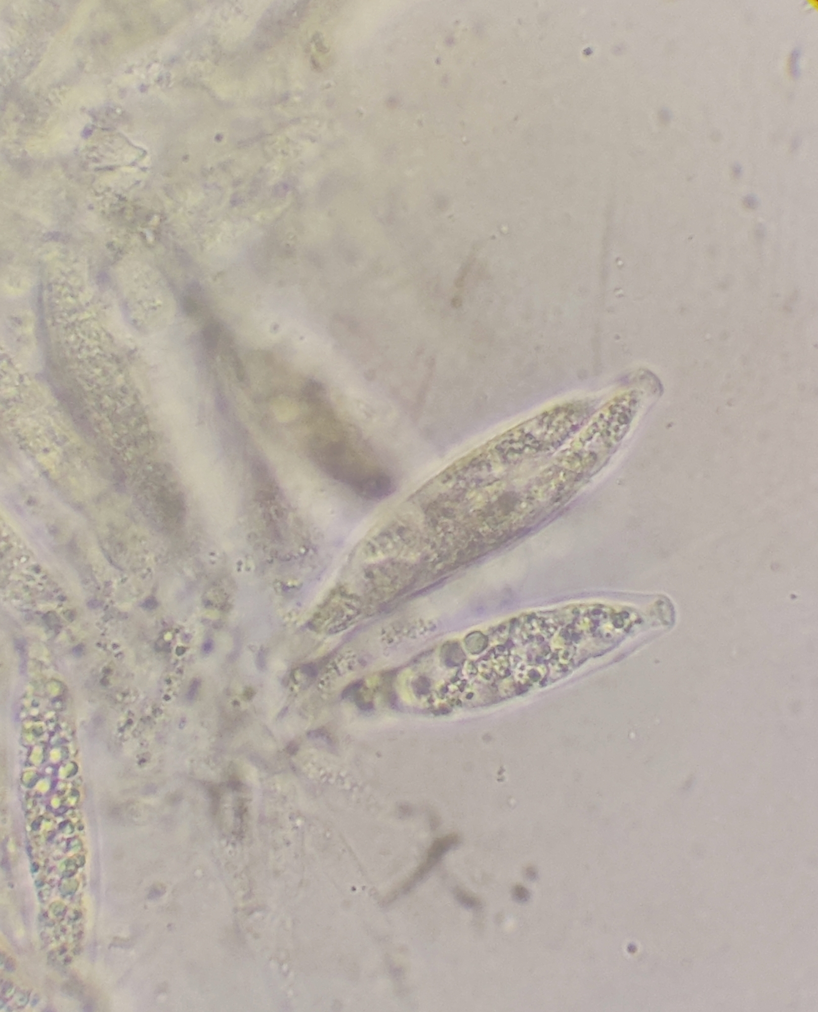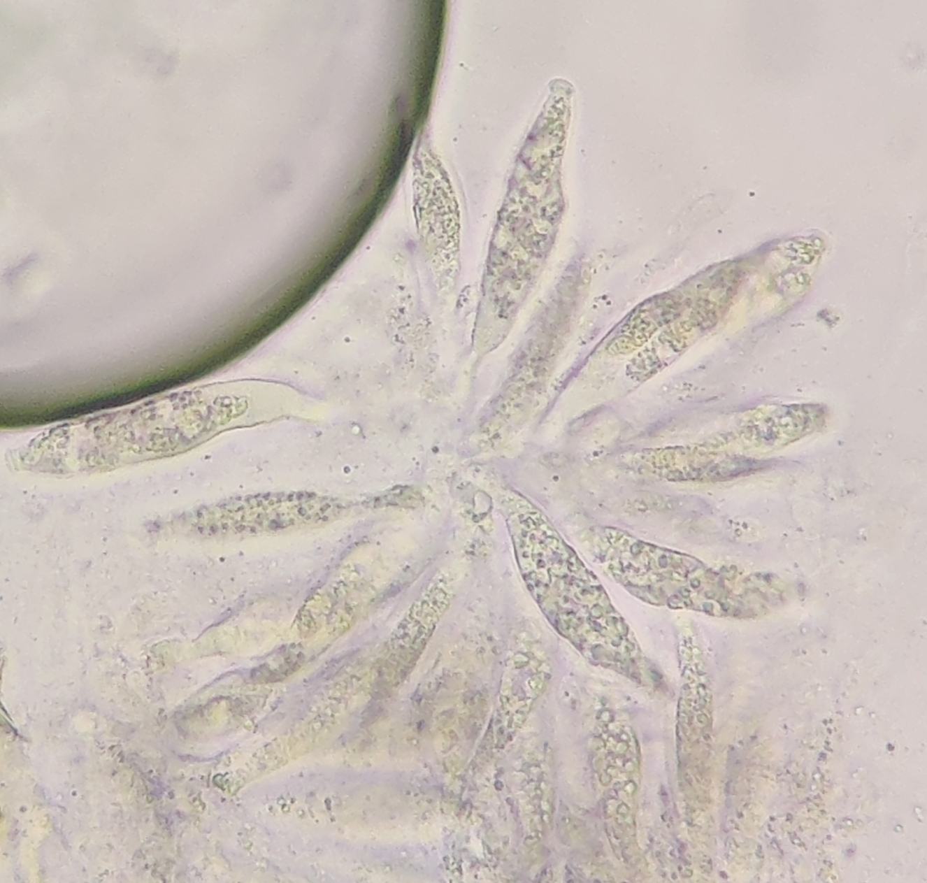 Sporen: Schläuche länglich-schwach keulig, nach unten mehr verschmälert als nach oben, achtsporig, 47—52 µm lang, 14 µm dick. Sporen ordnungslos gelagert, länglich -spindelförmig, farblos, 17—19 µm lang, 5—6 µm dick.
