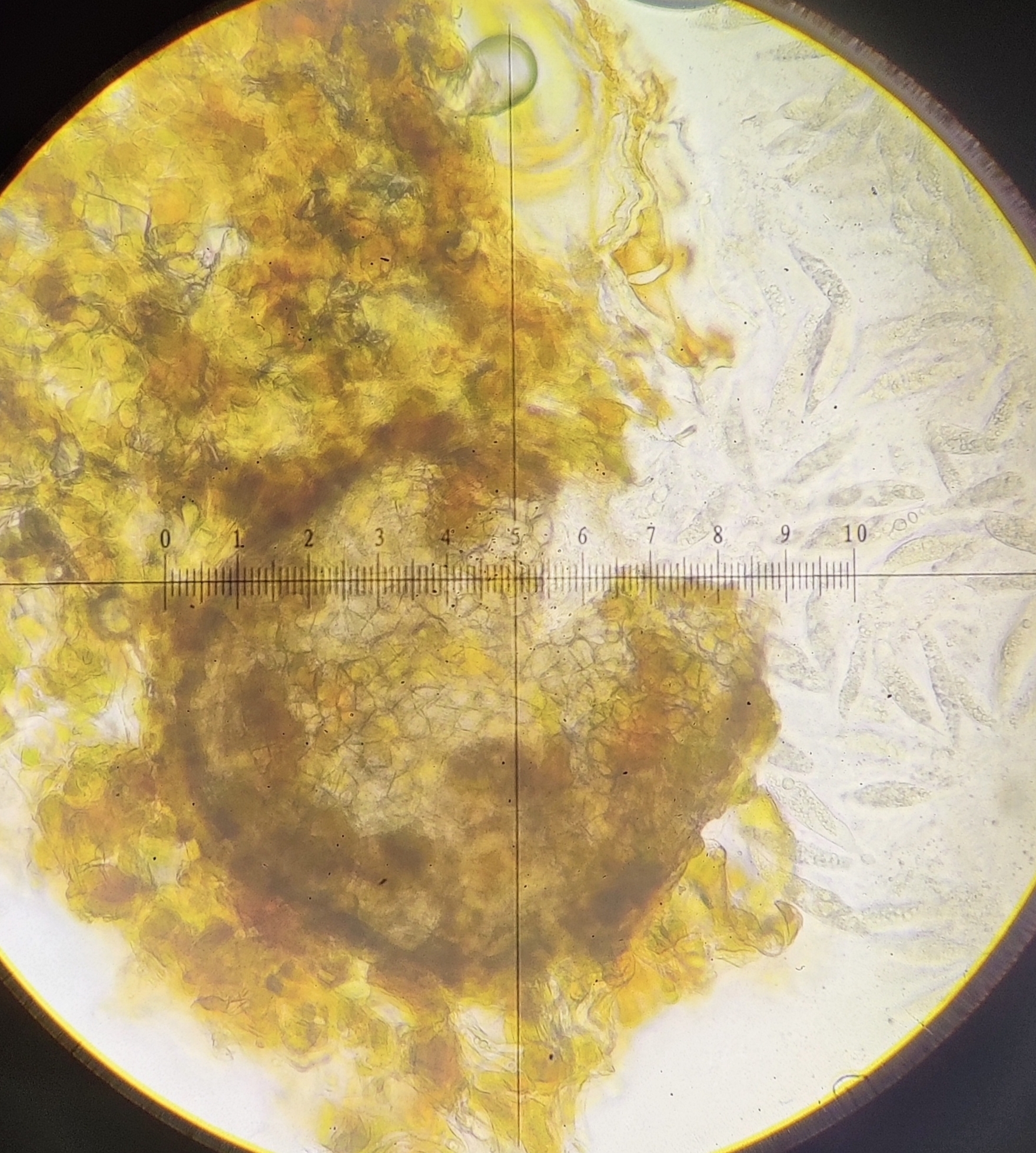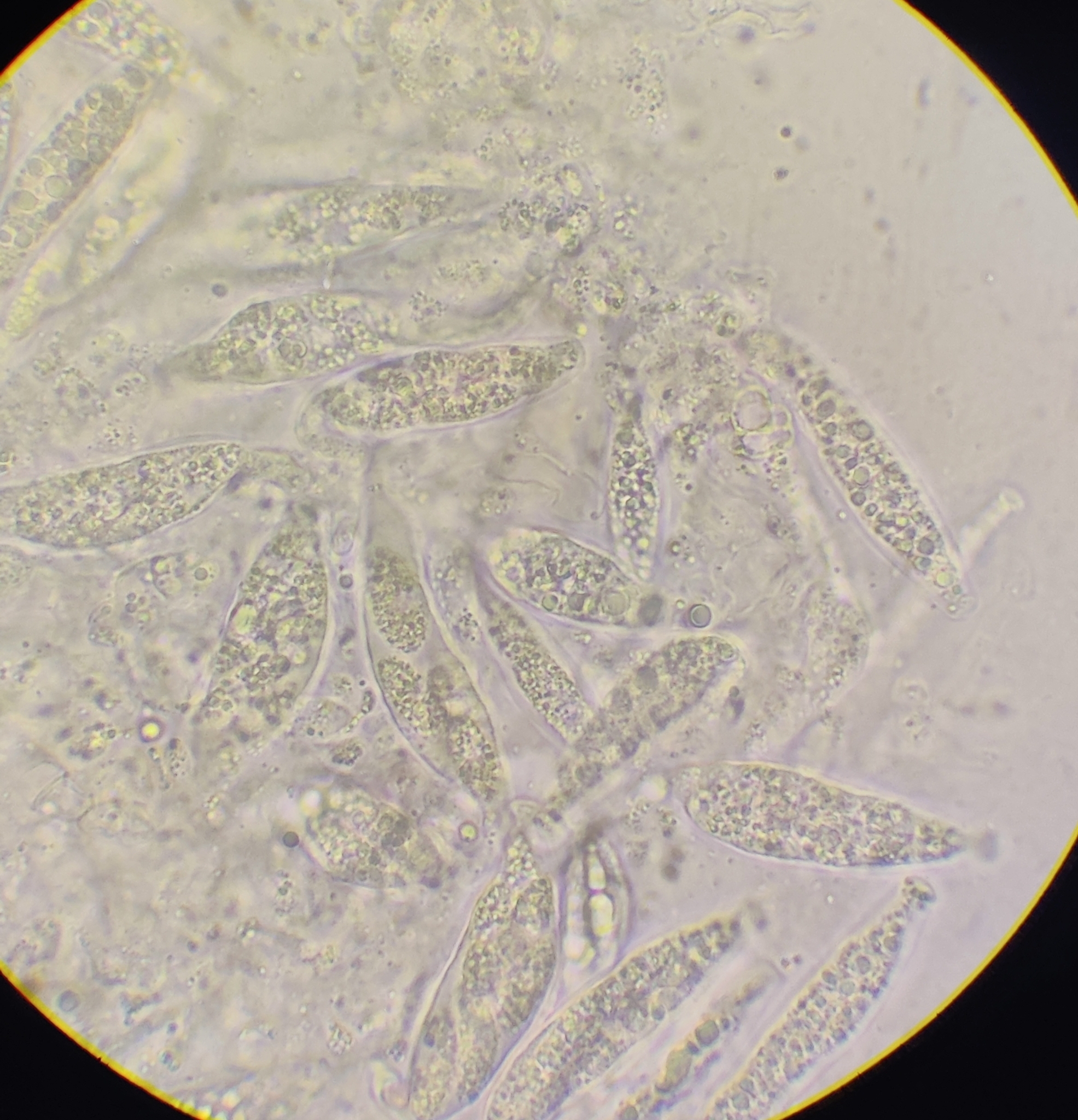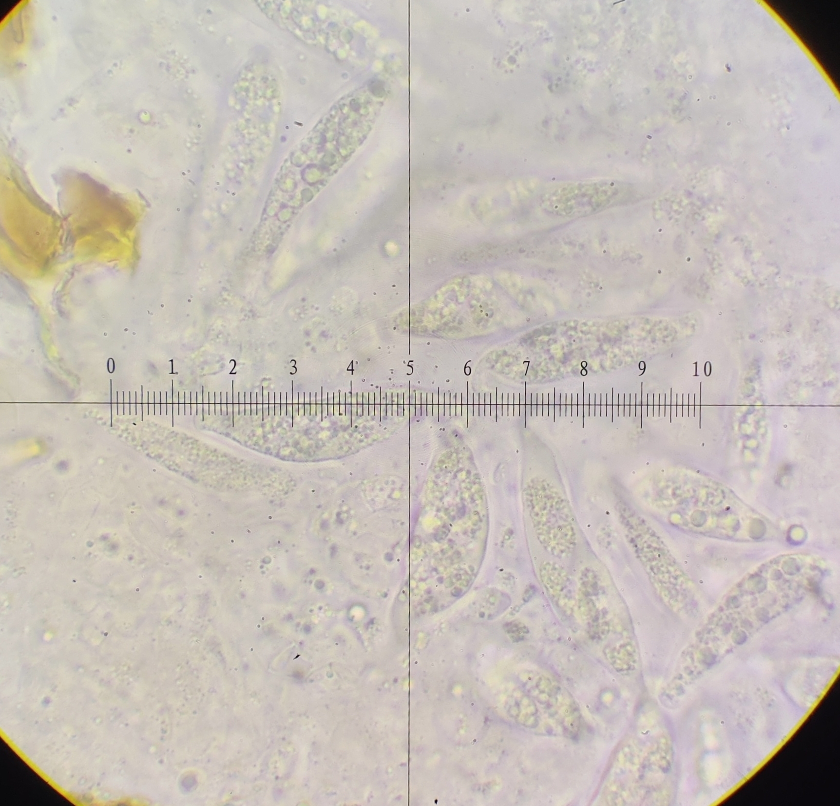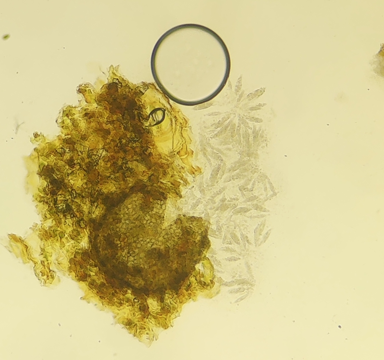 Sporen: Schläuche länglich-schwach keulig, nach unten mehr verschmälert als nach oben, achtsporig, 47—52 µm lang, 14 µm dick. Sporen ordnungslos gelagert, länglich -spindelförmig, farblos, 17—19 µm lang, 5—6 µm dick.