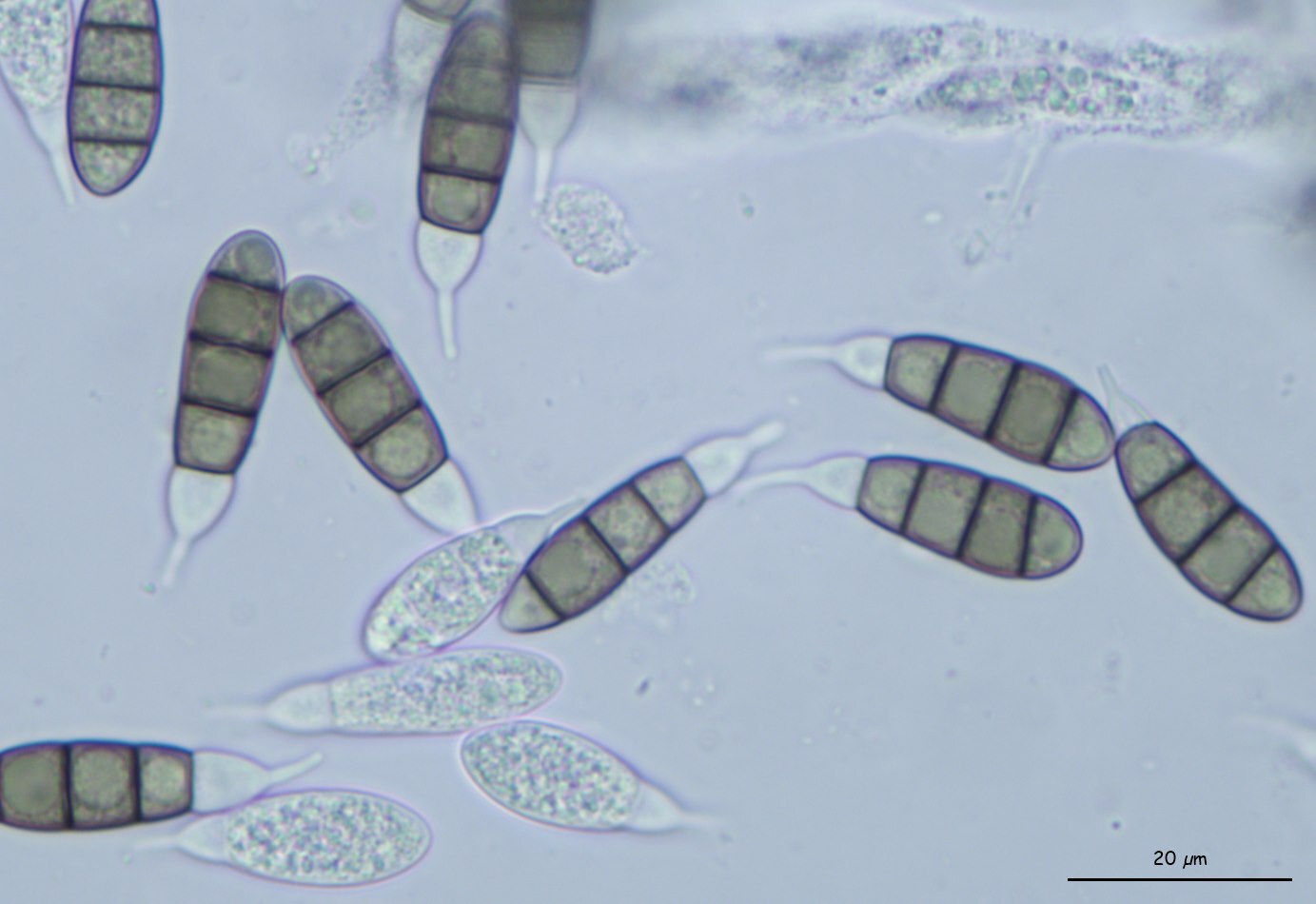 Sporen: Schläuche keulenförmig, dickwandig, achtsporig, 78—100 µm lang, 17 µm, dick. Sporen zweireihig, stumpf keulig, mit drei Querwänden, in jeder Zelle mit einem grossen Öltropfen, blassbraun, 18—21 µm lang, 6 µm dick, am Grunde mit farblosem, dornenförmigem, zweizeiligem, 6 µm langem Anhängsel. Paraphysen ästig, fädig.