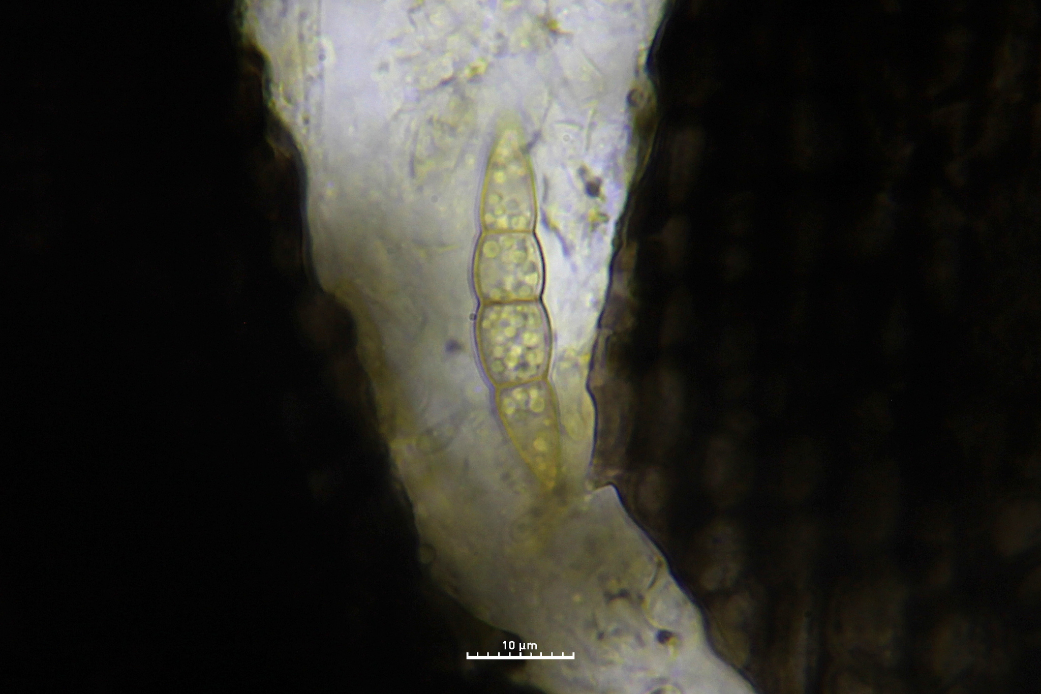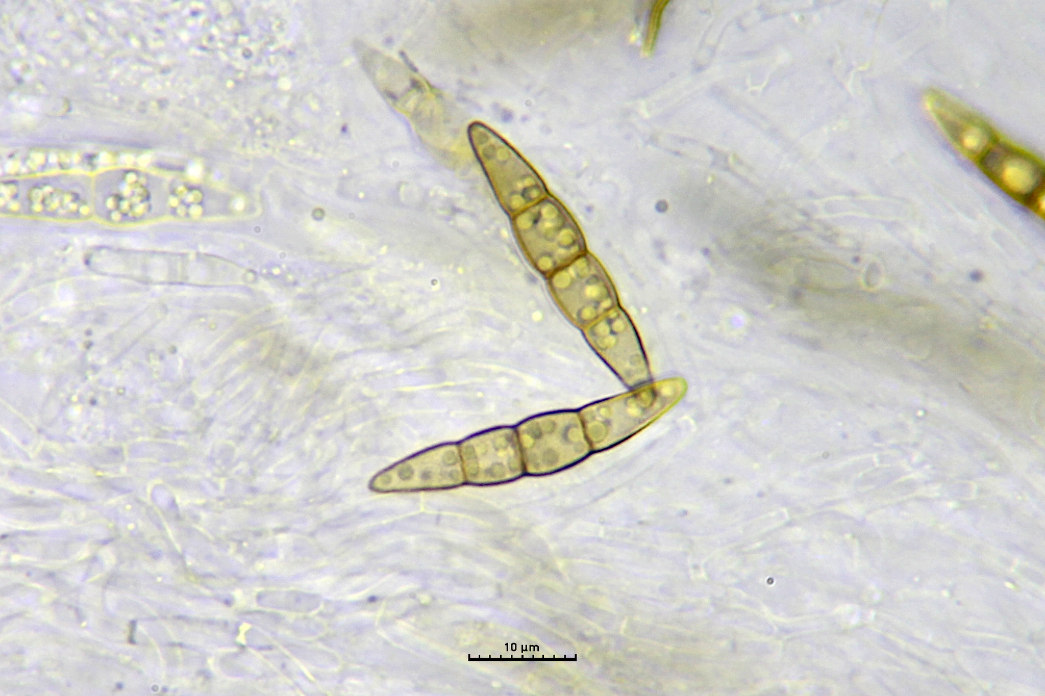 Sporen: Schläuche zylindrisch, 100—135 µm lang, 6—9 µm breit, achtsporig. Sporen einreihig, ellipsoidisch-spindelförmig mit stumpfen Enden, gerade oder schwach gekrümmt, 20—30 µm lang, 5—7 µm breit, vierzellig, an den Scheidewänden schwach eingeschnürt; Membran gelbbraun.