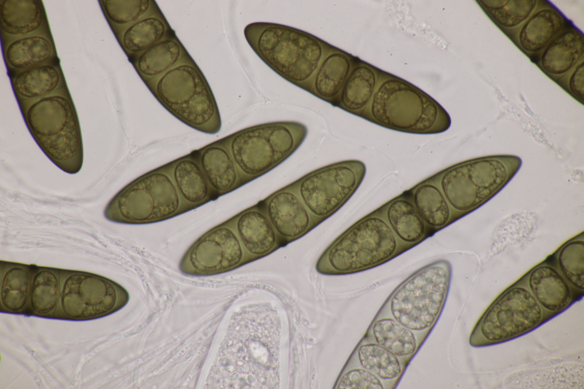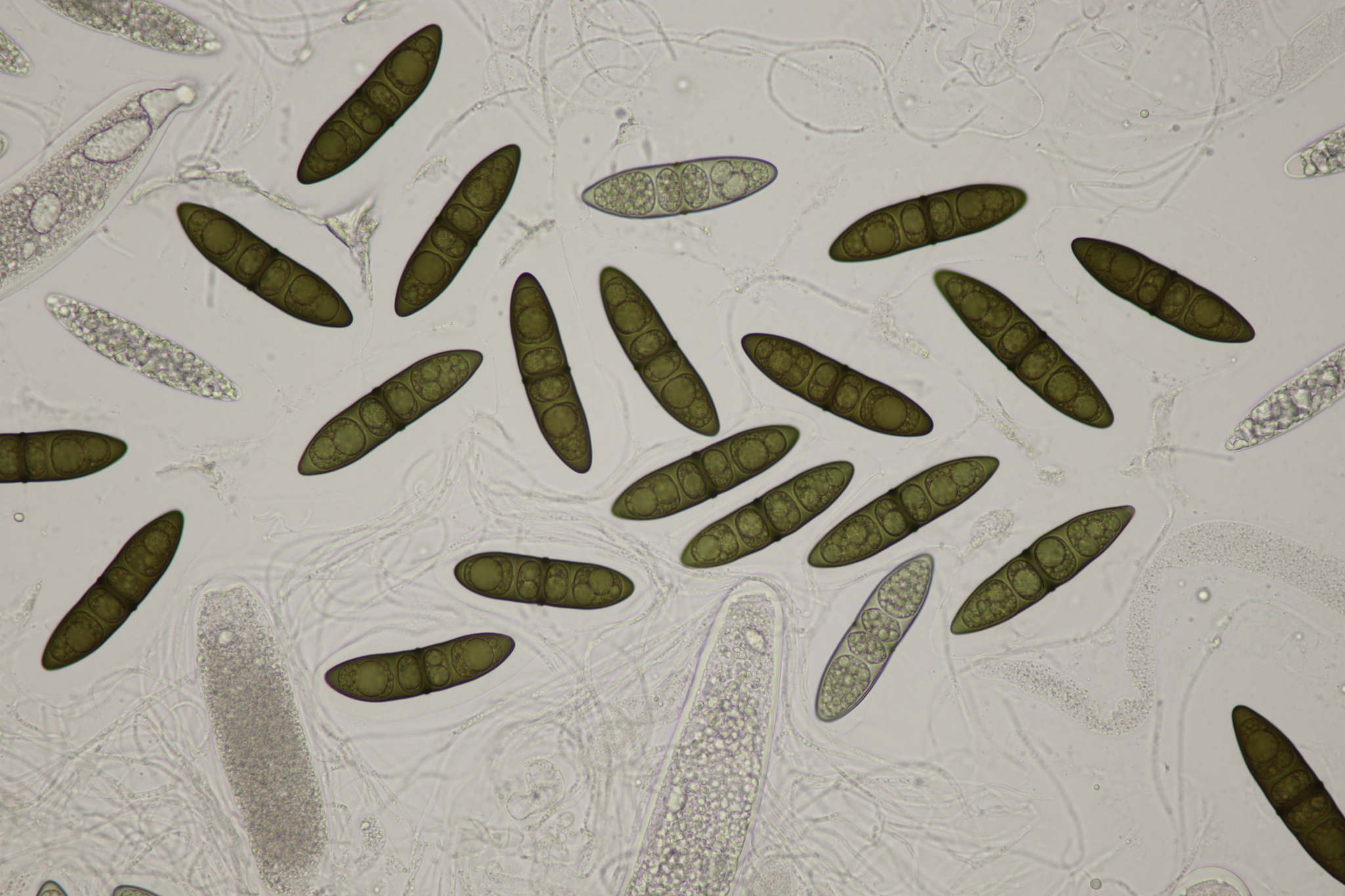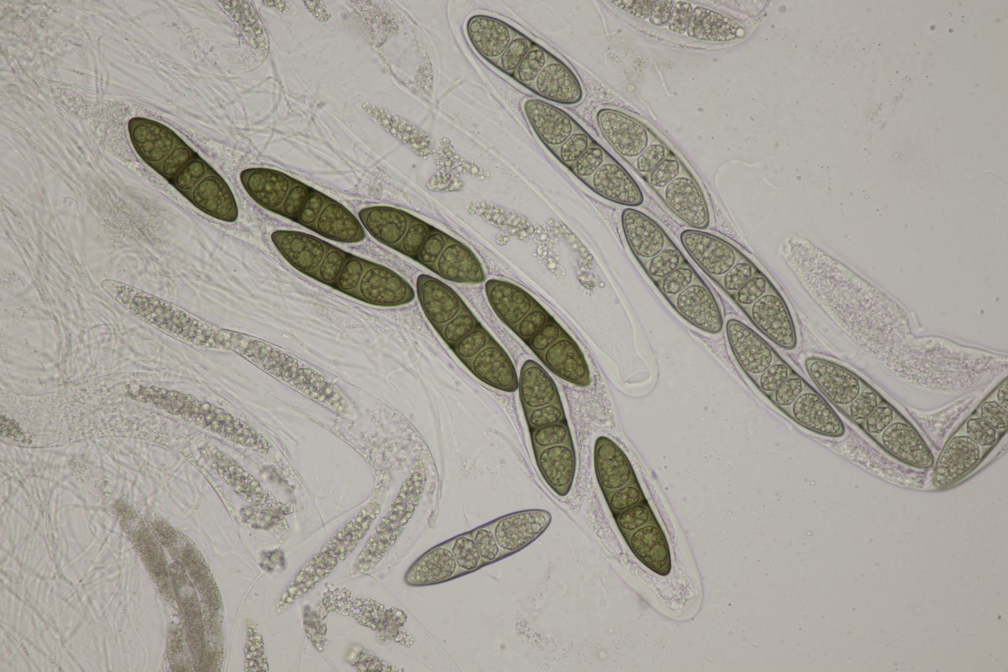 Sporen: Schläuche sackförmig, kurz gestielt, 200—300 µm lang, 45—60 µm breit, achtsporig. Sporen unordentlich zweireihig, ellipsoidisch- spindelförmig, nach beiden Enden verschmälert, 65—100 µm lang (meist 70—80), 20—24 \i breit, durch drei Querscheidewände vierzellig, jede Zelle mit einem grossen Öltropfen; Membran olivenbraun; mit weiter Gallerthülle. Paraphysen fadenförmig.