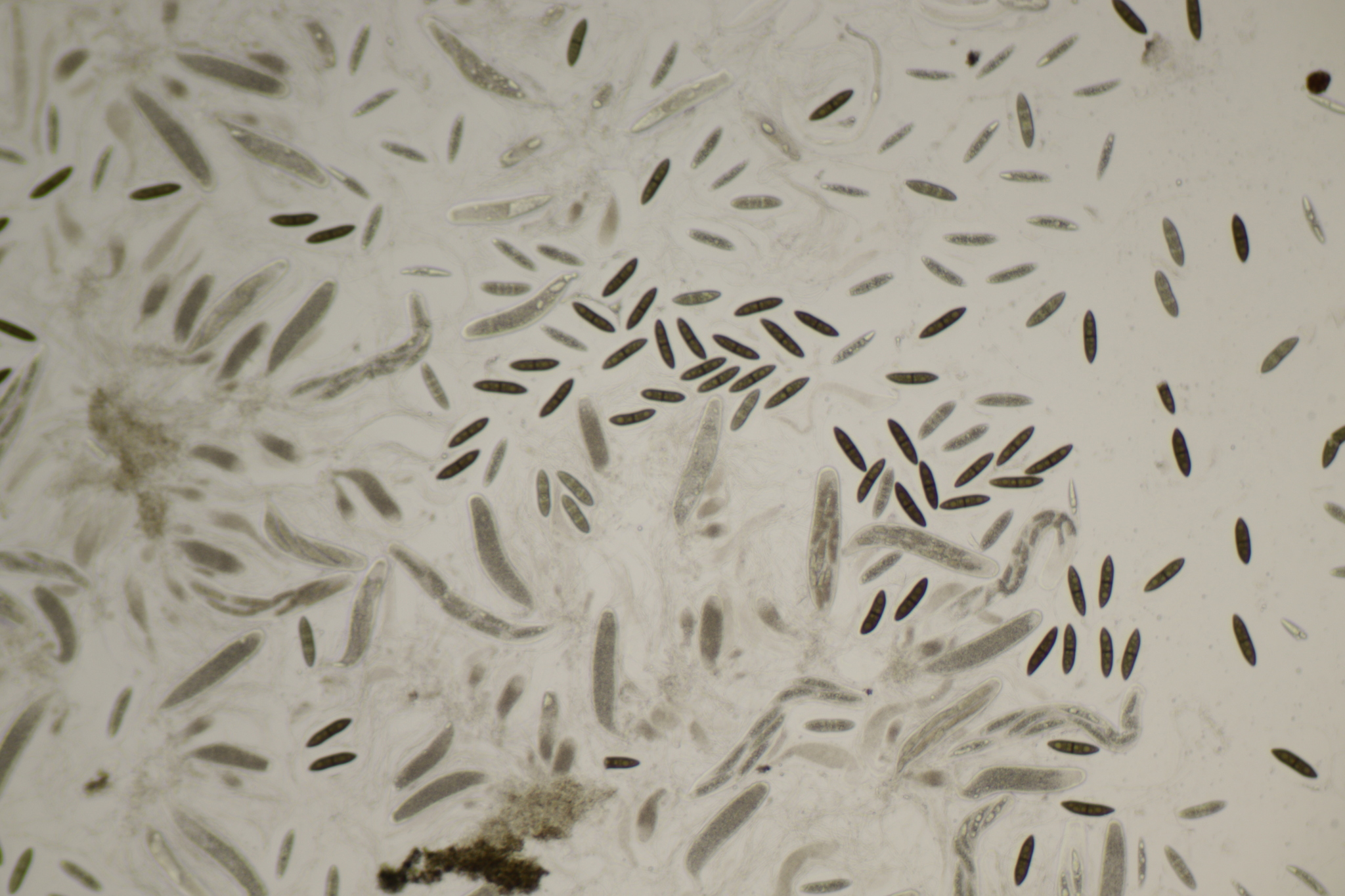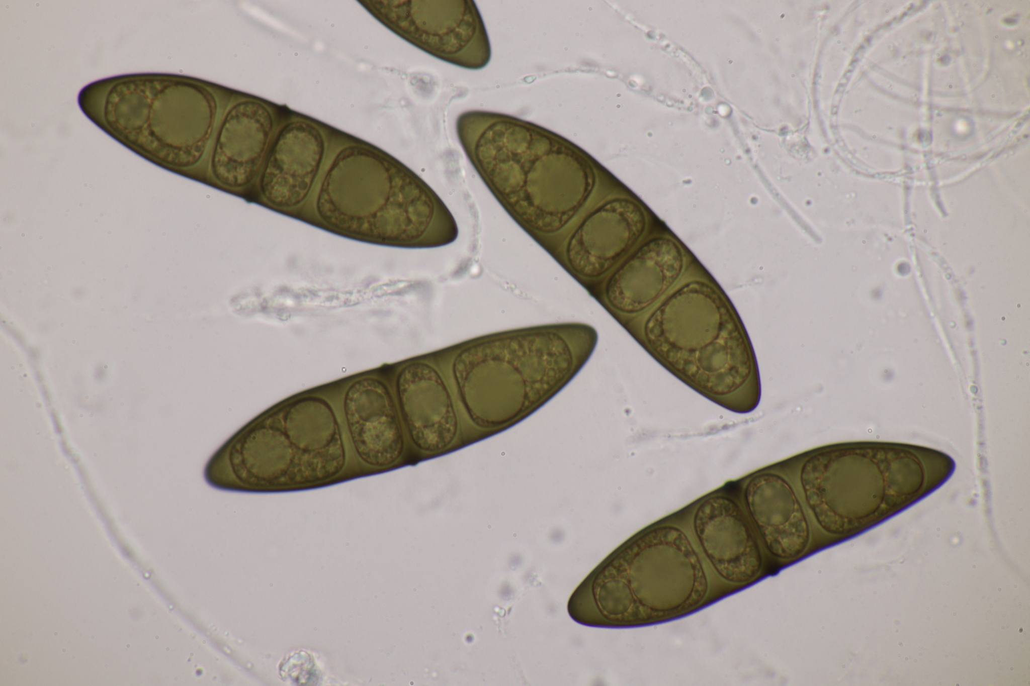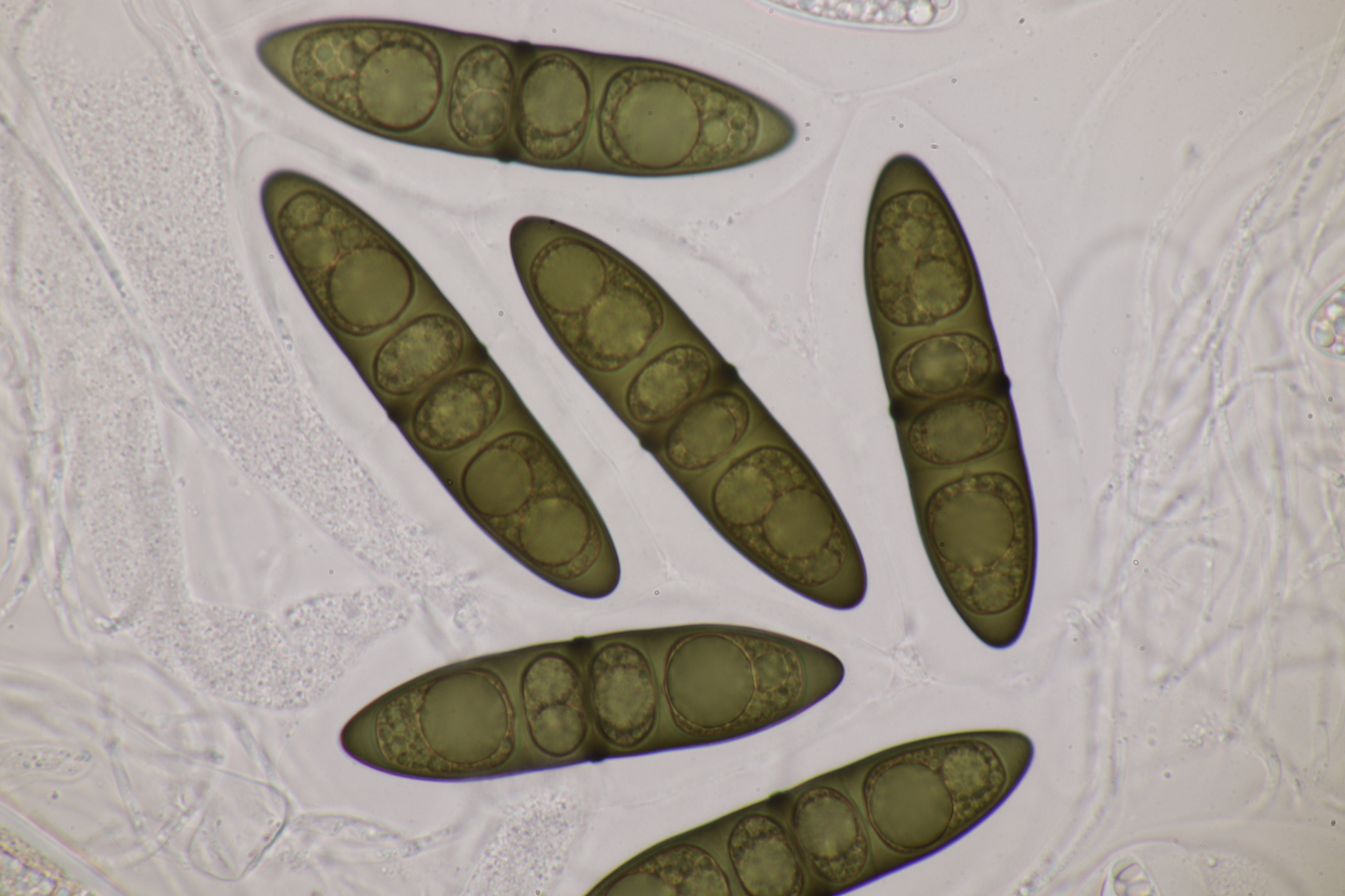 Sporen: Schläuche sackförmig, kurz gestielt, 200—300 µm lang, 45—60 µm breit, achtsporig. Sporen unordentlich zweireihig, ellipsoidisch- spindelförmig, nach beiden Enden verschmälert, 65—100 µm lang (meist 70—80), 20—24 \i breit, durch drei Querscheidewände vierzellig, jede Zelle mit einem grossen Öltropfen; Membran olivenbraun; mit weiter Gallerthülle. Paraphysen fadenförmig.
