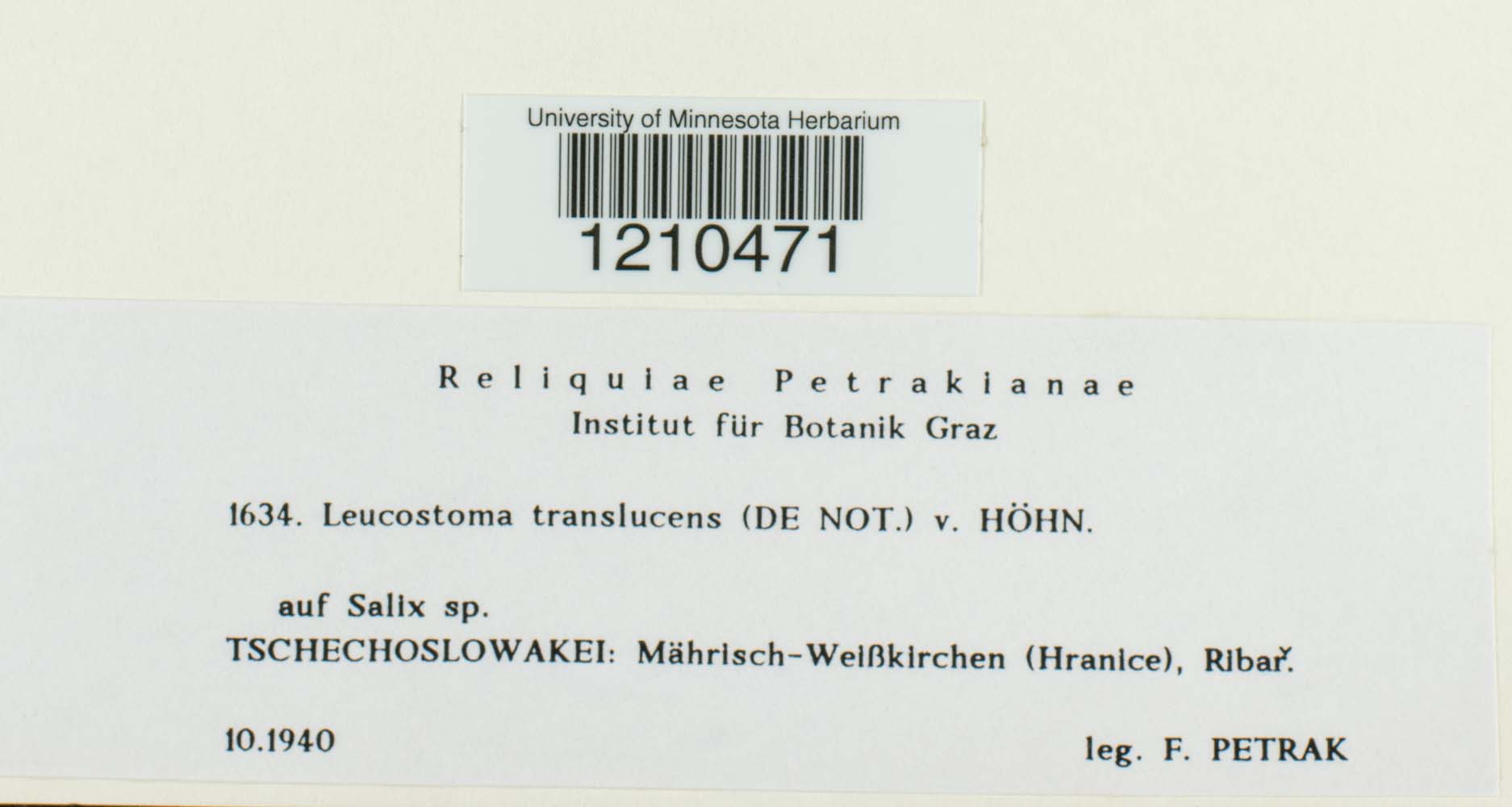 Sporen: Schläuche keulenförmig oder ellipsoidisch, sitzend, 40—44 \x lang, 8 µm breit, achtsporig. Sporen zusammengeballt, zylindrisch, gekrümmt, 9—14 µm lang, 2 µm breit, farblos. Konidienfrüchte (Cytospora translucens) wenigkammerig, manchmal einfach, mit gemeinschaftlicher, selten mit zwei bis drei Mündungen aus der weissen Scheibe vorbrechend. Konidien zylindrisch, gekrümmt, 4—5 µm lang, 1 µm breit.