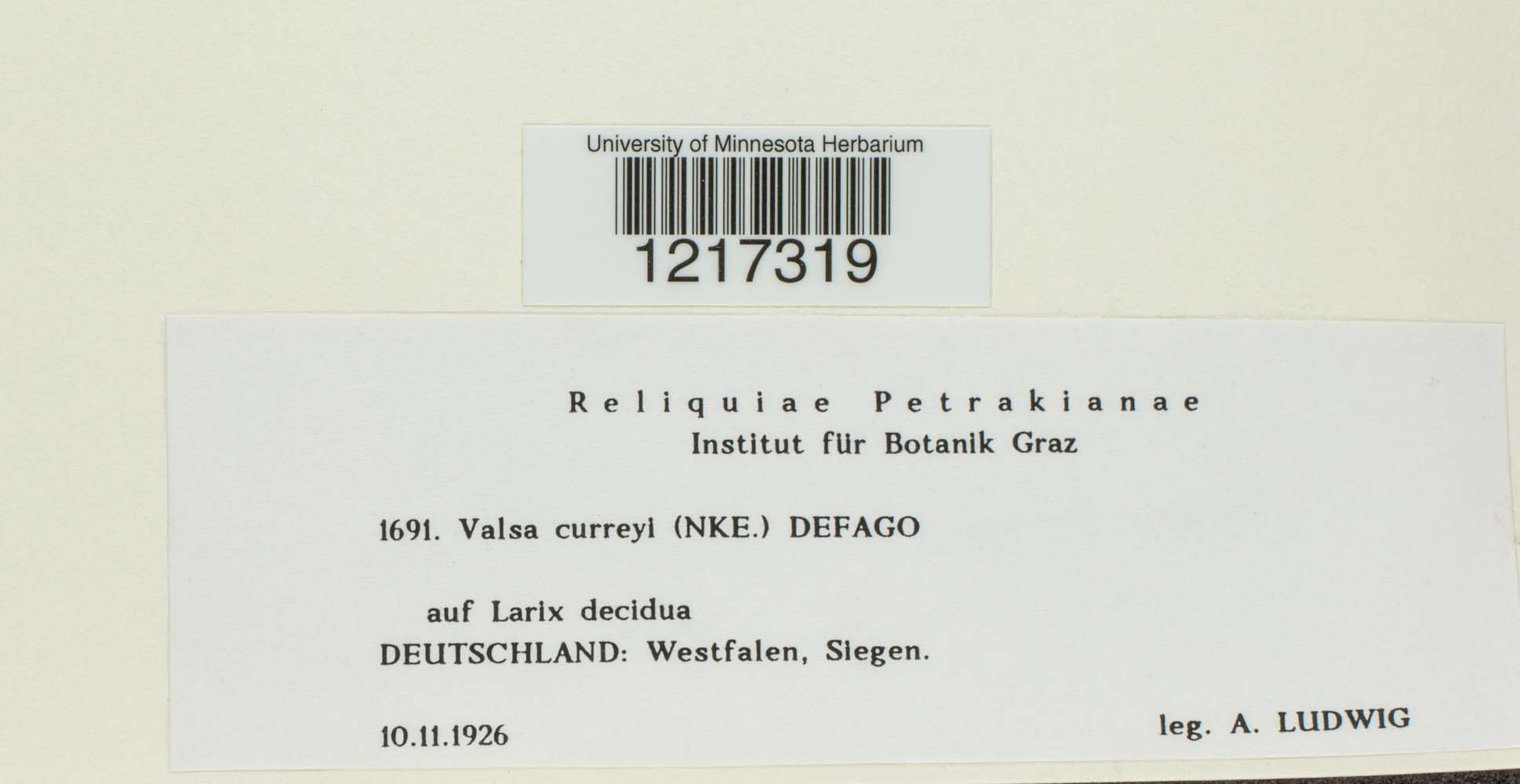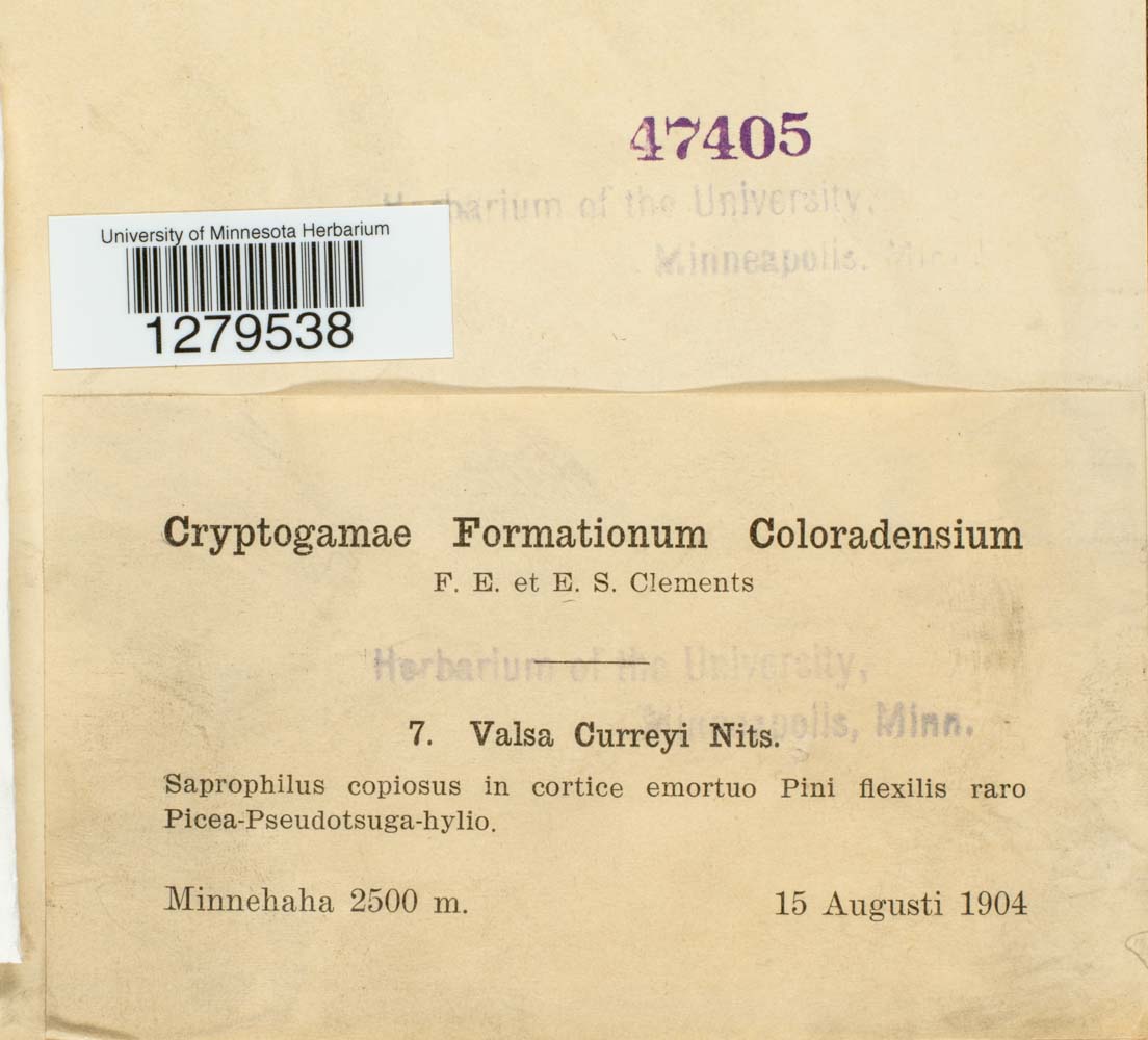 Sporen: Schläuche keulenförmig, sitzend, 68—76 µm lang, 8—9 fx breit, achtsporig. Sporen unordentlich zweireihig, zylindrisch, gebogen oder gerade, 12—16 µm lang, 2,5—3 µm breit, farblos. Konidienfrüchte (Cytospora Curreyi Sacc.) vielkammerig, mit zahlreich strahlig angeordneten Fächern und einfacher, auf weisslicher Scheibe vortretender Mündung. Konidien zylindrisch, gebogen, 3—5 µm lang, 1 µm breit.