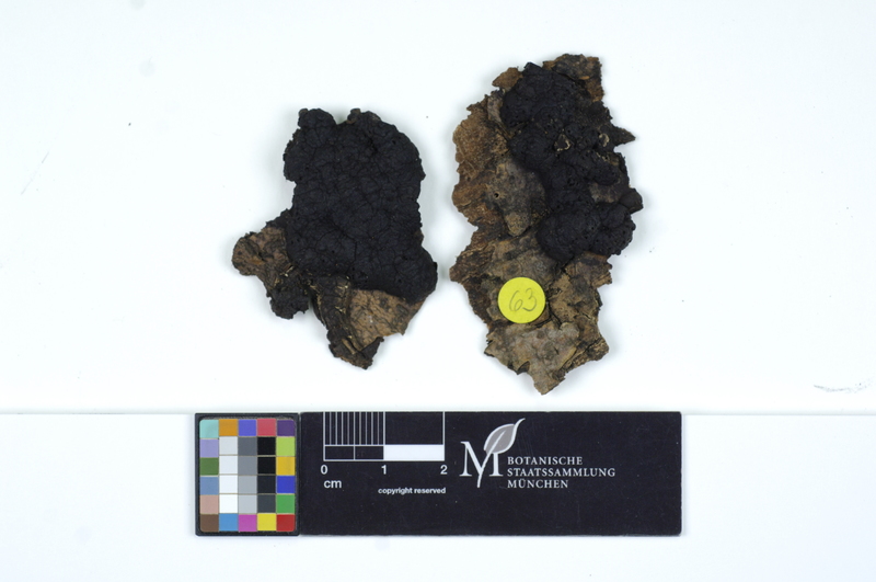 Fruchtkörper: Stroma auf der Oberfläche des Holzes, die es in weiter Ausdehnung schwärzt, mehr oder weniger ausgebreitet, ziemlich dick, meist streifenartig langgestreckt, oft unregelmässig und unterbrochen, braun glanzlos, mitunter grau bereift, scheinbar aus den mehr oder weniger dichtstehenden Perithecien gebildet. Diese sind ziemlich gross, kugelig, am Scheitel abgerundet, frei mit kleiner Papille versehen, meist zu zwei bis sechs zu kleinen Gruppen vereinigt, seltener ganz einzeln stehend.