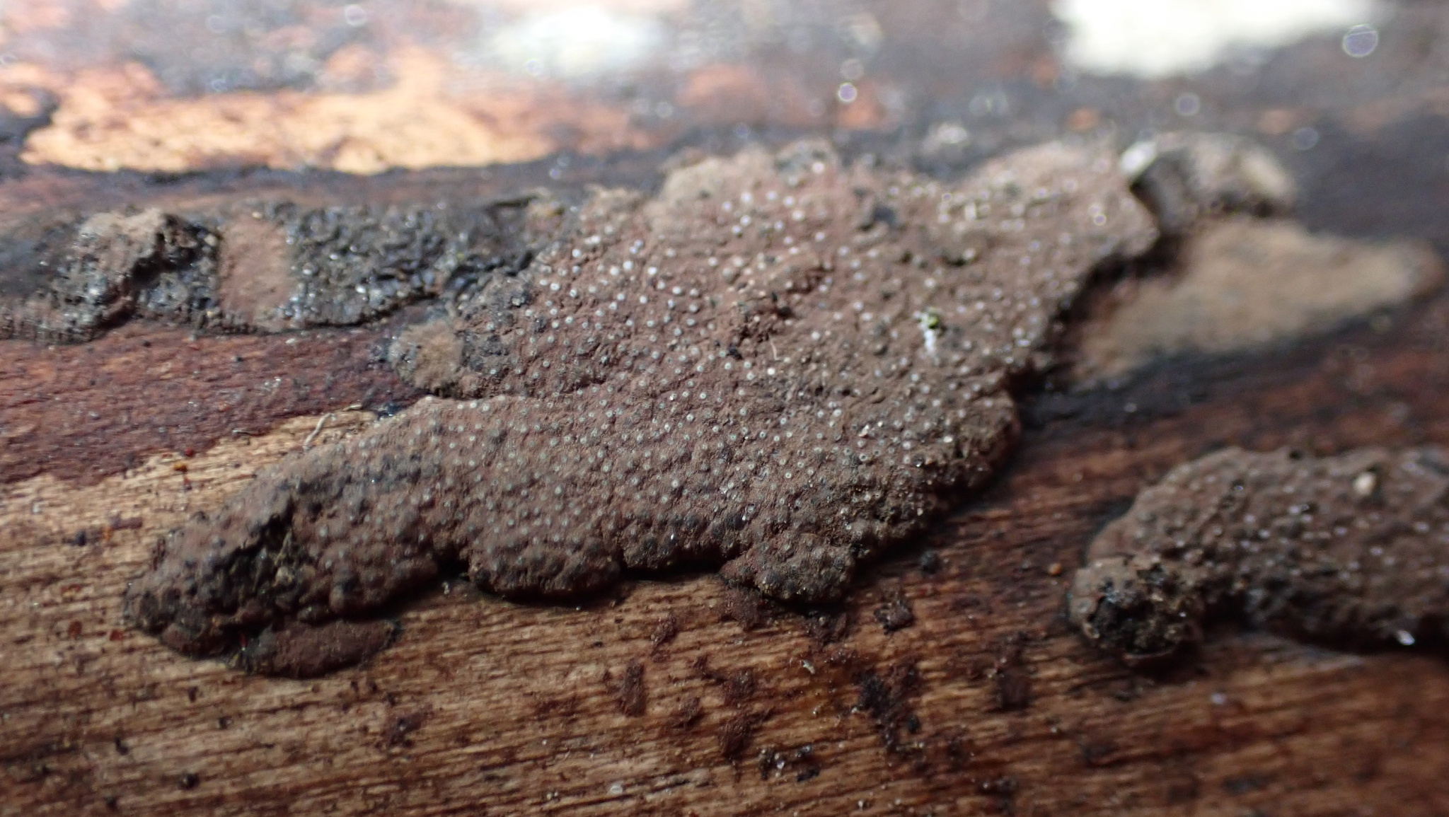 Fruchtkörper: Stromata auf dem nackten Holze, seltener auf Rinde oberflächlich, fleckenartig ausgebreitet, klein, oft fast halbkugelig, meist aber dick polsterförmig, mit steilen Rändern, auf Holz meist langgestreckt, oval bis elliptisch, 3—12 mm lang, reihenweise angeordnet oder zu unregelmässigen, kleineren Gruppen vereinigt und zusammenfliessend, auf Rinde gewöhnlich grösser, 1—2,5 cm lang, 0,5-1 cm breit, oft zusammenfliessend zu unregelmässigen Krusten, rost- und purpurbraun, später schwärzlich. Perithecien ein-, seltener mehrreihig, dicht gelagert, eiförmig oder fast kugelig, durch gegenseitigen Druck oft abgeplattet und zusammengedrückt, bald vollständig eingesenkt, wodurch die Stroinaoberfläche von den grübehenförmig vertieften Mündungen siebartig durchbohrt erscheint, bald etwas vorragend mit genabelten Mündungen.